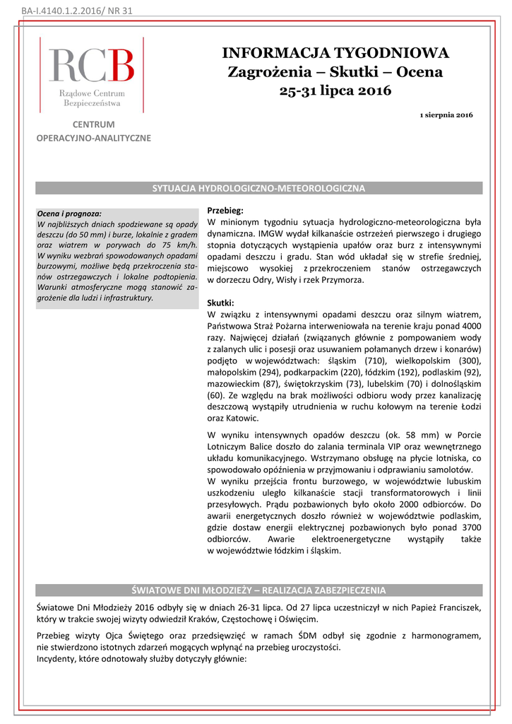 BA-I.4140.1.2.2016/ NR 31 INFORMACJA TYGODNIOWA Zagrożenia – Skutki – Ocena Ło podpisanie 25-31 lipca 2016 1 sierpnia 2016 CENTRUM OPERACYJNO-ANALITYCZNE SYTUACJA HYDROLOGICZNO-METEOROLOGICZNA Ocena i prognoza: W najbliższych dniach spodziewane są opady deszczu (do 50 mm) i burze, lokalnie z gradem oraz wiatrem w porywach do 75 km/h. W wyniku wezbrań spowodowanych opadami burzowymi, możliwe będą przekroczenia stanów ostrzegawczych i lokalne podtopienia. Warunki atmosferyczne mogą stanowić zagrożenie dla ludzi i infrastruktury. Przebieg: W minionym tygodniu sytuacja hydrologiczno-meteorologiczna była dynamiczna. IMGW wydał kilkanaście ostrzeżeń pierwszego i drugiego stopnia dotyczących wystąpienia upałów oraz burz z intensywnymi opadami deszczu i gradu. Stan wód układał się w strefie średniej, miejscowo wysokiej z przekroczeniem stanów ostrzegawczych w dorzeczu Odry, Wisły i rzek Przymorza. Skutki: W związku z intensywnymi opadami deszczu oraz silnym wiatrem, Państwowa Straż Pożarna interweniowała na terenie kraju ponad 4000 razy. Najwięcej działań (związanych głównie z pompowaniem wody z zalanych ulic i posesji oraz usuwaniem połamanych drzew i konarów) podjęto w województwach: śląskim (710), wielkopolskim (300), małopolskim (294), podkarpackim (220), łódzkim (192), podlaskim (92), mazowieckim (87), świętokrzyskim (73), lubelskim (70) i dolnośląskim (60). Ze względu na brak możliwości odbioru wody przez kanalizację deszczową wystąpiły utrudnienia w ruchu kołowym na terenie Łodzi oraz Katowic. W wyniku intensywnych opadów deszczu (ok. 58 mm) w Porcie Lotniczym Balice doszło do zalania terminala VIP oraz wewnętrznego układu komunikacyjnego. Wstrzymano obsługę na płycie lotniska, co spowodowało opóźnienia w przyjmowaniu i odprawianiu samolotów. W wyniku przejścia frontu burzowego, w województwie lubuskim uszkodzeniu uległo kilkanaście stacji transformatorowych i linii przesyłowych. Prądu pozbawionych było około 2000 odbiorców. Do awarii energetycznych doszło również w województwie podlaskim, gdzie dostaw energii elektrycznej pozbawionych było ponad 3700 odbiorców. Awarie elektroenergetyczne wystąpiły także w województwie łódzkim i śląskim. ŚWIATOWE DNI MŁODZIEŻY – REALIZACJA ZABEZPIECZENIA Światowe Dni Młodzieży 2016 odbyły się w dniach 26-31 lipca. Od 27 lipca uczestniczył w nich Papież Franciszek, który w trakcie swojej wizyty odwiedził Kraków, Częstochowę i Oświęcim. Przebieg wizyty Ojca Świętego oraz przedsięwzięć w ramach ŚDM odbył się zgodnie z harmonogramem, nie stwierdzono istotnych zdarzeń mogących wpłynąć na przebieg uroczystości. Incydenty, które odnotowały służby dotyczyły głównie: INFORMACJA TYGODNIOWA 25-31.07.2016 zderzenia dwóch autobusów, w których podróżowali pielgrzymi z Włoch i Francji. Hospitalizowano 4 osoby (obrażenia nie zagrażające życiu i zdrowiu) – Kraków (25.07), zatoru w rejonie Dworca Głównego PKP oraz pobliskich przystanków tramwajowych i autobusowych, w wyniku którego doszło do kilkudziesięciu omdleń. Interweniowały zespoły ratownictwa medycznego. 6 osób odwieziono do szpitalnych oddziałów ratunkowych, 28 udzielono pomocy na miejscu. W rejon zdarzenia skierowano dodatkowe patrole policji i zastępy PSP – Kraków (26.07), zerwania hamulca awaryjnego w pociągu relacji Oświęcim-Tarnów pomiędzy stacjami Gaj-Rudzice (woj. małopolskie). W wyniku działania doszło do gwałtownego zatrzymania składu i niegroźnych kontuzji 10 pasażerów, którym udzielono pomocy medycznej – Kraków (26.07), naruszenia ograniczeń ruchu powietrznego przez mały cywilny statek (awionetka). Pilot statku powietrznego (obywatel Rosji) na teren RP wleciał z Czech i kierował się do Radomia na zawody lotnicze rozpoczynające się 4 sierpnia. Samolot został sprawdzony pod kątem pirotechnicznym – Częstochowa (29.07), dwóch zdarzeń/zagrożeń sanitarno-epidemiologicznych, które miały bezpośredni związek z pobytem pielgrzymów oraz ich udziałem w Światowych Dniach Młodzieży, kilkunastu informacji o ujawnieniu podejrzanych pakunków. Po rozpoznaniu pirotechnicznym nie stwierdzono materiałów wybuchowych. Wszystkie służby i instytucje realizowały zadania wynikające z obowiązujących na całym terytorium RP stopni alarmowych ALFA i BRAVO CRP. Nie odnotowano informacji o zakłóceniach w ciągłości działania infrastruktury krytycznej resortu spraw wewnętrznych i administracji. Ponadto, służby informatyczne Lotniska Chopina poinformowały o trzech próbach ataku na lotniskowe systemy teleinformatyczne, które zostały zablokowane przez urządzenia bezpieczeństwa PPL. Incydenty zostały zgłoszone do CERT. Zgodnie z Decyzją Prezesa Urzędu Lotnictwa Cywilnego i Komendanta Głównego SG wprowadzono dodatkowe środki ochrony w Porcie Lotniczym im. Fryderyka Chopina w Warszawie, Kraków-Balice i Katowice-Pyrzowice. W dniach 25 lipca – 1 sierpnia w Rządowym Centrum Bezpieczeństwa całodobowo pracował Zespół Roboczy Rządowego Zespołu Zarządzania Kryzysowego powołany zarządzeniem Przewodniczącej RZZK Prezes Rady Ministrów Pani Beaty Szydło. Zespół monitorował sytuację, utrzymywał stały kontakt ze sztabami policyjnymi, tj. Sztabem Dowódcy Operacji Policyjnej „Przymierze” oraz Sztabami Dowódców Podoperacji „Rubin” i „Katowice”. SZACUNKOWE STRATY W ROLNICTWIE – AKTUALIZACJA Według danych przekazanych przez 165 komisji szacujących straty w rolnictwie, klęską zostało dotkniętych łącznie 84 410 ha upraw w 10 093 gospodarstwach, a szacunkowa wartość strat wynosi około 86,4 mln zł. Straty spowodowane suszą: województwo wielkopolskie – łącznie 11 000 ha upraw (w 1 248 gospodarstwach, szacunkowa wartość strat – ok. 10,1 mln zł), województwo zachodniopomorskie – łącznie 3 872 ha upraw (w 73 gospodarstwach, szacunkowa wartość strat – ok. 2,3 mln