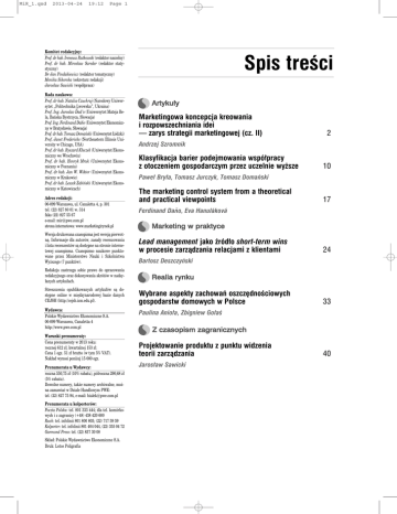 MiR_1.qxd 2013-04-24 19:12 Page 1 Komitet redakcyjny: Prof. dr hab. Ireneusz Rutkowski (redaktor naczelny) Prof. dr hab. Mirosław Szreder (redaktor statystyczny) Dr Jan Pindakiewicz (redaktor tematyczny) Monika Sikorska (sekretarz redakcji) Jarosław Sawicki (współpraca) ^ ^ Adres redakcji: 00-099 Warszawa, ul. Canaletta 4, p. 301 tel. (22) 827 80 01 w. 314 faks (22) 827 55 67 e-mail: [email protected] strona internetowa: www.marketingirynek.pl Wersja drukowana czasopisma jest wersją pierwotną. Informacje dla autorów, zasady recenzowania i lista recenzentów są dostępne na stronie internetowej czasopisma. Czasopismo naukowe punktowane przez Ministerstwo Nauki i Szkolnictwa Wyższego (7 punktów). Redakcja zastrzega sobie prawo do opracowania redakcyjnego oraz dokonywania skrótów w nadsyłanych artykułach. Streszczenia opublikowanych artykułów są dostępne online w międzynarodowej bazie danych CEJSH (http://cejsh.icm.edu.pl). Wydawca: Polskie Wydawnictwo Ekonomiczne S.A. 00-099 Warszawa, Canaletta 4 http://www.pwe.com.pl Warunki prenumeraty: Cena prenumeraty w 2013 roku: rocznej 612 zł, kwartalnej 153 zł. Cena 1 egz. 51 zł brutto (w tym 5% VAT). Nakład wynosi poniżej 15 000 egz. Prenumerata u Wydawcy: roczna 550,75 zł (10% rabatu), półroczna 290,68 zł (5% rabatu). Dowolne numery, także numery archiwalne, można zamawiać w Dziale Handlowym PWE: tel. (22) 827 75 94, e-mail: [email protected] Prenumerata u kolporterów: Poczta Polska: tel. 801 333 444; dla tel. komórkowych i z zagranicy (+48) 438 420 600 Ruch: tel. infolinii 801 800 803; (22) 717 59 59 Kolporter: tel. infolinii 801 404 044, (22) 355 04 72 Garmond Press: tel. (22) 837 30 08 Skład: Polskie Wydawnictwo Ekonomiczne S.A. Druk: Lotos Poligrafia Artykuły Marketingowa koncepcja kreowania i rozpowszechniania idei — zarys strategii marketingowej (cz. II) 2 Andrzej Szromnik Klasyfikacja barier podejmowania współpracy z otoczeniem gospodarczym przez uczelnie wyższe 10 Paweł Bryła, Tomasz Jurczyk, Tomasz Domański The marketing control system from a theoretical and practical viewpoints 17 ^ Rada naukowa: Prof. dr hab. Natalia Czuchraj (Narodowy Uniwersytet ,,Politechnika Lwowska”, Ukraina) Prof. Ing. Jaroslav Dad’o (Uniwersytet Mateja Bela, Bańska Bystrzyca, Słowacja) Prof. Ing. Ferdinand Dano (Uniwersytet Ekonomiczny w Bratysławie, Słowacja) Prof. dr hab. Tomasz Domański (Uniwersytet Łódzki) Prof. Janet Fredericks (Northeastern Illinois University w Chicago, USA) Prof. dr hab. Ryszard Kłeczek (Uniwersytet Ekonomiczny we Wrocławiu) Prof. dr hab. Henryk Mruk (Uniwersytet Ekonomiczny w Poznaniu) Prof. dr hab. Jan W. Wiktor (Uniwersytet Ekonomiczny w Krakowie) Prof. dr hab. Leszek Żabiński (Uniwersytet Ekonomiczny w Katowicach) Spis treści Ferdinand Dano, Eva Hanuláková Marketing w praktyce Lead management jako źródło short-term wins w procesie zarządzania relacjami z klientami 24 Bartosz Deszczyński Realia rynku Wybrane aspekty zachowań oszczędnościowych gospodarstw domowych w Polsce 33 Paulina Anioła, Zbigniew Gołaś Z czasopism zagranicznych Projektowanie produktu z punktu widzenia teorii zarządzania Jarosław Sawicki 40 MiR_1.qxd 2013-04-24 19:12 Page 2 Artykuły Andrzej Szromnik Katedra Handlu i Instytucji Rynkowych, Uniwersytet Ekonomiczny w Krakowie Marketingowa koncepcja kreowania i rozpowszechniania idei — zarys strategii marketingowej (cz. II) Adresaci idei — podmioty komunikacji marketingowej 1 oraz oddziaływania Proces kształtowania nowych idei, ich komunikowania oraz aktywnego upowszechniania wymaga zaangażowania wielu osób oraz instytucji o różnych cechach, pozycjach społecznych oraz funkcjach. Rosnąca złożoność samych idei jako koncepcji, pomysłów i receptur, obecność licznych idei konkurencyjnych, ale także obserwowana społeczna niechęć do zmian, studiów oraz analiz (to subiektywne, indywidualne koszty ich przeprowadzenia) czynią odpowiednie działania coraz trudniejszymi, wieloskładnikowymi oraz wielopodmiotowymi2. Coraz częściej realizacja założonych celów końcowych uzależniona jest od: z profesjonalizmu działań, z właściwej harmonizacji i częstości przedsięwzięć, z rodzaju oraz liczby podmiotów partnerskich i wspomagających, z liczby zaangażowanych osób oraz ich pozycji społecznej (miejsca w lokalnych i regionalnych sieciach wpływu), z sprawności oraz dynamiki działań. Zasygnalizowane złożone, różnorodne i dynamicznie zmieniające się warunki przygotowania oraz realizacji przedsięwzięć marketingowych przyczyniają się do konieczności korzystania z pomocy 1 Jest to część druga artykułu, który ukazał się w numerze 4 „Marketingu i Rynku”. 2 B. Iwankiewicz-Rak, Marketing w organizacjach pozarządowych — obszary zastosowań, Wyd. UE, Wrocław 2011. 2 oraz pośrednictwa instytucji o wyspecjalizowanym zakresie funkcji. Specjalistyczne, profesjonalne organizacje przejmują na siebie operacje wymagające specyficznych, wąsko określonych kompetencji w sferze marketingowego opracowywania idei, form ich przekazywania oraz aktywnego wdrażania. W ten sposób kreatorzy idei, ich inicjatorzy — twórcy wyręczani są przez odpowiednio przygotowane organizacje marketingowe, medialne, techniczne, informatyczne i eventowe o bogatym doświadczeniu i dorobku w działaniach na rynku idei3. W kanałach przekazu idei, czyli zbiorze podmiotów uczestniczących w procesie przekazu idei, poczynając od ich twórców, a kończąc na ich adresatach, wyróżnić można: z osoby fizyczne zaangażowane w kampanie marketingowe, w tym członkowie, aktywiści, zwolennicy, na różnych etapach ich realizacji, z agencje marketingowe i informacyjne, z pracownie projektowe, artystyczne, muzyczne itp., z redakcje medialne — prasa, radio, telewizja (media-operatorzy), z firmy usług internetowych, z organizacje branżowe — wiodące dla określonej idei, z organizatorzy wyspecjalizowanych eventów. W ten sposób, uwzg