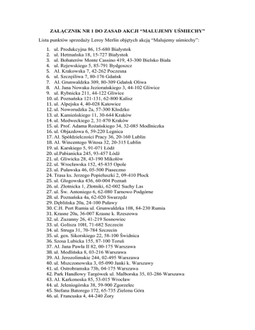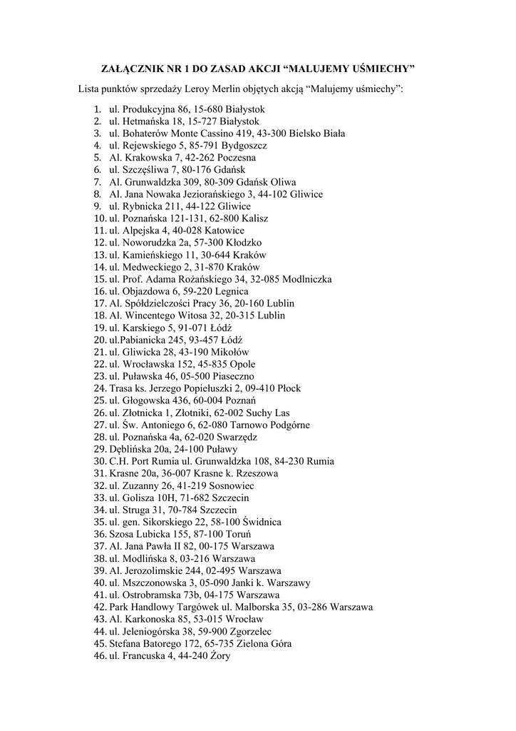 ZAŁĄCZNIK NR 1 DO ZASAD AKCJI “MALUJEMY UŚMIECHY” Lista punktów sprzedaży Leroy Merlin objętych akcją “Malujemy uśmiechy”: 1. ul. Produkcyjna 86, 15-680 Białystok 2. ul. Hetmańska 18, 15-727 Białystok 3. ul. Bohaterów Monte Cassino 419, 43-300 Bielsko Biała 4. ul. Rejewskiego 5, 85-791 Bydgoszcz 5. Al. Krakowska 7, 42-262 Poczesna 6. ul. Szczęśliwa 7, 80-176 Gdańsk 7. Al. Grunwaldzka 309, 80-309 Gdańsk Oliwa 8. Al. Jana Nowaka Jeziorańskiego 3, 44-102 Gliwice 9. ul. Rybnicka 211, 44-122 Gliwice 10. ul. Poznańska 121-131, 62-800 Kalisz 11. ul. Alpejska 4, 40-028 Katowice 12. ul. Noworudzka 2a, 57-300 Kłodzko 13. ul. Kamieńskiego 11, 30-644 Kraków 14. ul. Medweckiego 2, 31-870 Kraków 15. ul. Prof. Adama Rożańskiego 34, 32-085 Modlniczka 16. ul. Objazdowa 6, 59-220 Legnica 17. Al. Spółdzielczości Pracy 36, 20-160 Lublin 18. Al. Wincentego Witosa 32, 20-315 Lublin 19. ul. Karskiego 5, 91-071 Łódź 20. ul.Pabianicka 245, 93-457 Łódź 21. ul. Gliwicka 28, 43-190 Mikołów 22. ul. Wrocławska 152, 45-835 Opole 23. ul. Puławska 46, 05-500 Piaseczno 24. Trasa ks. Jerzego Popiełuszki 2, 09-410 Płock 25. ul. Głogowska 436, 60-004 Poznań 26. ul. Złotnicka 1, Złotniki, 62-002 Suchy Las 27. ul. Św. Antoniego 6, 62-080 Tarnowo Podgórne 28. ul. Poznańska 4a, 62-020 Swarzędz 29. Dęblińska 20a, 24-100 Puławy 30. C.H. Port Rumia ul. Grunwaldzka 108, 84-230 Rumia 31. Krasne 20a, 36-007 Krasne k. Rzeszowa 32. ul. Zuzanny 26, 41-219 Sosnowiec 33. ul. Golisza 10H, 71-682 Szczecin 34. ul. Struga 31, 70-784 Szczecin 35. ul. gen. Sikorskiego 22, 58-100 Świdnica 36. Szosa Lubicka 155, 87-100 Toruń 37. Al. Jana Pawła II 82, 00-175 Warszawa 38. ul. Modlińska 8, 03-216 Warszawa 39. Al. Jerozolimskie 244, 02-495 Warszawa 40. ul. Mszczonowska 3, 05-090 Janki k. Warszawy 41. ul. Ostrobramska 73b, 04-175 Warszawa 42. Park Handlowy Targówek ul. Malborska 35, 03-286 Warszawa 43. Al. Karkonoska 85, 53-015 Wrocław 44. ul. Jeleniogórska 38, 59-900 Zgorzelec 45. Stefana Batorego 172, 65-735 Zielona Góra 46. ul. Francuska 4, 44-240 Żory