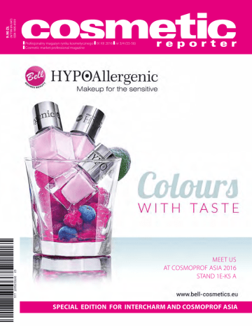 (W TYM 8% VAT) ISSN 1895-6939 9.90 ZŁ Profesjonalny magazyn rynku kosmetycznego IX-XII 2016 nr 3/4 (55-56) Cosmetic market professional magazine meet us at cosmoprof asia 2016 STAND 1E-K5 A SPECIAL EDITION for intercharm and cosmoprof asia contents/w numerze FAIRS/TARGI POLISH NATIONAL PAVILLION AT INTERCHARM /POLSKI PAWILON NARODOWY NA TARGACH INTERCHARM 10 POLISH NATIONAL PAVILLION AT COSMOPROF ASIA /POLSKI PAWILON NARODOWY NA TARGACH COSMOPROF ASIA LOOK & BEAUTY VISION 2015 COSMOPROF ASIA 2016 COSMOPROF & COSMOPACK 2016 – Post Show Release BEAUTY EURASIA CHINA BEAUTY EXPO Дорогие покупатели и дистрибьюторы, 28 6 24 32 40 42 INTERVIEW OF THE ISSUE/WYWIAD NUMERU PATENTS • JADWIGA EMILEWICZ FROM THE MINISTRY OF DEVELOPMENT/ PATENTY • JADWIGA EMILEWICZ Z MINISTERSTWA ROZWOJU Дорогие производители, 52 MARKETS/RYNKI EXPORT OF POLISH COSMETICS IN 2015/ EXPORT POLSKICH KOSMETYKÓW W 2015 R. RUSSIAN COSMETIC MARKET IN 2016/ RYNEK KOSMETYCZNY W ROSJI W 2016 R. CALENDAR OD BEAUTY EVENTS 2016-2017 /KALENDARIUM TARGÓW KOSMETYCZNYCH 2016-2017 FUNDS/ DOTACJE TIME FOR EXPORT/ CZAS NA EKSPORT NEWS/Z KRAJU I ZE ŚWIATA Приглашаем все компании заинтересованы представить свое предложение на польском и зарубежных рынках к сотрудничеству с нами. Надеемся участие в выставках принесет вам удачу и новые возможности развития. 4 Anna Godek • Главный редактор 21 Dear Buyers, Distributors, 22 62 SPONSORING SPONSORSHIP AGREEMENT – INTERVIEW WITH A LAWYER MATEUSZ FONFARA/ UMOWA SPONSORSKA – WYWIAD Z PRAWNIKIEM – MATEUSZEM FONFARĄ Мы передаем в ваши руки специальный выпуск журнала Cosmetic Reporter, в котором вы найдете два обширные каталогa польских экспонентов, принимающих участие в выставках interCHARM и Cosmoprof Asia. Они становят превосходный источник информации относительно широкой гаммы, предлагаемой польскими компаниями, косметики а также показывают огромные возможности этой отрасли в Польше. Приглашаем посетить польские стенды и ознакомиться с тем, что Creatively made in Poland и что характеризуется наилучшим соотношением между качеством и ценой. We are consigning you a special edition of Cosmetic Reporter, which contains two extensive catalogues of Polish exhibitors at interCHARM (Moscow) and Cosmoprof Asia (Hong Kong). They are a source of knowledge about the wide range of products offered by Polish companies and at the same time they show the huge potential of Polish cosmetic branch. Visit us and get know with the cosmetics Creatively made in Poland – the best ratio between quality and price. We also encourage you to get know with a brief report about Polish cosmetic market, which will give you a fresh look on it. Dear Producers, 54 46 We are inviting all the companies which want to present their offer on the worldwide cosmetic market to cooperate with our magazine. We hope that the fairs are very fruitful for all of you! Anna Godek • Chief Editor TECHNOLOGIES/TECHNOLOGIE 64 PACKAGING/OPAKOWANIA 70 COSMETOLOGY/ KOSMETOLOGIA72 MARCH 2017 WORLD BEAUTY TRENDS 2016-2017 /ŚWIATOWE TRENDY KOSMETYCZNE 2016-201776 17 - 20 Organiser - BolognaFiere Cosmoprof S.p.a. - Milan - Italy ph. +39.02.796.420 - fax +39.02.795.036 - [email protected] company of COSMOPACK 16-19 COSMOPRIME 16-19 BOLOGNA (ITALY) F A I R in cooperation with 2 D I S T R I C T WWW.COSMO PR OF.C OM cosmetic reporter IX-XII 2016POLCHARM, ANNA GODEK, e-mail: [email protected], mob: +48 502 22 90 90, www.polcharm.com.pl cooperant in poland: POLISH COSMETIC HIGHLIGHTS 2016-2017 /POLSKIE HITY KOSMETYCZNE 2016-2017 7 POSITIVELY FREAKY /POZYTYWNIE ZAKRĘCENI DOROTA SOSZYŃSKA ABOUT US/ O NAS 80 90 92 Szanowni Państwo, Oddajemy w Państwa ręce kolejne wydanie Cosmetic Reportera, a w nim aktualny i pełny raport na temat eksportu polskich kosmetyków w 2015 roku a także subiektywny ranking trendów kosmetycznych w Polsce i na Świecie w 2016 roku. Zachęcamy do zapoznania się z rubryką DOTACJE, w której znajdą Państwo informacje na temat trwających aktualnie konkursów. Zapraszamy także do lektury wywiadu z wiceminister Jadwigą Emilewicz na temat nowego systemu rejestracji znaków towarowych w Polsce. Jak zwykle wiele ciekawych informacji znajdą Państwo w naszych stałych rubrykach Technologie, Opakowania i Kosmetologia. Mamy nadzieję, że nasza nowa rubryka – Pozytywnie Zakręceni, poświęcona osobom z branży kosmetycznej o nietypowych pasjach, spotka się z miłym przyjęciem. Zachęcamy także Państwa do przesyłania swoich zgłoszeń. Anna Godek • Redaktor Naczelna cosmetic reporter IX-XII 2016 3 MARKETS MARKETS TABLE 2 Export of Polish cosmetics in 2015 Value Value Dynamics Dynamics Wartość Wartość Dynamika Dynamika in milions in milions % w milionach zł; PLN w milionach zł; PLNw mln in zł;milions 2015PLNw % zł;in2015 2015 2014 2015 vs 2014 2015 2014 vs. 2015 2014vs 2014 vs. 2014 Ethereal oils Olejki eteryczne Odoriferous mixtures Mieszaniny substancji zapachowych Perfume andi wody eau de toaletowe toilettes Perfumy Decorative/make-up and skin carei malowania products Preparaty do upiększania oraz preparaty do 15,7 174,3 1 383,0 4 200,0 5,0 129,2 1 216,8 3 860,5 10,7 45,2 166,2 339,5 216% 35% 14% 9% Hair care products Preparaty do włosów Oral care Preparaty do higieny zębów, jamy ustnej Preparaty do golenia, dezodoranty, kąpieli, depilatory Shaving preparation, deodorants