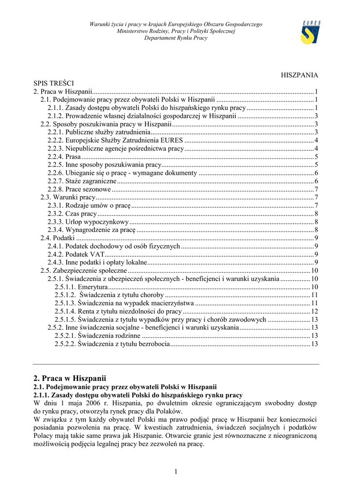 Warunki życia i pracy w krajach Europejskiego Obszaru Gospodarczego Ministerstwo Rodziny, Pracy i Polityki Społecznej Departament Rynku Pracy HISZPANIA SPIS TREŚCI 2. Praca w Hiszpanii............................................................................................................................. 1 2.1. Podejmowanie pracy przez obywateli Polski w Hiszpanii ....................................................... 1 2.1.1. Zasady dostępu obywateli Polski do hiszpańskiego rynku pracy ...................................... 1 2.1.2. Prowadzenie własnej działalności gospodarczej w Hiszpanii ........................................... 3 2.2. Sposoby poszukiwania pracy w Hiszpanii ................................................................................ 3 2.2.1. Publiczne służby zatrudnienia ............................................................................................ 3 2.2.2. Europejskie Służby Zatrudnienia EURES ......................................................................... 4 2.2.3. Niepubliczne agencje pośrednictwa pracy ......................................................................... 4 2.2.4. Prasa ................................................................................................................................... 5 2.2.5. Inne sposoby poszukiwania pracy...................................................................................... 5 2.2.6. Ubieganie się o pracę - wymagane dokumenty ................................................................. 6 2.2.7. Staże zagraniczne ............................................................................................................... 6 2.2.8. Prace sezonowe .................................................................................................................. 7 2.3. Warunki pracy ........................................................................................................................... 7 2.3.1. Rodzaje umów o pracę ....................................................................................................... 7 2.3.2. Czas pracy .......................................................................................................................... 8 2.3.3. Urlop wypoczynkowy ........................................................................................................ 8 2.3.4. Wynagrodzenie za pracę .................................................................................................... 8 2.4. Podatki ...................................................................................................................................... 9 2.4.1. Podatek dochodowy od osób fizycznych ........................................................................... 9 2.4.2. Podatek VAT...................................................................................................................... 9 2.4.3. Inne podatki i opłaty lokalne .............................................................................................. 9 2.5. Zabezpieczenie społeczne ....................................................................................................... 10 2.5.1. Świadczenia z ubezpieczeń społecznych - beneficjenci i warunki uzyskania ................. 10 2.5.1.1. Emerytura .................................................................................................................. 10 2.5.1.2. Świadczenia z tytułu choroby .................................................................................. 11 2.5.1.3. Świadczenia na wypadek macierzyństwa ................................................................. 11 2.5.1.4. Renta z tytułu niezdolności do pracy ........................................................................ 12 2.5.1.5. Świadczenia z tytułu wypadków przy pracy i chorób zawodowych ........................ 13 2.5.2. Inne świadczenia socjalne - beneficjenci i warunki uzyskania ........................................ 13 2.5.2.1. Świadczenia rodzinne ............................................................................................... 13 2.5.2.2. Świadczenia z tytułu bezrobocia ............................................................................... 13 2. Praca w Hiszpanii 2.1. Podejmowanie pracy przez obywateli Polski w Hiszpanii 2.1.1. Zasady dostępu obywateli Polski do hiszpańskiego rynku pracy W dniu 1 maja 2006 r. Hiszpania, po dwuletnim okresie ograniczającym swobodny dostęp do rynku pracy, otworzyła rynek pracy dla Polaków. W związku z tym każdy obywatel Polski ma prawo podjąć pracę w Hiszpanii bez konieczności posiadania pozwolenia na pracę. W kwestiach zatrudnienia, świadczeń socjalnych i podatków Polacy mają takie same prawa jak Hiszpanie. Otwarcie granic jest równoznaczne z nieograniczoną możliwością podjęcia legalnej pracy bez zezwoleń na pracę. 1 Warunki życia i pracy w krajach Europejskiego Obszaru Gospodarczego Ministerstwo Rodziny, Pracy i Polityki Społecznej Departament Rynku Pracy Po przyjeździe do Hiszpanii należy dopełnić formalności meldunkowych na lokalnym posterunku policji. Należy również wystąpić o zaświadczenie o zameldowaniu, które można otrzymać w lokalnym urzędzie miasta lub gminy (Ayuntamiento) w oparciu o umowę najmu lub rachunek za jedną ze stałych opłat mieszkaniowych (na nasze nazwisko) lub zaświadczenie od właściciela mieszkania o zakwaterowaniu. Meldunek zapewnia korzystanie z prawa do bezpłatnej opieki zdrowotnej, udziału w wyborach lokalnych i do Parlamentu Europejskiego. Należy uzyskać numer identyfikacji cudzoziemca NIE (Número de identificación deExtranjeros), który otrzymuje się na komisariatach policji zajmującymi się wydawaniem dokumentacji dla cudzoziemców (Więcej informacji: www.interior.gob.es oraz www.euroresidentes.com/inmigracion/numero-de-identificacion-de-extranjeros.htm) W tym celu musimy posiadać ważny paszport 
