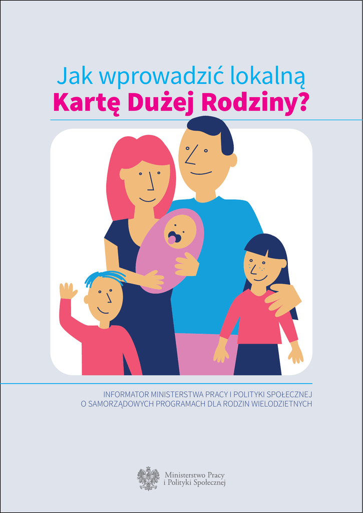 Jak wprowadzić lokalną Kartę Dużej Rodziny? INFORMATOR MINISTERSTWA PRACY I POLITYKI SPOŁECZNEJ O SAMORZĄDOWYCH PROGRAMACH DLA RODZIN WIELODZIETNYCH KARTA DUŻEJ RODZINY: INFORMATOR DLA SAMORZĄDÓW SPIS TREŚCI Słowo wstępne ministra pracy i polityki społecznej Warto być w rodzinie – o programach dla rodzin wielodzietnych Jak wprowadzić lokalny program? Przewodnik krok po kroku Uchwała rady gminy – przykład i wzór do wykorzystania FAQ, czyli najczęściej zadawane pytania Dane statystyczne 2 3 4 5 9 12 13 MINISTERSTWO PRACY I POLITYKI SPOŁECZNEJ KARTA DUŻEJ RODZINY: INFORMATOR DLA SAMORZĄDÓW Szanowni Państwo, Wszyscy zdajemy sobie sprawę, że w rodzinach wielodzietnych trudno jest zagwarantować dzieciom kontakt z kulturą, sportem oraz edukację, które mają istotny wpływ na ich rozwój. Z tego powodu niezwykle cieszą mnie podejmowane od kilku lat inicjatywy wspierające i promujące wielodzietność w postaci samorządowych programów dla rodzin wielodzietnych. Są to doskonałe instrumenty lokalnej polityki rodzinnej umożliwiające zaspokajanie potrzeb rodzin wielodzietnych. Niewątpliwie jednym z sukcesów polityki rodzinnej byłaby możliwość korzystania przez rodziny wielodzietne z uprawnień w każdej gminie, dlatego w celu efektywniejszego wspierania wielodzietności zachęcam Państwa do ustanawiania samorządowych programów dla rodzin wielodzietnych i pozwalam sobie przekazać Państwu informator „Jak wprowadzić samorządowy program dla rodzin wielodzietnych?”. Jednocześnie chciałbym zaznaczyć, iż rozwiązanie polegające na stosowaniu ogólnopolskiej Karty Dużej Rodziny jako dokumentu potwierdzającego prawo do korzystania z wprowadzonych samorządowym programem uprawnień pozwala na pokrycie kosztów związanych z przyznaniem karty ze środków budżetu państwa oraz na zintegrowanie Karty Dużej Rodziny z kartą samorządową. W ten sposób członkowie rodzin wielodzietnych mogą korzystać na podstawie jednej karty ze zniżek wprowadzonych w ramach Karty Dużej Rodziny oraz programu samorządowego. Chciałbym również serdecznie podziękować za Państwa oddanie obowiązkom wynikającym z realizacji ustawy o Karcie Dużej Rodziny. Już ponad milion członków rodzin wielodzietnych posiada Karty Dużej Rodziny. Wynik ten nie byłby możliwy bez udziału Państwa oraz pracowników zajmujących się przyznawaniem Karty Dużej Rodziny. Państwa zaangażowanie w pracę przyczyniło się do upowszechnienia nowego instrumentu polityki rodzinnej, jakim jest Karta Dużej Rodziny, a przez to do poprawy sytuacji i wizerunku rodziny wielodzietnej. Mam nadzieję, że kolejne miesiące naszej współpracy będą równie owocne. Wspierajmy razem rodziny wielodzietne! Władysław Kosiniak-Kamysz Minister Pracy i Polityki Społecznej MINISTERSTWO PRACY I POLITYKI SPOŁECZNEJ 3 KARTA DUŻEJ RODZINY: INFORMATOR DLA SAMORZĄDÓW Warto być w rodzinie Karta Dużej Rodziny stanowi jedną z odpowiedzi na gwałtowny spadek liczby urodzeń. Jest pierwszym w Polsce ogólnokrajowym projektem, który łączy administrację państwową, samorządową i biznes w jednym celu – wspierania rodzin wielodzietnych. To rodziny wielodzietne mogą w największym stopniu przyczynić się do zastępowalności pokoleń, ale też napotykają największe trudności w zaspokajaniu potrzeb wielu członków rodziny, dlatego tak istotne jest wdrożenie instrumentów wspierających wielodzietność. Karta Dużej Rodziny zapewnia jej posiadaczom uprawnienia polegające na korzystniejszym od ogólnie obowiązującego dostępie do towarów, usług lub innych form działalności nieograniczonych terytorialnie. Tylko sam akt złożenia wniosku o Kartę jest ograniczony do gminy, w której zamieszkuje rodzina wielodzietna. Dzięki Karcie osoby z rodzin wielodzietnych mogą korzystać m.in. z ustawowych zniżek: – na przejazdy kolejowe – z 37 proc. ulgi na bilety jednorazowe oraz 49 proc. na bilety miesięczne w przypadku rodziców lub małżonków rodziców1; – w opłatach paszportowych – 75 proc. w przypadku dzieci i 50 proc. dla rodziców i małżonków rodziców; – darmowych wstępów do parków narodowych. Karta Dużej Rodziny przysługuje niezależnie od uzyskiwanych dochodów rodzinom mającym na utrzymaniu co najmniej troje dzieci: w wieku do ukończenia 18 roku życia, w wieku do ukończenia 25 roku życia, w przypadku gdy dziecko uczy się w szkole lub w szkole wyższej lub bez ograniczeń wiekowych, w przypadku dzieci legitymujących się orzeczeniem o umiarkowanym albo znacznym stopniu niepełnosprawności. Karta wydawana jest bezpłatnie każdemu członkowi rodziny wielodzietnej spełniającemu ustawowe warunki. Rodzice, przez których rozumie się także rodziców zastępczych lub osoby prowadzące rodzinny dom dziecka, mogą korzystać z karty dożywotnio, dzieci – do 18 roku życia lub do ukończenia nauki w szkole lub szkole wyższej, maksymalnie do osiągnięcia 25 roku życia. Osoby niepełnosprawne otrzymują Kartę na czas trwania orzeczenia o umiarkowanym lub znacznym stopniu niepełnosprawności. Karta przyznawana jest dzieciom umieszczonym w rodzinnej pieczy zastępczej na czas umieszczenia w danej rodzinie zastępczej lub rodzinnym domu dziecka. 1 Ustawa o Karcie Dużej Rodziny nie wprowadziła żadnych zmian w zakresie uprawnień dzieci, młodzieży i studentów do ulg ustawowych na przejazdy kolejowe, ponieważ ulgi te obowiązują już od dawna i dotyczą ulgi 37 proc. na bilety jednorazowe w przypadku dzieci i młodzieży, ulgi 51 proc. na bilety jednorazowe w przypadku studentów, ulgi 49 proc. na bilety miesięczne w przypadku dzieci i młodzieży oraz ulgi 51 proc. na bilety miesięczne w przypadku studentów. 4 Dotychczas (stan na dzień 6 lipca 2015 r.) wydano ponad 1 mln 137 tysięcy Kart Dużej Rodziny, a ponad 800 podmiotów honoruje Kartę Dużej Rodziny w ponad 7,5 tys. lokalizacji . MINISTERSTWO PRACY I POLITYKI SPOŁECZNEJ KARTA DU