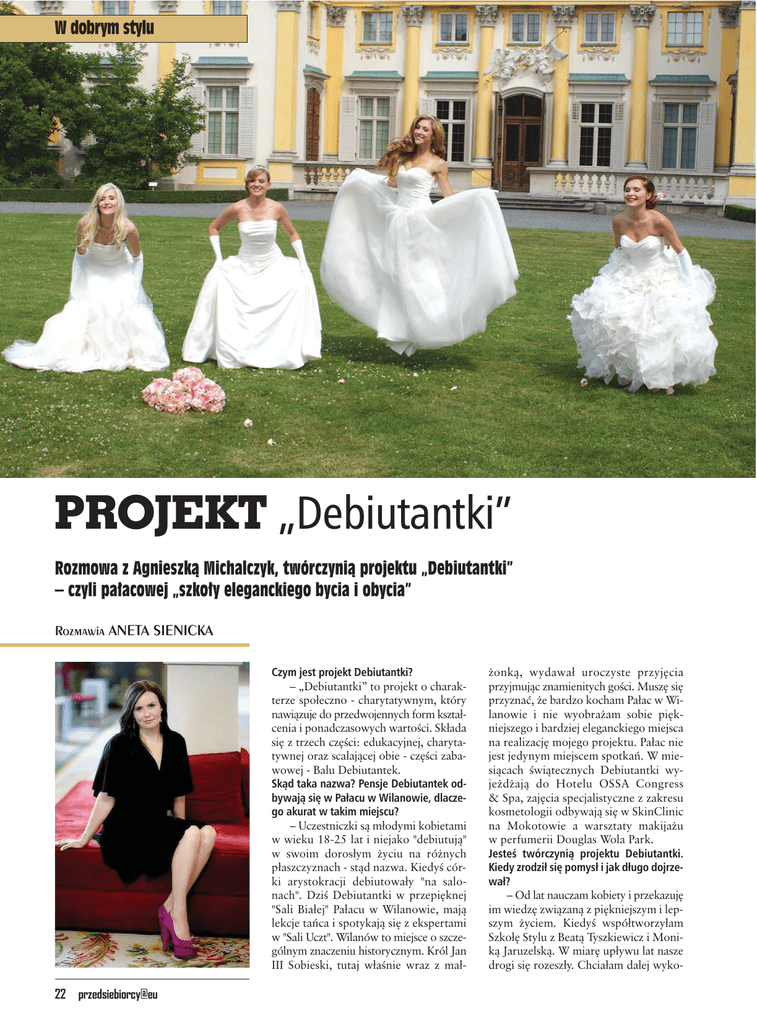 W dobrym stylu PROJEKT „Debiutantki” Rozmowa z Agnieszką Michalczyk, twórczynią projektu „Debiutantki” – czyli pałacowej „szkoły eleganckiego bycia i obycia” Rozmawia ANETA SIENICKA Czym jest projekt Debiutantki? – „Debiutantki” to projekt o charakterze społeczno - charytatywnym, który nawiązuje do przedwojennych form kształcenia i ponadczasowych wartości. Składa się z trzech części: edukacyjnej, charytatywnej oraz scalającej obie - części zabawowej - Balu Debiutantek. Skąd taka nazwa? Pensje Debiutantek odbywają się w Pałacu w Wilanowie, dlaczego akurat w takim miejscu? – Uczestniczki są młodymi kobietami w wieku 18-25 lat i niejako "debiutują" w swoim dorosłym życiu na różnych płaszczyznach - stąd nazwa. Kiedyś córki arystokracji debiutowały "na salonach". Dziś Debiutantki w przepięknej "Sali Białej" Pałacu w Wilanowie, mają lekcje tańca i spotykają się z ekspertami w "Sali Uczt". Wilanów to miejsce o szczególnym znaczeniu historycznym. Król Jan III Sobieski, tutaj właśnie wraz z mał- 22 przedsiebiorcy@eu żonką, wydawał uroczyste przyjęcia przyjmując znamienitych gości. Muszę się przyznać, że bardzo kocham Pałac w Wilanowie i nie wyobrażam sobie piękniejszego i bardziej eleganckiego miejsca na realizację mojego projektu. Pałac nie jest jedynym miejscem spotkań. W miesiącach świątecznych Debiutantki wyjeżdżają do Hotelu OSSA Congress & Spa, zajęcia specjalistyczne z zakresu kosmetologii odbywają się w SkinClinic na Mokotowie a warsztaty makijażu w perfumerii Douglas Wola Park. Jesteś twórczynią projektu Debiutantki. Kiedy zrodził się pomysł i jak długo dojrzewał? – Od lat nauczam kobiety i przekazuję im wiedzę związaną z piękniejszym i lepszym życiem. Kiedyś współtworzyłam Szkołę Stylu z Beatą Tyszkiewicz i Moniką Jaruzelską. W miarę upływu lat nasze drogi się rozeszły. Chciałam dalej wyko- W dobrym stylu rzystywać własny potencjał pedagogiczny i duże doświadczenie z pracy z kobietami i postanowiłam nauczać nieco młodsze pokolenie. Marzeniem moim było założenie tzw. "Pensji" wzorowanej na przedwojennych instytucjach kształcenia młodych panien - przekazywaniu wiedzy składającej się m.in. z: wystąpień publicznych, tańca, gracji, psychologii, savoir vivre, elegancji, obyczajowości i wielu innych umiejętności niezbędnych w życiu młodej kobiety. Pierwiastek żeński otacza mnie od zawsze. Jak wiesz, sama jestem mamą dwóch nastolatek, z których jedna jest oczywiście Debiutantką. Ważnym źródłem inspiracji byli również moi rodzice mieszkający w Stanach Zjednoczonych, którzy uczestniczyli w tzw. Balu Amarantowym, organizowanym dla Debiutantek mających polskie korzenie. W czasie kolejnego pobytu w Ameryce, spotkałam się z paniami prezes i postanowiłam zakończyć moją Pensję takim Balem - piękną "kropką nad i". Muszę dodać, że Amerykański Bal Amarantowy obchodzi swoją 75 rocznicę w lutym. Przed nami zatem wiele. Przewidujesz kolejne edycje? – Tak, na wiosnę ogłaszamy nabór dla kolejnych Debiutantek i tak co roku. Wykształcimy pokolenie młodych, świadomych kobiet, otwartych na innych ludzi i będących dobrymi również dla siebie samych. Czy aspekt dobroczynienia jest ważnym czynnikiem w projekcie? Na czym polega trzecia część projektu Debiutantki? – To część, która jest dla mnie ogromnie ważna. Zawsze zwracałam i zwracam uwagę na drugiego człowieka. Mam na swoim koncie wiele akcji charytatywnych, jak również osobistych adresowanych do młodych dziewcząt. Do końca roku pragniemy zgromadzić fundusze, które pozwolą nam na opłacenie stypendium naukowo - socjalnego im. Aleksandry Augustowej Potockiej, przewidzianego dla szczególnie uzdolnionych panien z klas maturalnych, pochodzących z rodzin o trudnych warunkach finansowych. „Stypendystki Aleksandry” nie są Debiutantkami. Takie osoby wybierane będą w ramach ogólnopolskich konkursów przeprowadzanych przez młodzieżową platformę weare.pl. Nad stypendystkami będziemy sprawować opiekę podczas trzyletniego (licencjackiego) cyklu nauczania. Z tego co wiem, projekt został bardzo ciepło odebrany w różnych środowiskach. Wiele się o nim mówi. Dużo publicznych autorytetów włączyło się w jego propagowanie i pomaga w jego realizacji. Kto zasiada w kapitule Projektu? – Mamy wspaniałą kapitułę, w której zasiadają niezwykli ludzie: Beata Tyszkiewicz, Laura Łącz, Joanna Klimas, Karolina Malinowska, Lidia Popiel, Barbara Jończyk, Sylwia Mokrysz, Paweł Jaskanis, Krzysztof Radziwiłł, Ryszard Marcińczak, Janusz Tylman, Emilian Kamiński, Richard Berkeley, Józef Krzysztof Oraczewski, Iwo Orłowski, Tomasz Stockinger i Witold Płusa. Ważną dla nas osobą, która nie tylko zasiada w kapitule, ale też włącza się czynnie w prace związane z projektem, obejmując go m.in. swoim patronatem, jest Barbara Jończyk, prezes Europejskiego Forum Przedsiębiorczości. Za wami już cztery spotkania - Pensje Debiutantek. Jakie wrażenia? Plany na kolejne spotkania? – Dziewczęta są fantastyczne. Chłoną wiedzę przekazywaną przez naszych ekspertów. Np. Beata Tyszkiewicz dała moc niezbędnych wskazówek na całe życie, a Emilian Kamiński wydobył z każdej panny głos świadomy i silny. Przed nami duże wydarzenie - majowa Pensja Debiutantek, która będzie miała zupełnie inny charakter niż dotychczasowe spotkania. Z okazji 330 rocznicy Bitwy pod Wiedniem, przygotowujemy ogromny pokaz mody, który odbędzie się na pałacowym dziecińcu już 18 maja. Nasze Debiutantki – „Marie na Królewskim Dworze”, przeniosą nas w czasy pięknych koronek królowej Marii Kazimiery, Marii Walewskiej oraz współczesnej Marysi Debiutantki. Czerwiec z kolei upłynie nam pod znakiem dobroczynienia dla tych najmniejszych. Z okazji Dnia Dziecka, Debiutantki pomogą w wystawieniu sztuki Janusza Tylmana „Krokodyl i królewna”. Kiedy