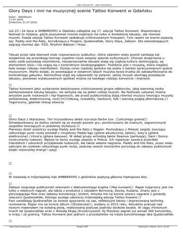 radio Toksyna FM - radio internetowe Glory Days i inni na muzycznej scenie Tattoo Konwent w Gdańsku Autor: Apfelbaum 17.07.2016. Zmieniony 21.07.2016. Już 23 i 24 lipca w AMBEREXPO w Gdańsku odbędzie się 17. edycja Tattoo Konwent. Wspomniany festiwal to miejsce, gdzie poszukiwać można inspiracji nie tylko w kontekście tatuażu, ale również muzyki. Każda edycja Tattoo Konwent zaskakuje zróżnicowanym lineupem. Tym razem na scenie pojawią się: Paddy and the Rats, Jerry’s Fingers, Quebonafide, Glory Days, Żabson. Dla odwiedzających zagrają również dje: PZG, Rhythm Baboon i Hoax. Tatuaż przez lata stanowił znak rozpoznawczy subkultur, które zdaniem wielu powoli zanikają lub wzajemnie się przenikają tworząc zupełnie nowe zespoły zjawisk kulturowych. Chociaż skojarzenia u wielu osób pozostają niezmienne, niezaprzeczalnie tatuaże stają się częścią kultury dominującej, są elementem stylu i nie wiążą się z konkretnym światopoglądem. Podobnie jest z muzyką, która niegdyś była swego rodzaju manifestem. Dzisiaj coraz rzadziej spotyka się osoby o bardzo sprecyzowanym guście muzycznym. Warto dodać, że powstająca w ostatnich latach muzyka bywa trudna do zaklasyfikowania do konkretnego gatunku. Niemożliwa staje się odpowiedź na pytanie: jakiej muzyki słuchają posiadacze tatuażu, ponieważ wytatuowanych spotkać można na każdego rodzaju koncercie i imprezie. Tattoo Konwent jako wydarzenie dedykowane zróżnicowanej grupie odbiorców, jaką stanowią osoby zainteresowane sztuką tatuażu, nie zamyka się na jeden rodzaj muzyki. Na festiwalu usłyszeć można artystów punk rockowych i hip-hopowych, ale przed publicznością stają również muzycy tworzący muzykę ambientową, elektroniczną, rocknrollową, rockabilly, hardcore, folk i szeroką pojętą alternatywę. Tegoroczny, gdański lineup otworzy Glory Days z Warszawy. Ten trzyosobowy skład rozrusza fanów tzw. ulicznego grania. Streetpunkowcy ze stolicy cenieni są za wysoki poziom gry, porównywany do znanych, zagranicznych zespołów tworzących w podobnej stylistyce. Pierwszy dzień zwieńczy występ Paddy and the Rats z Węgier. Pochodzący z Miskolc zespół, tworzący celtyckiego punk rocka powstał z inicjatywy Paddy'ego (gitara akustyczna, śpiew), Joey'a (gitara elektryczna) i Vince'a (gitara basowa). W skład grupy wchodzą także Seamus (perkusja), Sam i Sonny (instrumenty ludowe). Będzie to ósmy występ zespołu w Polsce. Ich repertuar zawiera przeróbki irlandzkich i szkockich przyśpiewek ludowych, ale także własne nagrania. Paddy and the Rats, przez wielu zaliczani do czołówki celtyckiego punk rocka, podczas swoich koncertów porywają do zabawy publiczność dzięki niezwykłej energii i pasji. W niedzielę w trójmiejskiej hali AMBEREXPO z głośników popłyną głównie hiphopowe bity. Żabson rozgrzeje publiczność utworami z debiutanckiego krążka Nie kumam. Raper kojarzony jest nie tylko z własnych nagrań, ale także z produkcji z udziałem Borixona, Deysa, Kubana. Znany jest z porywającego flow oraz zabawy konwencją i stylem. Artysta ma na koncie utwory nagrane z gwiazdą wieczoru Quebonafide, którego występ zakończy trójmiejską edycję Tattoo Kowent. Fani uwielbiają Quebonafide za świeże spojrzenie na rap, refleksyjne teksty i dopracowaną technikę rymowania. Raper ma na koncie album Ezoteryka, wydany w 2015 roku. Aktualnie pracuje nad nowym materiałem na kolejną płytę, realizowaną podczas podróży dookoła świata. W ciągu minionych trzech lat Quebonafide wraz z Wesołą Ekipą (KrzyKrzysztof, Dj Myszka) zagrali już ponad 300 koncertów, w kraju i za granicą. Tattoo Konwent jest jednym z przystanków na trasie koncertowego lata Quebonafide. http://www.toksyna.fm Kreator PDF Utworzono 2 March, 2017, 03:49 radio Toksyna FM - radio internetowe W drugi dzień konwentu w programie sceny muzycznej planowany jest także koncert rocknbluesowej grupy Jerrys Fingers. Zespół, dzięki swojej twórczości stanowiącej mieszankę rocknrolla, boogie woogie i bluesa, przeniesie publiczność do lat 50. i 60.. Istniejący od 2011 roku, 6-osobowy skład ze Śląska nie tylko interpretuje klasyki gatunku, ale tworzy własne, energetyczne kompozycje. Podczas trzech ostatnich lat wspólnego grania Jerrys Fingers wystąpili na ponad stu koncertach. Pojawili się m.in. na festiwalach Rawa Blues Festiwal, Jimiway Blues Festival, Polish Boogie Festival, RockNRoad Rockabilly Festival. Na swoim koncie mają liczne wyróżnienia. Podczas koncertu Jerrys Fingers, na scenie obok standardowych instrumentów zobaczyć można kontrabas, saksofon i harfę. Na Gdańsk Tattoo Konwent promować będą swoją pierwszą autorską płytę pod tytułem Rockin Fury. Na Tattoo Konwent nigdy nie jest cicho. W ciągu dnia, przed koncertami, w strefie wystawienniczej pracują setki maszynek do tatuowania, a przez korytarze przewija się tłum odwiedzających, korzystających z licznych wydarzeń towarzyszących konwencji. O oprawę muzyczną sceny głównej po raz kolejny zadba PZG. Wiele osób znajdzie czas na chwilę wytchnienia w strefie chill, gdzie na odwiedzających czekać będą dje: HOAX oraz Rhythm Baboon. Bilety na wydarzenie dostępne są już w internetowej przedsprzedaży, w cenie 35 za bilet jednodniowy, 45 za karnet dwudniowy i 115 zł za karnet grupowy dla 3 osób. Wejściówka VIP to koszt 200 zł. Dzieci do 12 roku życia uczestniczą w wydarzeniu za darmo. Bilety i dodatkowe informacje na temat wydarzenia znaleźć można na stronie www.gdansk.tattookonwent.pl http://www.toksyna.fm Kreator PDF Utworzono 2 March, 2017, 03:49