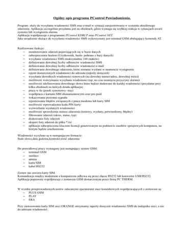 Ogólny opis programu PControl Powiadomienia. Program służy do wysyłania wiadomości SMS oraz e-mail w sytuacji zarejestrowania w systemie określonego zdarzenia. Aplikacja szczególnie przydatna jest na obiektach, gdzie wymaga się szybkiej reakcja w sytuacjach awarii systemu lub wystąpienia alarmu. Aplikacja współpracuje z programami PControl KDRCP oraz PControl NET. Jako urządzenie służące do wysyłania wiadomości SMS wykorzystany jest terminal GSM obsługujący komendy AT. Realizowane funkcje: – monitorowanie zdarzeń pojawiających się w bazie danych – zabezpieczenie hasłem (Użytkownik, hasło- pobrane z bazy danych) – wysyłanie wiadomości SMS (maksymalnie 160 znaków) – definiowanie dowolnej liczby odbiorców wiadomości SMS – definiowanie dowolnej liczby odbiorców wiadomości e-mail – definiowanie dowolnego zdarzenia, które zostanie wysłane w momencie wystąpienia – rejestr dostarczonych wiadomości do adresata (raporty doręczeń) – wysyłanie dowolnych wiadomości testowych (na dowolny numer/adres, dowolnej treści) – możliwość wstrzymania wysyłania wiadomości (np. na czas usunięcia przyczyny alarmu) – możliwość zdefiniowania dowolnego słowa które będzie dodawane do każdej wiadomości (przydatne przy kilku obiektach na których działa aplikacja) – praca w tle (pasek systemowy- tray) – współpraca z kartami SIM abonamentowymi oraz pre-paid – wskazywanie poziomu sygnału – rejestrowanie błędów związanych z praca modemu lub karty SIM – możliwość wprowadzenia kodu PIN karty – wyświetlanie wysłanych wiadomości – możliwość sprawdzenia statusu zdarzenia (testowy, wysłany, potwierdzony, błędny) – filtrowanie zdarzeń (okres, status, typ) – drukowanie listy zdarzeń – eksport listy zdarzeń do pliku *.txt – aplikacja zabezpieczona kluczem licencji generowanym na podstawie zasobów sprzętowych komputera, na którym będzie uruchomiona Wiadomości wysyłane są w następującym formacie: Stałe słowo,data godzina,kontroler,treść zdarzenia Do prawidłowej pracy wymagany jest następujący zestaw GSM: – terminal GSM – zasilacz – antena – karta SIM – kabel RS232 Zestaw nie zawiera karty SIM. Komunikacja między modemem a komputerem odbywa się przez złącze RS232 lub konwerter USB/RS232. Aplikacja poprawnie współpracuje z zestawem GSM dostarczonym przez firmę PC THERM. W wyniku przeprowadzonych testów zalecanymi operatorami sieci komórkowych współpracujących z zestawem są: – PLUS GSM – PLAY – ERA Przy zastosowaniu karty SIM sieci ORANGE otrzymamy raporty doręczeń wiadomości SMS do nadajnika sieci, a nie do adresata wiadomości.