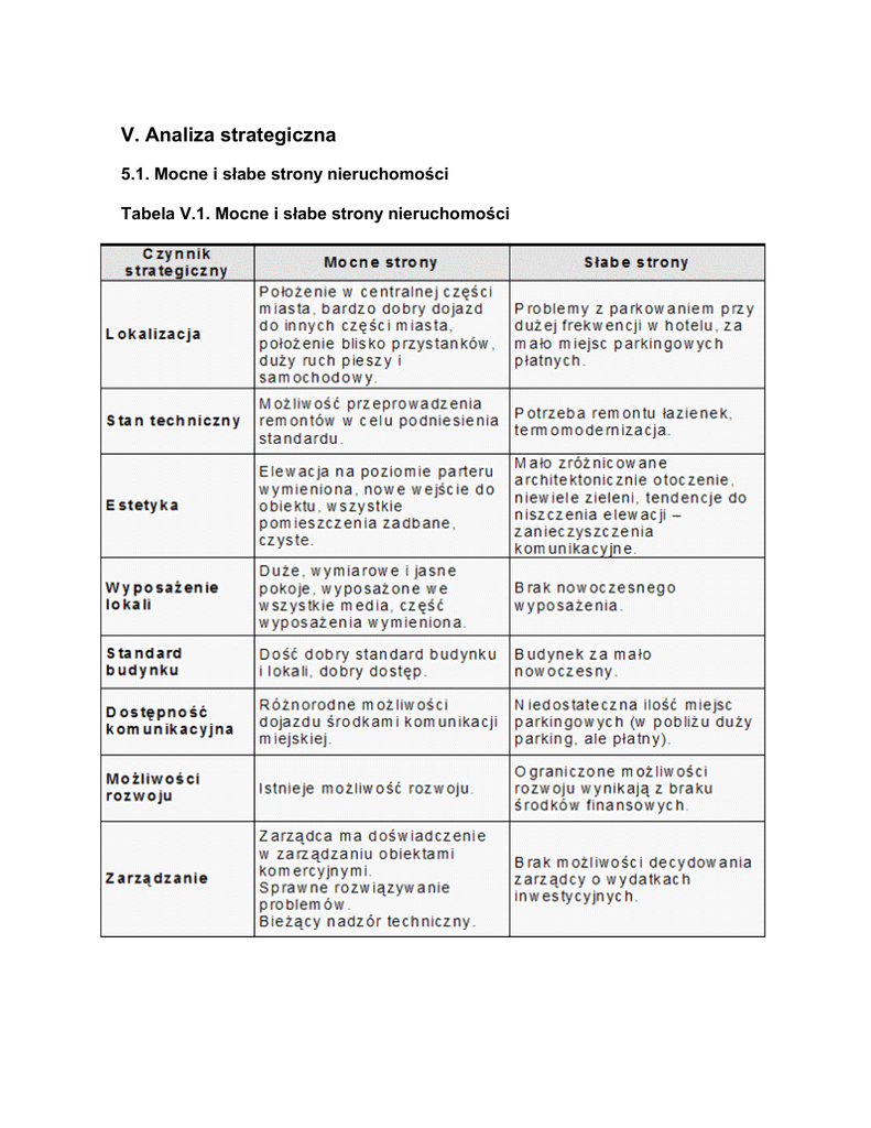 V. Analiza strategiczna 5.1. Mocne i słabe strony nieruchomości Tabela V.1. Mocne i słabe strony nieruchomości 5.2. Określenie wariantów postępowania Na podstawie przeprowadzonej analizy nieruchomości i rynku nieruchomości do rozważenia przyjęto dwa warianty: Wariant I: pozostawienie nieruchomości w obecnym stanie; przeprowadzenie tylko bieżących napraw i konserwacji w celu utrzymania nieruchomości w stanie niepogorszonym Wariant II: przeprowadzenie rozszerzonego zakresu remontów w celu podniesienia standardu nieruchomości i poprawy stanu technicznego (szacowany koszt remontu: 840 200 zł), celem osiągania większych dochodów i polepszenia standardu nieruchomości. 5.3. Analiza przyjętych wariantów postępowania 5.3.1. Ustalenie stopy dyskonta Stopę dyskontową ustalamy na podstawie oprocentowania lokat bankowych i obligacji, stopy inflacji oraz poziomu ryzyka. Zakładamy, że w ciągu 2006 roku średnia stopa procentowa lokat bankowych i obligacji wynosi 6,0%, natomiast stopa inflacji za ten okres wynosi 3,0%. I tak utrzyma się przez kolejne lata. Stopę dyskonta (rd) obliczamy ze wzoru: rd = rb x ro dla ro = rr x ri rb - realna stopa procentowa rr - ryzyko inwestowania, waga: 1,2, 1,5, 2,0 w zależności od użytego kapitału. W związku z inwestowaniem własnych kapitałów ryzyko określamy jako 1,2. ri - ryzyko indywidualne, waga: 1,1, 1,3, 1,5. Ryzyko indywidualne zależy od rozwoju rynku nieruchomości, barier popytu i kredytu. Ryzyko indywidualne jest duże i w związku z tym przyjmujemy wagę 1,5. rb = (1 + rśr) / 1 + r-inf) -1 rśr - średnia stopa oprocentowania lokat bankowych rinf - stopa inflacji rb = (1 + 0,05) / (1 + 0,02) -1 = 0,029 rb = 0,029 = 3% rd = 3% x 1,2 x 1,5 = 5,4% Przyjęto realną stopę dyskontową = 5% Ustalenie współczynnika dyskontującego - q 1 q = ------------( 1 + rd )n gdzie: n - ilość lat q1 = 1 / ( 1 + 0,05 )1 = 0,952 q2 = 1 / ( 1 + 0,05 )2 = 0,907 q3 = 1 / ( 1 + 0,05 )3 = 0,864 q4 = 1 / ( 1 + 0,05 )4 = 0,823 Rynkowe ryzyko inwestowania w tego typu nieruchomość przyjęto na poziomie ri = 1,5. Nieruchomości komercyjna typu hotelowego ma specyficzny charakter. Jej efektywne funkcjonowanie zależy od wielu czynników trudnych do zmierzenia. Tym samym trudno też przewidzieć ich oddziaływanie na popyt. Zmieniające się wciąż preferencje klientów mają duży wpływ na kształtowanie przychodów. 5.4. Założenia finansowe na okres 2006 - 2009 WARIANT I Tabela V.2. Potencjalne przychody w latach 2006 - 2009 Założenia: planowany wzrost cen o 8% w roku 2006 i o 10% w latach 2007 i 2009, przy obłożeniu 30%, spadek obłożenia miejsc hotelowych w następnych latach. Ceny najmu powierzchni użytkowej w 2006 r. na poziomie roku 2005, a w następnych latach wzrost cen o 10%. W 2009 r. spadek ilości wynajętej powierzchni użytkowej - przychody na poziomie 2008 r. Tabela V.3. Budżet operacyjny na lata 2006 - 2009 Założenia: wzrost kosztów rocznie o 8% Wartość nieruchomości w ostatnim roku prognozy została określona za pomocą wzoru: W=Dx1/R Gdzie: D - dochód netto uzyskany z nieruchomości w 2009 roku 1/R - współczynnik kapitalizacji W = 258 924,80 x 1 / 0,12 = 2 157 706 Przewidywana wartość nieruchomości na koniec 2009 wyniesie 2 157 706 zł. Tabela V.4. Wpływ ze sprzedaży nieruchomości po okresie prognozy Tabela V.5. Przepływy pieniężne cash-flow Wskaźniki rentowności gotówkowej 114 943,48 /1 491 126 = 7,7 % Wskaźnik określa, że stopa zwrotu na kapitałach łącznych wynosi7,7 %. WARIANT II Tabela V.6. Prognoza przychodów w latach 2006 - 2009 W związku ze znaczną poprawą stanu technicznego obiektu, przyjęto: Założenia: rok 2006 z uwagi na prace remontowe, prognoza sprzedaży na poziomie roku 2005. W tatach następnych wzrost cen o 8% rocznie, przy ostrożnym wzroście obłożenia ceny najmu powierzchni użytkowej na stałym poziomie. Tabela V.7. Budżet operacyjny na lata 2006 - 2009 Założenia: wzrost kosztów w 2007 r. o 8% z uwagi na większą sprzedaż w latach następnych o 10,5%. Wartość nieruchomości w ostatnim roku prognozy. Została określona za pomocą wzoru: W= Dx1/R Gdzie: D - dochód netto uzyskany z nieruchomości w 2009 roku 1/R - współczynnik kapitalizacji W = 1 036 243,30 x 1 / 0,12 = 8 635 360,83 Przewidywana wartość nieruchomości na koniec 2009 wyniesie 8 635 360 zł. Tabela V.8. Wpływ ze sprzedaży nieruchomości po okresie prognozy Tabela V.9. Przepływy pieniężne cash-flow Wskaźnik bieżącej rentowności kapitałów łącznych 622 127,97/5 967 639= 10,42% Wskaźnik określa, że stopa zwrotu na kapitałach łącznych wynosi 10,42%. Porównując wariant I z wariantem II można zauważyć, że przepływy pieniężne w wariancie I są wyższe niż w wariancie II. W przypadku zastosowania wariantu II należy przypuszczać, że w następnych latach po okresie analizy wariant ten będzie przynosił nadal dochody. Ujemny wynik dochodów w pierwszym roku prognozy będzie pokryty z funduszu remontowego za rok następny (za zgodą właścicieli, jest to niewielka kwota).