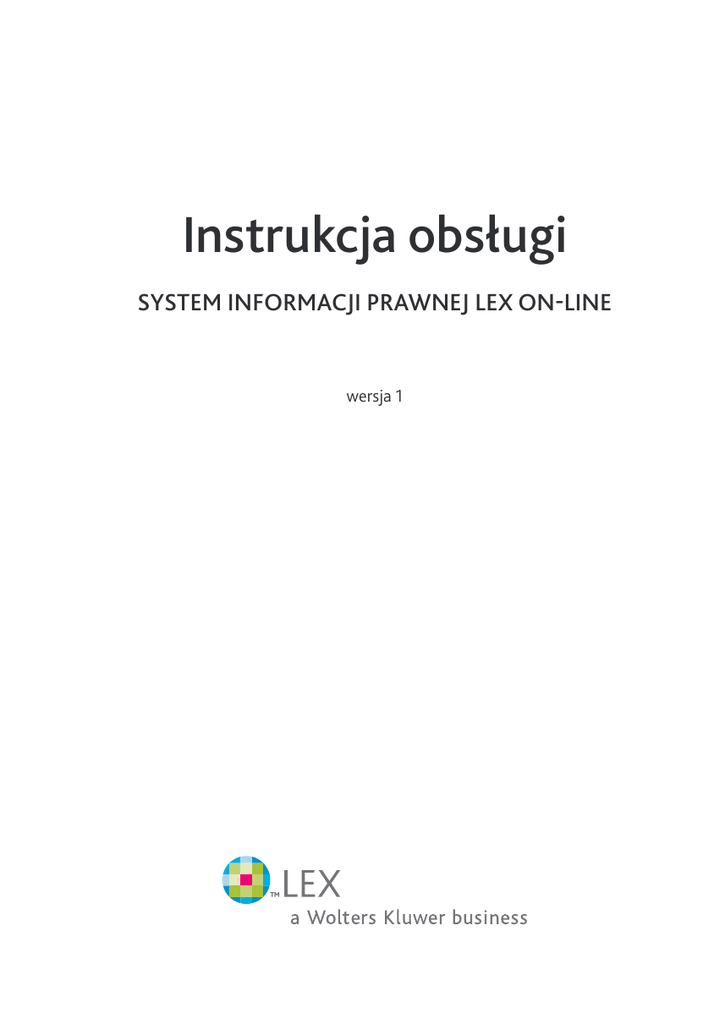 Instrukcja obsługi SYSTEM INFORMACJI PRAWNEJ LEX ON-LINE wersja 1 Instrukcja obsługi — LEX ON-LINE Spis treści 1. O PROGRAMIE ................................................................................................................................5 2. WERSJE SYSTEMU INFORMACJI PRAWNEJ LEX ON-LINE....................................................7 2.1. Wykaz wersji programu ....................................................................................................7 2.2. LEX Gamma on-line ...........................................................................................................7 2.3. LEX Sigma on-line ............................................................................................................. 8 2.4. LEX Omega on-line ........................................................................................................... 8 2.5. LEX Administracja Skarbowa on-line ............................................................................ 9 2.6. LEX dla Banków on-line ................................................................................................... 9 2.7. LEX dla Samorządu Terytorialnego on-line ................................................................. 11 2.8. LEX dla Sędziego i Prokuratora on-line ........................................................................ 11 2.9. Czasopisma on-line..........................................................................................................12 2.10. Informator Prawno-Gospodarczy on-line ...................................................................12 2.11. Komentarze on-line .........................................................................................................12 2.12. Polska Bibliografia Prawnicza PAN on-line .................................................................13 2.13. Prawo Europejskie on-line ..............................................................................................13 2.14. Prawo Miejscowe on-line ...............................................................................................13 2.15. Zamówienia Publiczne on-line ......................................................................................13 3. WYMAGANIA TECHNICZNE ....................................................................................................15 4. SIP LEX – START ............................................................................................................................16 5. PODSTAWOWE FUNKCJE ......................................................................................................... 18 5.1. Nowości ............................................................................................................................ 18 5.2. Kalendarium ......................................................................................................................19 5.3. Moja strefa ....................................................................................................................... 20 5.4. Identyfikator ................................................................................................................... 20 5.5. Roczniki ..............................................................................................................................21 5.6. Kodeksy ..............................................................................................................................21 5.7. „Szukaj” – wyszukiwanie pełnotekstowe.....................................................................21 6. BAZA WIEDZY – WYSZUKIWANIE DOKUMENTÓW........................................................... 25 6.1. Skorowidze przedmiotowe ............................................................................................ 25 6.2. Filtry dla aktów prawnych i projektów ....................................................................... 26 6.3. Filtry dla orzecznictwa.................................................................................................... 29 6.4. Filtry dla innych dokumentów wykładni .....................................................................31 6.5. Filtry dla Informatora Prawno-Gospodarczego ........................................................ 32 6.5.1. Podmiot ............................................................................................................ 32 6.5.2. Powiązania ....................................................................................................... 33 6.5.3. Publikacja .........................................................................................................34 www.LEX.com.pl 3 Instrukcja obsługi — LEX ON-LINE 7. 8. 9. 10. 11. 12. 4 6.5.4. Filtr dla MSiG-Ogłoszenia .............................................................................34 6.5.5. Filtr dla M.P. „B” i M.S. „B” ............................................................................ 35 6.5.6. Numer PKD (EKD) .......................................................................................... 36 6.6. Inne filtry........................................................................................................................... 36 6.7. Słownik .............................................................................................................................. 37 6.8. Pozostałe sposoby wyszukiwania................................................................................. 37 AKTY PRAWNE – PRACA Z DOKUMENTEM ..........................................................................40 7.1. Obowiązywanie aktów prawnych ................................................................................40 7.2. Lista aktów prawnych .................................................................................................... 42 7.3. Tekst aktu prawnego ...........................................................