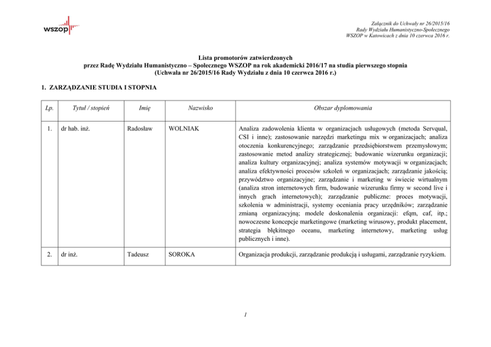 Załącznik do Uchwały nr 26/2015/16 Rady Wydziału Humanistyczno-Społecznego WSZOP w Katowicach z dnia 10 czerwca 2016 r. Lista promotorów zatwierdzonych przez Radę Wydziału Humanistyczno – Społecznego WSZOP na rok akademicki 2016/17 na studia pierwszego stopnia (Uchwała nr 26/2015/16 Rady Wydziału z dnia 10 czerwca 2016 r.) 1. ZARZĄDZANIE STUDIA I STOPNIA Lp. Tytuł / stopień Imię Nazwisko Obszar dyplomowania 1. dr hab. inż. Radosław WOLNIAK Analiza zadowolenia klienta w organizacjach usługowych (metoda Servqual, CSI i inne); zastosowanie narzędzi marketingu mix w organizacjach; analiza otoczenia konkurencyjnego; zarządzanie przedsiębiorstwem przemysłowym; zastosowanie metod analizy strategicznej; budowanie wizerunku organizacji; analiza kultury organizacyjnej; analiza systemów motywacji w organizacjach; analiza efektywności procesów szkoleń w organizacjach; zarządzanie jakością; przywództwo organizacyjne; zarządzanie i marketing w świecie wirtualnym (analiza stron internetowych firm, budowanie wizerunku firmy w second live i innych grach internetowych); zarządzanie publiczne: proces motywacji, szkolenia w administracji, systemy oceniania pracy urzędników; zarządzanie zmianą organizacyjną; modele doskonalenia organizacji: efqm, caf, itp.; nowoczesne koncepcje marketingowe (marketing wirusowy, produkt placement, strategia błękitnego oceanu, marketing internetowy, marketing usług publicznych i inne). 2. dr inż. Tadeusz SOROKA Organizacja produkcji, zarządzanie produkcją i usługami, zarządzanie ryzykiem. 1 Załącznik do Uchwały nr 26/2015/16 Rady Wydziału Humanistyczno-Społecznego WSZOP w Katowicach z dnia 10 czerwca 2016 r. 3. dr inż. Agata SZEPTUCH Organizacja a współczesne otoczenie; oddziaływanie na organizację, sposoby radzenia sobie organizacji z wyzwaniami otoczenia; menedżer w organizacji; współczesne wyzwania zarządzania organizacjami - kultura organizacyjna, procesy, struktury; proces zarządzania w nowoczesnej organizacji; zarządzanie strategiczne jako metoda poprawy konkurencyjności firmy; ilościowe i heurystyczne metody wspomagania procesu planowania i podejmowania decyzji w organizacji; nowoczesne struktury organizacyjne - organizacja zespołowa, wirtualna oraz ucząca się, jako odpowiedź na wyzwania współczesnej gospodarki; funkcja kontroli w organizacji; zarządzanie wiedzą znaczenie, proces, wiedza jako podstawowy czynnik sukcesu firmy; kapitał intelektualny; nowoczesne koncepcje i metody zarządzania organizacjami: Outsourcing, Reengineering, Benchmarking, Just In Time, Six Sigma, Lean Management; zarządzanie systemami informacyjnymi i informatycznymi: systemy transakcyjne (ST), systemy informowania kierownictwa (SIK), systemy doradcze (SWD, SE), kompleksowe systemy informatyczne (ERP); badanie skuteczności procesów organizacyjnych w oparciu o logikę rozmytą. 4. dr inż. Danuta ZWOLIŃSKA Nowoczesne struktury organizacyjne – organizacja zespołowa, wirtualna oraz ucząca się, jako odpowiedź na wyzwania współczesnej gospodarki; zarządzanie systemami informacyjnymi i informatycznymi: systemy transakcyjne (ST), systemy informowania kierownictwa (SIK), systemy doradcze (SWD, SE), kompleksowe systemy informatyczne (ERP); organizacja a współczesne otoczenie; menedżer w organizacji – jego rola, funkcje, zasady działania, władza a przywództwo; współczesne wyzwania zarządzania organizacjami – kultura organizacyjna, procesy, struktury; proces zarządzania w nowoczesnej organizacji: planowanie, organizowanie, przewodzenie i kontrola – wyznaczniki, koncepcje, metody; zarządzanie strategiczne jako metoda poprawy konkurencyjności firmy. Ilościowe i heurystyczne metody wspomagania procesu planowania i podejmowania decyzji w organizacji; konflikty i negocjacje w organizacji. Zarządzanie zasobami ludzkimi – planowanie kadr, ich ocena oraz 2 Załącznik do Uchwały nr 26/2015/16 Rady Wydziału Humanistyczno-Społecznego WSZOP w Katowicach z dnia 10 czerwca 2016 r. motywowanie do działania, wpływ strategii personalnej firmy na jej funkcjonowanie; funkcja kontroli w organizacji – jej znaczenie, dobór metod i przebieg; zarządzanie wiedzą – znaczenie, proces, wiedza jako podstawowy czynnik sukcesu firmy. 5. dr Krystian DUDEK Public relations (jego wszystkie odmiany i narzędzia), relacje medialne, marketing polityczny; komunikacja międzyludzka, werbalna i niewerbalna, komunikacja w sytuacjach kryzysowych; rola rzeczników prasowych/piarowców, relacje dziennikarze – piarowcy; wizerunek osób publicznych, rola autoprezentacji, wizerunek firm/instytucji/organizacji, działania promocyjne i PR firm/instytucji/organizacji, rola narzędzi PR w kreowaniu wizerunku, praktyka działań PR/obsługa firm, propaganda, etyka w PR, promocja w internecie oraz inne, zbliżone do powyższych, tematy w tym studia przypadków. 6. dr Anna KACZMARSKA Mikroekonomia; makroekonomia; ekologia; ochrona środowiska, turystyka. 7. dr Barbara MIKOŁAJCZYK Badanie poziomu satysfakcji klientów indywidualnych i instytucjonalnych. Badanie poziomu lojalności klientów indywidualnych i instytucjonalnych. Proces obsługi klientów. Strategie marketingowe przedsiębiorstw działających na różnych rynkach branżowych (strategie promocji, strategie produktu, strategie dystrybucji, strategie cen). Kształtowanie wizerunku przedsiębiorstw, organizacji, osób. Postawy klientów wobec różnych produktów na różnych rynkach, np. na rynku komputerów, książki, kawy, piwa itp. Postawy menedżerów wobec różnych działań np. outsourcingu. 8. dr Dariusz OLESIŃSKI Zagadnienia etyki biznesu, wybrane aspekty psychologii pracy, reklamy, zachowań konsumenckich. 9. dr Maria PIETRAS Zagadnienia psychologii pracy, zarządzanie zasobami ludzkimi, reklamy i zachowań konsumenckich. 3 Załącznik do Uchwały nr 26/2015/16 Rady Wydziału Humanistyczno-Społecznego WSZOP w Katowicach z dnia 10 czerwca 2016 r. 10. dr Paweł SIK
