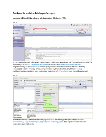 Pobieranie opisów bibliograficznych Import z Biblioteki Narodowej lub Centralnej Biblioteki PTTK Fot. 1. W celu pobrania opisu bibliograficznego książki z Biblioteki Narodowej lub Centralnej Biblioteki PTTK należy wejść w Import z Biblioteki Narodowej w zakładce Gromadzenie i opracowanie. Na górze strony na pasku Serwera dokonujemy wyboru bazy bibliotecznej (BN lub CBPTTK), z której pobierzemy rekordy. Wpisujemy wówczas wybrany tytuł książki, klikamy szukaj, znajdujemy odpowiadający nam opis wśród wyszukanych i Importujemy do naszej bazy danych. Fot. 2. Po zaimportowaniu rekordu wpisujemy Egzemplarze uzupełniając kolejno rubryki: Numer inwentarzowy, Sygnatura miejsca, Typ wpływu, Nr akcesji, cena, data wprowadzania rekordu pojawia się automatycznie. Fot. 3. UWAGA! Przy zakupach ze środków budżetowych ZG PTTK należy uzupełnić opis. W Uwagach w zakładce Egzemplarze wpisać: Zakup ze śr. budżetowych ZG PTTK !!! Import z Bibliotek Polskich (KaRo) Fot. 4. Jeśli chcemy pobrać opisy z Katalogu Rozproszonego Bibliotek Polskich (KaRo) (czasem opisy bibliograficzne, których nie ma w BN czy CBPTTK są w innych bibliotekach polskich), na stronie internetowej http://karo.umk.pl/Karo/ Z lewej strony Zaznaczamy katalogi bibliotek, które będziemy przeszukiwać. Proszę wybrać ogólne. Wpisujemy autora, tytuł książki, klikamy szukaj i czekamy na rezultaty. Fot. 5. Wyświetlają się biblioteki, które posiadają książki o wyszukiwanym tytule. Wybieramy bibliotekę i wśród wyświetlonych (czasem kilka wydań tych samych tytułów) dopasowujemy opis. Fot. 6. Pobieramy gotowy rekord na nasz komputer (najczęściej zapisuje się na dysku w folderze pobrane) Fot. 7. Następnie w programie Biblioteka wchodzimy w Import/Export w MARC w tej samej zakładce Gromadzenie i opracowanie. Wyszukujemy pobrany rekord i importujemy do naszej bazy. Fot. 8. Przed zaimportowaniem pamiętajmy o zmianie polskich znaków. Fot. 9. Po zaimportowaniu opisu, tak jak w przypadku importu z BN czy CBPTTK wpisujemy Egzemplarze, uzupełniając wszystkie rubryki. Pamiętajmy o zaznaczeniu w Uwagach w zakładce Egzemplarze książek zakupionych ze śr. budżetowych ZGPTTK.
