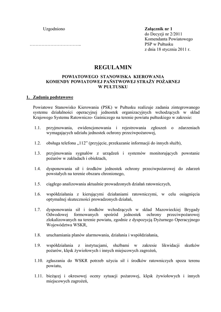 Załącznik nr 1 do Decyzji nr 2/2011 Komendanta Powiatowego PSP w Pułtusku z dnia 18 stycznia 2011 r. Uzgodniono …………………………….. REGULAMIN POWIATOWEGO STANOWISKA KIEROWANIA KOMENDY POWIATOWEJ PAŃSTWOWEJ STRAŻY POŻARNEJ W PUŁTUSKU 1. Zadania podstawowe Powiatowe Stanowisko Kierowania (PSK) w Pułtusku realizuje zadania zintegrowanego systemu działalności operacyjnej jednostek organizacyjnych wchodzących w skład Krajowego Systemu Ratowniczo- Gaśniczego na terenie powiatu pułtuskiego w zakresie: 1.1. przyjmowania, ewidencjonowania i rejestrowania zgłoszeń wymagających udziału jednostek ochrony przeciwpożarowej, o zdarzeniach 1.2. obsługa telefonu „112” (przyjęcie, przekazanie informacji do innych służb), 1.3. przyjmowania sygnałów z urządzeń i systemów monitorujących powstanie pożarów w zakładach i obiektach, 1.4. dysponowania sił i środków jednostek ochrony przeciwpożarowej do zdarzeń powstałych na terenie obszaru chronionego, 1.5. ciągłego analizowania aktualnie prowadzonych działań ratowniczych, 1.6. współdziałania z kierującymi działaniami ratowniczymi, w celu osiągnięcia optymalnej skuteczności prowadzonych działań, 1.7. dysponowania sił i środków wchodzących w skład Mazowieckiej Brygady Odwodowej formowanych spośród jednostek ochrony przeciwpożarowej zlokalizowanych na terenie powiatu, zgodnie z dyspozycją Dyżurnego Operacyjnego Województwa WSKR, 1.8. uruchamiania planów alarmowania, działania i współdziałania, 1.9. współdziałania z instytucjami, służbami w zakresie pożarów, klęsk żywiołowych i innych miejscowych zagrożeń, likwidacji skutków 1.10. zgłaszania do WSKR potrzeb użycia sił i środków ratowniczych spoza terenu powiatu, 1.11. bieżącej i okresowej oceny sytuacji pożarowej, klęsk żywiołowych i innych miejscowych zagrożeń, 2 1.12. ewidencjonowania stanu sił i środków jednostek organizacyjnych ochrony przeciwpożarowej, 1.13. bieżącej i okresowej oceny stanu sił i środków jednostek ochrony przeciwpożarowej, 1.14. przyjmowania, rejestrowania, ewidencjonowania i nadawania do WSKR meldunków o udziale jednostek ochrony przeciwpożarowej w likwidacji zdarzeń powstałych na terenie powiatu, 1.15. prowadzenia i aktualizowania Bazy Danych Operacyjnych, w tym dokumentacji operacyjnej, 1.16. nadzór nad przekazywanymi do WSKR meldunkami dotyczącymi wystąpienia poważnej awarii przemysłowej, 1.17. powiadamiania przełożonych oraz władz samorządowych o zdarzeniach powstałych na terenie powiatu, 1.18. utrzymywania stałej łączności operacyjnej z Wojewódzkim Stanowiskiem Koordynacji Ratownictwa, Nadleśnictwem i Lotniczym Pogotowiem Ratunkowym. 2. Organizacja PSK . 2.1. W celu prawidłowego funkcjonowania PSK, a w szczególności w zakresie organizowania działań ratowniczych podejmowanych przez system ratowniczogaśniczy funkcjonujący na terenie powiatu, w PSK powołane są następujące rodzaje służby dyżurnej: 2.1.1 W systemie zgłoszeniowo - dyspozytorskim PSK na każdej zmianie służbowej Dyżurny Operacyjny Powiatu, 2.1.2 Oficer Operacyjny - nieetatowy w systemie dyspozycyjnych dyżurów domowych. 2.2. W zależności od potrzeb wynikających głównie z sytuacji pożarowej, podwyższonego stanu gotowości operacyjno - technicznej lub innych uzasadnionych przypadkach, Mazowiecki Komendant Wojewódzki PSP lub Komendant Powiatowy PSP może powołać dodatkowe nieetatowe służby dyżurne PSK : – grupy operacyjne, – pomocnika Dyżurnego Operacyjnego Powiatu. 2.3. W przypadkach nieobecności etatowej służby dyżurnej PSK /choroba, urlop, delegacja itp./, do pełnienia tych służb oraz do pełnienia nieetatowych służb w PSK powoływani są oficerowie, aspiranci i przeszkoleni podoficerowie zatrudnieni w Komendzie Powiatowej PSP w Pułtusku. 2.4. Do pełnienia służb, o których mowa w pkt. 2.2 oficerowie, aspiranci i podoficerowie powoływani są rozkazem Komendanta Powiatowego PSP i wyznaczani w comiesięcznych i okresowych grafikach. 3 3. Podstawowe obowiązki służby dyżurnej PSK. 3.1. Podstawowe obowiązki Dyżurnego Operacyjnego Powiatu. 3.1.1. organizowanie pracy służby dyżurnej PSK, 3.1.2. znajomość przebiegu działań ratowniczych podczas zdarzeń powstałych w czasie służby, 3.1.3. dokładna znajomość stanu sił i środków ratowniczych wraz z ich parametrami taktyczno - technicznymi, będących w dyspozycji podczas służby, 3.1.4. dokonywanie bieżącej analizy i oceny sytuacji na terenie powiatu, w tym zdarzeń wymagających podjęcia działań ratowniczych oraz stanu sił i środków ratowniczych, 3.1.5. analizowanie aktualnie prowadzonych działań ratowniczych, 3.1.6. współdziałanie z instytucjami i służbami w zakresie likwidacji skutków pożarów, klęsk żywiołowych i innych miejscowych zagrożeń, 3.1.7. dysponowanie do działań ratowniczych sił i środków wchodzących w skład Mazowieckiej Brygady Odwodowej formowanych spośród jednostek ochrony przeciwpożarowej zlokalizowanych na terenie powiatu, zgodnie z dyspozycją Dyżurnego Operacyjnego Województwa WSKR, 3.1.8. dysponowanie sił i środków jednostek ochrony przeciwpożarowej poza teren obszaru chronionego - wg poleceń Dyżurnego Operacyjnego Województwa WSKR, 3.1.9. uruchamianie planów alarmowania, działania i współdziałania, 3.1.10. uruchamianie systemów organizacyjnych PSP, alarmowania stanów osobowych jednostek 3.1.11. bieżące aktualizowanie Bazy Danych Operacyjnych, w tym dokumentacji PSK, 3.1.12. powiadamianie przełożonych i WSKR oraz informowanie władz samorządowych o zaistniałych zdarzeniach i prowadzonych działaniach ratowniczych, jak również zapewnienie ciągłego przekazywania i obiegu meldunków i informacji, 3.1.13. współdziałanie z kierującymi działaniami ratowniczymi, w celu osiągnięcia optymalnej skuteczności prowadzonych działań, 3.1.14. zgłaszanie do WSKR potrzeb użycia sił i środków ratownicz