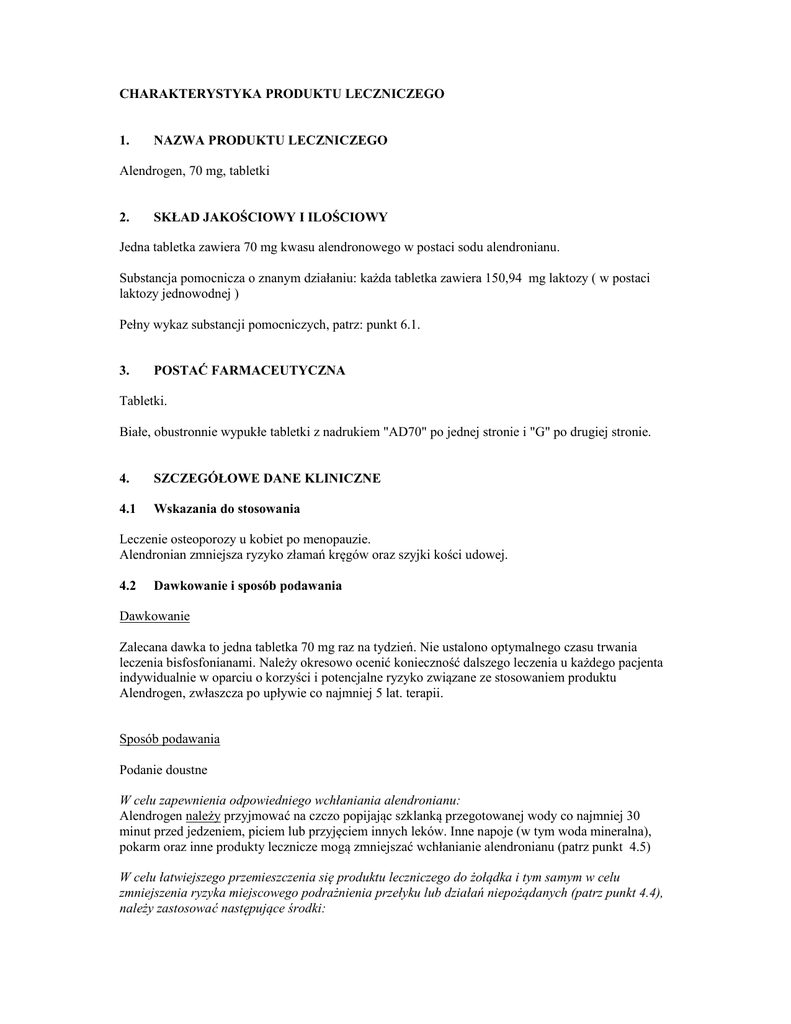 CHARAKTERYSTYKA PRODUKTU LECZNICZEGO 1. NAZWA PRODUKTU LECZNICZEGO Alendrogen, 70 mg, tabletki 2. SKŁAD JAKOŚCIOWY I ILOŚCIOWY Jedna tabletka zawiera 70 mg kwasu alendronowego w postaci sodu alendronianu. Substancja pomocnicza o znanym działaniu: każda tabletka zawiera 150,94 mg laktozy ( w postaci laktozy jednowodnej ) Pełny wykaz substancji pomocniczych, patrz: punkt 6.1. 3. POSTAĆ FARMACEUTYCZNA Tabletki. Białe, obustronnie wypukłe tabletki z nadrukiem "AD70" po jednej stronie i "G" po drugiej stronie. 4. SZCZEGÓŁOWE DANE KLINICZNE 4.1 Wskazania do stosowania Leczenie osteoporozy u kobiet po menopauzie. Alendronian zmniejsza ryzyko złamań kręgów oraz szyjki kości udowej. 4.2 Dawkowanie i sposób podawania Dawkowanie Zalecana dawka to jedna tabletka 70 mg raz na tydzień. Nie ustalono optymalnego czasu trwania leczenia bisfosfonianami. Należy okresowo ocenić konieczność dalszego leczenia u każdego pacjenta indywidualnie w oparciu o korzyści i potencjalne ryzyko związane ze stosowaniem produktu Alendrogen, zwłaszcza po upływie co najmniej 5 lat. terapii. Sposób podawania Podanie doustne W celu zapewnienia odpowiedniego wchłaniania alendronianu: Alendrogen należy przyjmować na czczo popijając szklanką przegotowanej wody co najmniej 30 minut przed jedzeniem, piciem lub przyjęciem innych leków. Inne napoje (w tym woda mineralna), pokarm oraz inne produkty lecznicze mogą zmniejszać wchłanianie alendronianu (patrz punkt 4.5) W celu łatwiejszego przemieszczenia się produktu leczniczego do żołądka i tym samym w celu zmniejszenia ryzyka miejscowego podrażnienia przełyku lub działań niepożądanych (patrz punkt 4.4), należy zastosować następujące środki: • • • • • Produkt leczniczy Alendrogen należy połykać na stojąco, po wstaniu z łóżka i popić pełną szklanką przegotowanej wody (co najmniej 200 ml lub 7 uncji). Produkt leczniczy Alendrogen należy połykać w całości. Nie należy żuć ani rozpuszczać tabletek w jamie ustnej, z powodu ryzyka wystąpienia owrzodzeń błony śluzowej jamy ustnej lub gardła. Pacjenci nie mogą kłaść się aż do spożycia pierwszego posiłku w ciągu dnia, który można spożyć w co najmniej pół godziny po połknięciu tabletki. Pacjenci nie mogą kłaść się przez 30 minut po przyjęciu tabletki. Produktu leczniczego Alendrogen nie należy przyjmować przed położeniem się spać oraz przed wstaniem z łóżka. W przypadku nieodpowiedniej diety pacjenci powinni przyjmować preparaty wapnia i witaminy D (patrz punkt 4.4). Osoby w podeszłym wieku: W badaniach klinicznych nie wykazano różnic związanych z wiekiem i dlatego też nie ma konieczności zmniejszenia dawki u osób w podeszłym wieku. Pacjenci z zaburzeniami czynności nerek Zmiana dawkowania nie jest konieczna u pacjentów, u których wskaźnik przesączania kłębuszkowego (ang. GFR) jest większy niż 35 ml/min. Alendronian nie jest zalecany u pacjentów z ciężkimi zaburzeniami czynności nerek, u których wartość GFR jest mniejsza niż 35 ml/min ze względu na brak odpowiednich badań klinicznych. Dzieci i młodzież Kwasu alendronowego (substancja czynna) nie należy stosować u dzieci w wieku poniżej 18 lat, ponieważ brak jest dostępnych danych dotyczących bezpieczeństwa i skuteczności stosowania w osteoporozie w dzieci (patrz także punkt 5.1). Nie prowadzono badań kwasu alendronowego w leczeniu osteoporozy wywołanej przez glikokortykosteroidy. 4.3 Przeciwwskazania - - Nieprawidłowości przełyku oraz inne czynniki opóźniające proces opróżniania przełyku np. zwężenie lub achalazja. Niezdolność zachowania pozycji stojącej lub siedzącej przez co najmniej 30 minut. Nadwrażliwość na substancję czynną lub na którąkolwiek substancję pomocniczą wymienioną w punkcie 6.1. Hipokalcemia. Patrz również punkt 4.4 4.4 Specjalne ostrzeżenia i środki ostrożności dotyczące stosowania - Alendronian może powodować miejscowe podrażnienie błony śluzowej górnego odcinka przewodu pokarmowego. Ze względu na możliwość nasilenia objawów podrażnienia błony śluzowej górnego odcinka przewodu pokarmowego, należy zachować ostrożność podczas stosowania produktu leczniczego u osób z czynnymi zaburzeniami dotyczącymi górnego odcinka przewodu pokarmowego takimi, jak: trudności w połykaniu, choroby przełyku, zapalenie błony śluzowej żołądka lub dwunastnicy, owrzodzenia lub u osób, u których ostatnio (w ciągu ostatniego roku) wystąpiły ciężkie choroby układu pokarmowego takie, jak wrzód trawienny, czynne krwawienie z przewodu pokarmowego, zabieg chirurgiczny w obrębie górnego odcinka przewodu pokarmowego inny niż plastyka odźwiernika (patrz punkt 4.3). U pacjentów z rozpoznanym przełykiem Barretta, lekarz przepisujący receptę powinien rozważyć korzyści i potencjalne ryzyko stosowania alendronianu u każdego pacjenta z osobna. Opisano działania niepożądane u pacjentów leczonych alendronianem takie jak zapalenie przełyku, owrzodzenia i nadżerki przełyku, w rzadkich przypadkach prowadzące do zwężenia przełyku. Dlatego też, lekarz musi zwracać uwagę na wszelkie objawy podmiotowe i przedmiotowe, które mogą świadczyć o wystąpieniu działań niepożądanych w obrębie przełyku. Pacjentów należy pouczyć o konieczności przerwania leczenia alendronianem i skonsultowania się ze swoim lekarzem w przypadku pojawienia się objawów podrażnienia przełyku takich jak utrudnienie połykania, ból podczas połykania, ból zamostkowy, pojawienie się lub nasilenie zgagi. Należy przypuszczać, że ryzyko ciężkich działań niepożądanych dotyczących przełyku wydaje się większe u pacjentów przyjmujących alendronian niezgodnie z zaleceniami i (lub) kontynuujących przyjmowanie produktu leczniczego pomimo wystąpienia objawów wskazujących na podrażnienie przełyku. Bardzo ważne jest, aby pacjent otrzymał i całkowicie zrozumiał informacje do