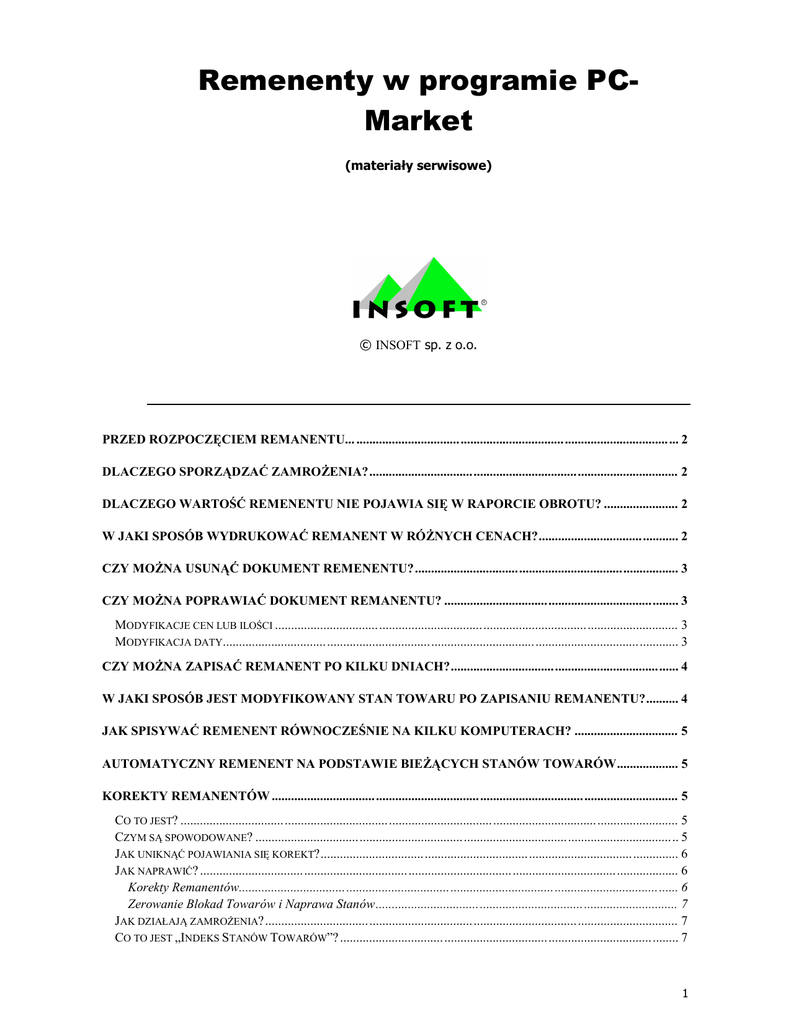 Remenenty w programie PCMarket (materiaży serwisowe) ż INSOFT sp. z o.o. PRZED ROZPOCZE CIEM REMANENTU... ................................................................................................... 2 DLACZEGO SPORZA DZACZAMROZ ENIA?............................................................................................... 2 DLACZEGO WARTOSCREMENENTU NIE POJAWIA SIE W RAPORCIE OBROTU? ....................... 2 W JAKI SPOSO B WYDRUKOWACREMANENT W RO Z NYCH CENACH?........................................... 2 CZY MOZ NA USUNA CDOKUMENT REMENENTU?................................................................................. 3 CZY MOZ NA POPRAWIACDOKUMENT REMANENTU? ........................................................................ 3 MODYFIKACJE CEN LUB ILOS CI ............................................................................................................................ 3 MODYFIKACJA DATY............................................................................................................................................ 3 CZY MOZ NA ZAPISACREMANENT PO KILKU DNIACH?...................................................................... 4 W JAKI SPOSO B JEST MODYFIKOWANY STAN TOWARU PO ZAPISANIU REMANENTU?.......... 4 JAK SPISYWACREMENENT RO WNOCZESNIE NA KILKU KOMPUTERACH? ................................ 5 AUTOMATYCZNY REMENENT NA PODSTAWIE BIEZ A CYCH STANO W TOWARO W................... 5 KOREKTY REMANENTO W ............................................................................................................................. 5 CO TO JEST? ......................................................................................................................................................... 5 CZYM SA SPOWODOWANE? .................................................................................................................................. 5 JAK UNIKNA C POJAWIANIA SIE KOREKT?.............................................................................................................. 6 JAK NAPRAWIC? ................................................................................................................................................... 6 Korekty Remanento w....................................................................................................................................... 6 Zerowanie Blokad Towaro w i Naprawa Stano w............................................................................................. 7 JAK DZIAŻ AJA ZAMROZENIA?............................................................................................................................... 7 CO TO JEST Ó INDEKS STANO W TOWARO W ? ........................................................................................................ 7 1 Przed rozpocze ciem remanentu... Poniz ej podalismy trzy proste operacje, o kto rych czą sto nie pamią ta sią , a kto re zabezpieczajŚ remanent przed wią kszosciŚ wypadko w: 1. SciŚgnŚc importy z kas 2. Zarchiwizowac bazą 3. Wykonac dwie naprawy: Zerowanie blokad, Naprawa Stano w (zobacz rozdziań Korekty Remanento w). ZabezpieczajŚ one remenent, gdyby w ciŚgu roku powstańy blokady stano w (np. po resecie komputera podczas edycji jakiegokolwiek dokumentu). Dlaczego sporzadzaczamroz enia? Dokumenty remenento w sa najwią kszymi dokumentami w programie PC-Market. MogŚ skńadac sią nawet z wielu tysią cy pozycji. Na ich wprowadzenie poswią ca sią wiele pracy i cennego czasu. Podczas sporzŚdzania remenentu zawsze moz e zdarzyc sią jakis nieprzewidziany wypadek na przykńad wyńŚczenie prŚdu, zawieszenie komputera. Podczas edycji rementu, przed jego zapisaniem wszystkie towary znajdujŚce sią na tym dokumencie sŚ przechowywane w pamią ci RAM komputera. Zawartosc takiej pamią ci w przypadku awarii ulegńaby wtedy bezpowrotnemu skasowaniu. Dokonywanie zamroz en, to zapisywanie fragmento w remanentu na dysku, co zabezpiecza juz wpisany pakiet towaro w przed utratć . Na samym koncu wszystkie pakiety moz na ”zbic ź w jeden dokument remenentu, a nastą pnie go zapisac. Sposo b dokonywania zamroz en jest opisany w instrukcji programu PC-Market. Innym ciekawym sposobem zastosowania zamroz en moz e byc moz liwos c ro wnoczesnego spisywania inwentaryzacji na kilku komputerach ro wnoczes nie (nawet w wersji jednostanowiskowej programu). Sposo b ten opisalismy w rozdziale ”Jak wprowadza c remanent na kilku komputerach?ą. Dlaczego wartoscremenentu nie pojawia sie w Raporcie Obrotu? Domyslnie po zainstalowaniu program jest tak skonfigurowany, z e wartosc manka/superaty remanentu nie pojawia sią w Raporcie Obrotu. Aby to zmieni c wystarczy przestawic parametr Raporty-> Konfiguracja-> Raport Obrotu-> Skęadniki raportu-> Remanenty. W jaki sposo b wydrukowacremanent w ro z nych cenach? Raz zapisanego remenentu nie moz na juz zmieniac. Remanent jest zawsze zapisany tylko w jednej, wybranej cenie. Aby wydrukowac go w innej cenie nalez y wykonac kolejno: 1. Zamrozic sporzŚdzony remenent i wyjsc z niego do menu programu 2. Wejsc w sporzŚdzanie nastą pnego remanentu. Tym razem w okienku edycji daty wybrac ceną , kto ra nas interesuje. 3. Odmrozic zamroz ony wczesniej rement ale na pytanie ” Czy odmroz enie dokżadne z cenami?ę odpowiedziec NIE. (zobacz rozdziań ” Korekty remanento w-> Jak dziażajć zamroz eniaę). Odmroz one zostanŚ tylko ilosci koncowe towaro w. Ceny zostanŚ pobrane z biez Ścej bazy towaro w. 4. Tak sporzŚdzony rement moz na wydrukowac przez F4. Przed wydrukiem program zapyta o nazwą pliku w celu dokonania nastą pnego zamroz enia (na wszelki wypadek). 5. Nie zapisywac przez F2! 2 Czy moz na usunacdokument remenentu? Zapisanego dokumentu remenentu nie moz na juz usunŚc (przez Alt-A). Przygotowalismy jednak w opcji Naprawa bazy danych ”tylne wejscieź umoz liwiajŚce przeprowadzenie takiej operacji. Opisujemy jŚ poniz ej, poniewaz w poprzednich latach mielismy wiele p