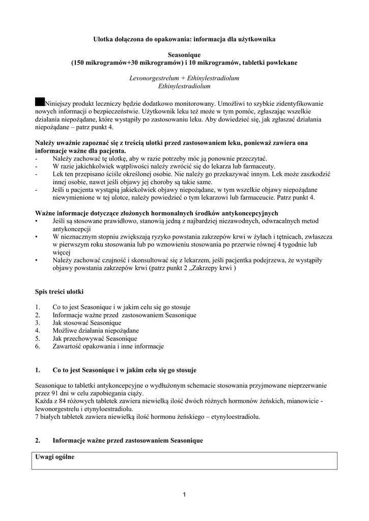 Ulotka dołączona do opakowania: informacja dla użytkownika Seasonique (150 mikrogramów+30 mikrogramów) i 10 mikrogramów, tabletki powlekane Levonorgestrelum + Ethinylestradiolum Ethinylestradiolum Niniejszy produkt leczniczy będzie dodatkowo monitorowany. Umożliwi to szybkie zidentyfikowanie nowych informacji o bezpieczeństwie. Użytkownik leku też może w tym pomóc, zgłaszając wszelkie działania niepożądane, które wystąpiły po zastosowaniu leku. Aby dowiedzieć się, jak zgłaszać działania niepożądane – patrz punkt 4. Należy uważnie zapoznać się z treścią ulotki przed zastosowaniem leku, ponieważ zawiera ona informacje ważne dla pacjenta. Należy zachować tę ulotkę, aby w razie potrzeby móc ją ponownie przeczytać. W razie jakichkolwiek wątpliwości należy zwrócić się do lekarza lub farmaceuty. Lek ten przepisano ściśle określonej osobie. Nie należy go przekazywać innym. Lek może zaszkodzić innej osobie, nawet jeśli objawy jej choroby są takie same. Jeśli u pacjenta wystąpią jakiekolwiek objawy niepożądane, w tym wszelkie objawy niepożądane niewymienione w tej ulotce, należy powiedzieć o tym lekarzowi lub farmaceucie. Patrz punkt 4. Ważne informacje dotyczące złożonych hormonalnych środków antykoncepcyjnych • Jeśli są stosowane prawidłowo, stanowią jedną z najbardziej niezawodnych, odwracalnych metod antykoncepcji • W nieznacznym stopniu zwiększają ryzyko powstania zakrzepów krwi w żyłach i tętnicach, zwłaszcza w pierwszym roku stosowania lub po wznowieniu stosowania po przerwie równej 4 tygodnie lub więcej • Należy zachować czujność i skonsultować się z lekarzem, jeśli pacjentka podejrzewa, że wystąpiły objawy powstania zakrzepów krwi (patrz punkt 2 „Zakrzepy krwi ) Spis treści ulotki 1. 2. 3. 4. 5. 6. Co to jest Seasonique i w jakim celu się go stosuje Informacje ważne przed zastosowaniem Seasonique Jak stosować Seasonique Możliwe działania niepożądane Jak przechowywać Seasonique Zawartość opakowania i inne informacje 1. Co to jest Seasonique i w jakim celu się go stosuje Seasonique to tabletki antykoncepcyjne o wydłużonym schemacie stosowania przyjmowane nieprzerwanie przez 91 dni w celu zapobiegania ciąży. Każda z 84 różowych tabletek zawiera niewielką ilość dwóch różnych hormonów żeńskich, mianowicie lewonorgestrelu i etynyloestradiolu. 7 białych tabletek zawiera niewielką ilość hormonu żeńskiego – etynyloestradiolu. 2. Informacje ważne przed zastosowaniem Seasonique Uwagi ogólne 1 Przed rozpoczęciem przyjmowania Seasonique należy zapoznać się z informacjami dotyczącymi zakrzepów krwi w punkcie 2. Jest szczególnie ważne, aby zapoznać się z objawami wystąpienia zakrzepów krwi (patrz punkt 2 „Zakrzepy krwi”). Zanim pacjentka rozpocznie stosowanie Seasonique, lekarz zada kilka pytań na temat zdrowia pacjentki oraz bliskich krewnych. Lekarz dokona także pomiaru ciśnienia krwi oraz – w zależności od stanu zdrowia pacjentki – może przeprowadzić także dodatkowe badania. W tej ulotce opisano kilka sytuacji, w których należy zaprzestać stosowania Seasonique lub w których skuteczność Seasonique może być zmniejszona. W tych sytuacjach pacjentka albo nie powinna odbywać stosunku płciowego albo powinna zastosować dodatkowe niehormonalne zabezpieczenia, np. prezerwatywę lub inną metodę mechaniczną. Nie należy stosować metody kalendarzykowej ani pomiaru temperatury. Metody te mogą być nieskuteczne, ponieważ Seasonique wpływa na miesięczną zmienność temperatury ciała i właściwości śluzu szyjki macicy. Seasonique, podobnie jak inne hormonalne środki antykoncepcyjne, nie chroni przed zakażeniem HIV (AIDS) ani innymi chorobami przenoszonymi drogą płciową. Kiedy nie należy stosować leku Seasonique Nie należy przyjmować Seasonique jeśli u pacjentki występuje którykolwiek z wymienionych poniżej stanów. Jeśli którykolwiek z wymienionych stanów występuje u pacjentki po raz pierwszy, należy poinformować o tym lekarza. Lekarz omówi z pacjentką, jaki inny środek zapobiegania ciąży będzie bardziej odpowiedni. Kiedy nie stosować Seasonique jeśli u pacjentki obecnie występuje (lub kiedykolwiek występował) zakrzep krwi w naczyniach żylnych nóg (zakrzepica żył głębokich), w płucach (zatorowość płucna) lub w innych narządach; jeśli pacjentka wie, że ma zaburzenia wpływające na krzepliwość krwi - na przykład niedobór białka C, niedobór białka S, niedobór antytrombiny III, obecność czynnika V Leiden lub przeciwciał antyfosfolipidowych; jeśli pacjentka wymaga zabiegu chirurgicznego lub nie będzie chodziła przez długi czas (patrz punkt „Zakrzepy krwi”); jeśli pacjentka przeszła zawał serca lub udar mózgu; jeśli pacjentka choruje (lub chorowała w przeszłości) na dusznicę bolesną (choroba, która powoduje silny ból w klatce piersiowej i może być pierwszym objawem zawału serca) lub przemijający napad niedokrwienny (przemijające objawy udaru); jeśli pacjentka choruje na którąkolwiek z poniższych chorób, które mogą zwiększać ryzyko powstania zakrzepu w tętnicy: - ciężka cukrzyca z uszkodzeniem naczyń krwionośnych, - bardzo wysokie ciśnienie krwi, - bardzo wysokie stężenie tłuszczów we krwi (cholesterolu lub trójglicerydów), - choroba nazywana hiperhomocysteinemią. jeśli u pacjentki występuje (lub występował w przeszłości) rodzaj migreny nazywany „migreną z aurą”; jeśli u pacjentki występuje (występowało) zapalenie trzustki; jeśli u pacjentki występuje lub występowała w przeszłości choroba wątroby i wątroba nadal nie funkcjonuje prawidłowo; jeśli u pacjentki występuje lub występował w przeszłości guz wątroby; jeśli u pacjentki występuje (występował) lub jeśli podejrzewa się występowanie raka piersi lub raka narządów płciowych; jeśli u pacjentki występuje jakiekolwiek niewyjaśnione krwa