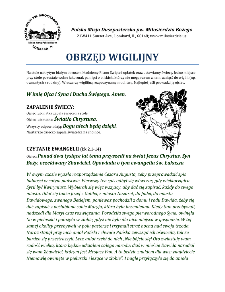 Polska Misja Duszpasterska pw. Miłosierdzia Bożego 21W411 Sunset Ave., Lombard, IL, 60148; www.milosierdzie.us OBRZĘD WIGILIJNY Na stole nakrytym białym obrusem kładziemy Pismo Święte i opłatek oraz ustawiamy świecę. Jedno miejsce przy stole pozostaje wolne jako znak pamięci o bliskich, którzy nie mogą razem z nami zasiąść do wigilii (np. o zmarłych z rodziny). Wieczerzę wigilijną rozpoczynamy modlitwą. Najlepiej jeśli prowadzi ją ojciec. W imię Ojca i Syna i Ducha Świętego. Amen. ZAPALENIE ŚWIECY: Ojciec lub matka zapala świecę na stole. Ojciec lub matka: Światło Chrystusa. Wszyscy odpowiadają: Bogu niech będą dzięki. Najstarsze dziecko zapala światełka na choince. CZYTANIE EWANGELII (Łk 2,1-14) Ojciec: Ponad dwa tysiące lat temu przyszedł na świat Jezus Chrystus, Syn Boży, oczekiwany Zbawiciel. Opowiada o tym ewangelia św. Łukasza W owym czasie wyszło rozporządzenie Cezara Augusta, żeby przeprowadzić spis ludności w całym państwie. Pierwszy ten spis odbył się wówczas, gdy wielkorządca Syrii był Kwiryniusz. Wybierali się więc wszyscy, aby dać się zapisać, każdy do swego miasta. Udał się także Jozef z Galilei, z miasta Nazaret, do Judei, do miasta Dawidowego, zwanego Betlejem, ponieważ pochodził z domu i rodu Dawida, żeby się dać zapisać z poślubiona sobie Maryja, która była brzemienna. Kiedy tam przebywali, nadszedł dla Maryi czas rozwiązania. Porodziła swego pierworodnego Syna, owinęła Go w pieluszki i położyła w żłobie, gdyż nie było dla nich miejsca w gospodzie. W tej samej okolicy przebywali w polu pasterze i trzymali straż nocna nad swoja trzoda. Naraz stanął przy nich anioł Pański i chwała Pańska zewsząd ich oświeciła, tak że bardzo się przestraszyli. Lecz anioł rzekł do nich „Nie bójcie się! Oto zwiastuję wam radość wielka, która będzie udziałem całego narodu: dziś w mieście Dawida narodził się wam Zbawiciel, którym jest Mesjasz Pan. A to będzie znakiem dla was: znajdziecie Niemowlę owinięte w pieluszki i leżące w żłobie”. I nagle przyłączyło się do anioła mnóstwo zastępów niebieskich, które wielbiły Boga słowami: „Chwała Bogu na wysokościach, a na ziemi pokój ludziom Jego upodobania”. Po wysłuchaniu fragmentu ewangelii - kolęda „Bóg się rodzi”. WSPÓLNA MODLITWA Ojciec lub matka odmawia prośby, wszyscy odpowiadają: Ciebie prosimy, wysłuchaj nas Panie. Ojciec lub matka: Boże, nasz Ojcze, w tej uroczystej godzinie wychwalamy Cię i dziękujemy za noc, w której posłałeś nam swojego Syna Jezusa Chrystusa, naszego Pana i Zbawiciela i prosimy Cię: Udziel naszej rodzinie daru miłości, zgody i pokoju. Ciebie prosimy, wysłuchaj nas Panie. * Obdarz naszych sąsiadów, przyjaciół i znajomych pokojem tej nocy. Ciebie prosimy, wysłuchaj nas Panie. * Wszystkich opuszczonych, samotnych, chorych, biednych, głodnych na całym świecie pociesz i umocnij Dobrą Nowiną tej świętej nocy. Ciebie prosimy, wysłuchaj nas Panie. Naszych zmarłych (wymienić imiona) obdarz szczęściem i światłem Twej chwały. Ciebie prosimy, wysłuchaj nas Panie. Wszyscy odmawiają „Ojcze nasz”. Ojciec lub matka: Panie Boże, Ty sprawiłeś, że ta święta noc zajaśniała blaskiem prawdziwej światłości Jednorodzonego Syna Twojego, spraw, abyśmy jaśnieli blaskiem Twego światła w naszym codziennym postępowaniu. Przez Chrystusa Pana naszego. Amen. ŁAMANIE SIĘ OPŁATKIEM: Ojciec lub matka: A teraz w duchu miłości i przebaczenia przełamiemy się opłatkiem - chlebem miłości. Otwierając serca nasze w miłości wzajemnej, otwieramy je na przyjście Pana. Niech On będzie zawsze z nami. Ojciec pierwszy składa wszystkim życzenia i przełamuje się opłatkiem. ZWYCZAJE ZWIĄZANE Z NARODZENIEM PAŃSKIM Wieczerza wigilijna - to uroczysta kolacja. Według tradycji liczba potraw wigilijnych powinno być 12, tyle ilu apostołów i miesięcy w roku. W potrawach powinny być wszystkie płody rolne, aby zapewnić urodzaj w następnym roku. Należy skosztować wszystkich potraw, żeby nie zabrakło którejś na następnej wieczerzy wigilijnej. Do wieczerzy zasiada się z pojawieniem się pierwszej gwiazdki. Przedtem powinno się zapalić świecę, symbol Pana Jezusa, który jest Światłością świata, odczytać fragment Ewangelii według św. Łukasza mówiący o narodzeniu Świętej Dzieciny, i podzielić się z bliskimi opłatkiem. Opłatek – dzielimy się nim na znak pojednania i pokoju. Dzisiaj jest to już wyłącznie polski zwyczaj. Dzieląc się opłatkiem składamy sobie życzenia dobra wszelakiego, zapominamy o urazach, wybaczamy winy. Starołacińska nazwa opłatka – brachiatellum – kryje w sobie element dzielenia się z potrzebującymi, gotowość do ofiary dla bliźniego. Wolne miejsce przy stole – jest przeznaczone dla przygodnego gościa; wyraża pamięć o bliskich, którzy nie mogą świąt spędzić z nami, symbolizuje stale obecną przy wigilijnym stole pamięć o zmarłych. Siano pod obrusem — przypomina ubóstwo groty betlejemskiej i Maryi, która narodzonego Chrystusa na sianie w żłobie. Choinka – Zwyczaj zagościł u nas całkiem niedawno, bo w XIX wieku. Zwyczaj niemiecki. Symbol życia wiecznego darowanego przez Jezusa Chrystusa. Ozdobione świecami gałązki nawiązują do rajskiego drzewa życia; żywe zielone drzewko symbolizuje Chrystusa — źródło wszelkiego życia. Na szczycie drzewka zawieszano gwiazdę symbolizującą gwiazdę betlejemska, w zawieszanych jabłkach widziano echo biblijnego jabłka Adama i Ewy; papierowe łańcuchy rozpoznawano jako okowy zniewolenia grzechowego czy nawet politycznego (w okresie rozbiorów); oświetlenie choinkowe miałoby wskazywać na Chrystusa, który przyszedł na świat jako „światło dla pogan”. Wręczanie prezentów – Pomaga rozumieć Jezusa Chrystusa jako największy dar Boga dla świata; wyraża radość i wdzięczność za Bożą hojność. Jak Chry