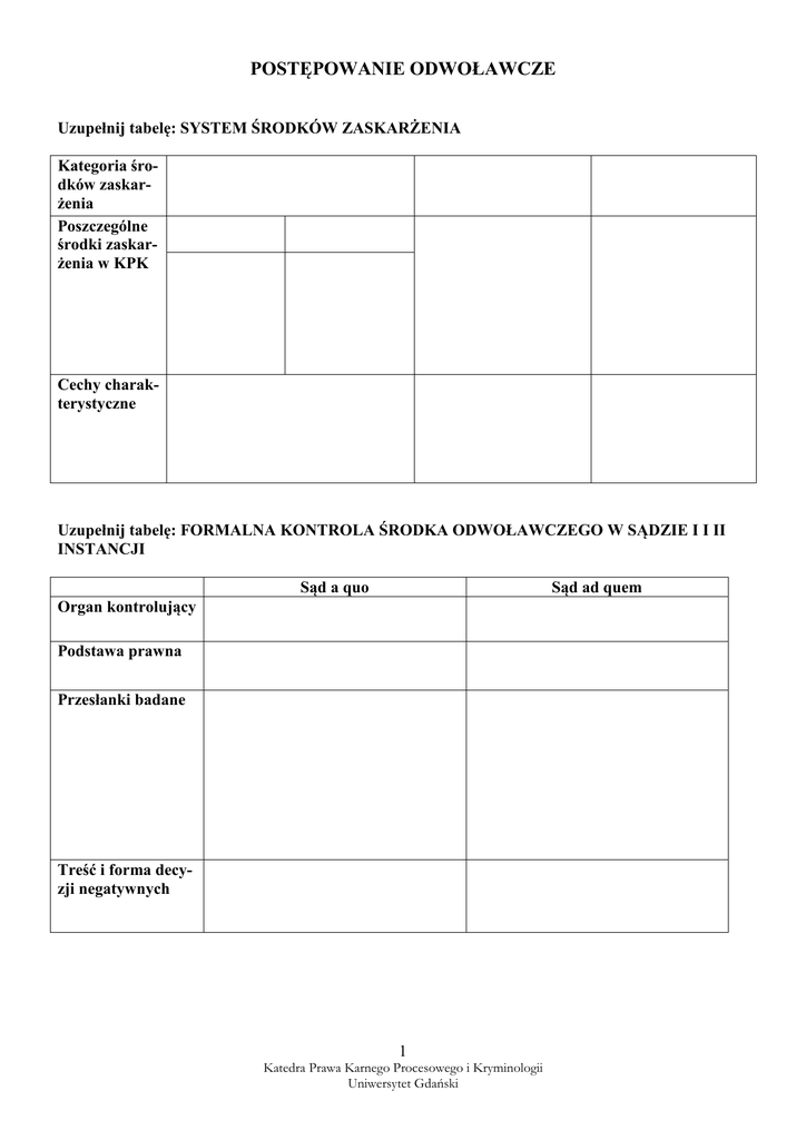 POSTĘPOWANIE ODWOŁAWCZE Uzupełnij tabelę: SYSTEM ŚRODKÓW ZASKARŻENIA Kategoria środków zaskarżenia Poszczególne środki zaskarżenia w KPK Cechy charakterystyczne Uzupełnij tabelę: FORMALNA KONTROLA ŚRODKA ODWOŁAWCZEGO W SĄDZIE I I II INSTANCJI Sąd a quo Sąd ad quem Organ kontrolujący Podstawa prawna Przesłanki badane Treść i forma decyzji negatywnych 1 Katedra Prawa Karnego Procesowego i Kryminologii Uniwersytet Gdański Uzupełnij tabelę: ZWYCZAJNE ŚRODKI ODWOŁAWCZE Apelacja Zażalenie Przedmiot zaskarżenia Podmiot uprawniony Termin do wniesienia Podstawy odwoławcze Organ rozstrzygający Forma decyzji Merytoryczne rozstrzygnięcia KAZUSY 1. Janusz R. został skazany przez Sąd Rejonowy w G. na karę jednego roku pozbawienia wolności z zawieszeniem na 2 lata za to, iż w dniu 10 listopada 2008 r. o godz. 22.30 w G., kierując samochodem marki Renault naruszył zasady bezpieczeństwa w ruchu lądowym poprzez niezachowanie należytej ostrożności i nieobserwowanie pobocza jezdni, nie ustąpił pierwszeństwa przechodzącemu przez przejście dla pieszych Markowi Z. i potrącił go, w wyniku czego Marek Z. odniósł obrażenia ciała na okres powyżej 7 dni tj. za przestępstwo z art. 177 § 1 k.k. Powyższy wyrok zaskarżył pełnomocnik oskarżyciela posiłkowego Marka Z. zarzucając mu błąd w ustaleniach faktycznych poprzez przyjęcie w opisie stanu faktycznego zawartym w uzasadnieniu wyroku, iż w chwili wypadku Marek Z. był pod wpływem alkoholu. Jaki środek odwoławczy należy wnieść do sądu w razie zaskarżenia uzasadnienia wyroku, a jaki od uzasadnienia postanowienia? 2 Katedra Prawa Karnego Procesowego i Kryminologii Uniwersytet Gdański Co w treści uzasadnienia może być przedmiotem zaskarżenia? Na jakim forum należy rozpoznać środek odwoławczy od uzasadnienia orzeczenia? W jakiej formie sąd odwoławczy powinien orzekać po rozpoznaniu środka odwoławczego od uzasadnienia i jak powinna być jego treść? 2. Do Sądu Rejonowego w P. wpłynął wniosek oskarżonego o uzasadnienie wyroku. W treści wniosku podniósł on, iż uważa on wyrok za bardzo niesprawiedliwy i niezgodny z prawem. Jednakże po doręczeniu wyroku wraz z uzasadnieniem nie wniósł apelacji. Co należy uczynić w tej sytuacji? Czy podobnie należałoby postąpić gdyby oskarżony złożył na ostatniej rozprawie oświadczenie, że nie zamierza wnosić apelacji? 3. Jan K. i Grzegorz P. zostali skazani wyrokiem Sądu Okręgowego w R. za przestępstwo z art. 280 § 2 k.k. na kary 4 lat pozbawienia wolności. Wyrok ten w całości zaskarżył obrońca oskarżonych. Po przekazaniu akt sprawy do Sądu Apelacyjnego, wpłynęło pismo obrońcy, w którym oświadczył on, iż po porozumieniu ze swoim klientem cofa apelację w części dotyczącej oskarżonego Grzegorza P. W związku z tym Prezes Sądu Apelacyjnego skierował sprawę na posiedzenie, gdzie sąd wydał postanowienie o pozostawieniu apelacji obrońcy bez rozpoznania. Na to postanowienie zażalenie złożył oskarżony Grzegorz P. twierdząc, iż nie zgadza się na cofnięcie apelacji przez obrońcę. Jak kształtuje się kwestia dopuszczalności cofnięcia środka odwoławczego? Jakie warunki muszą zostać zachowane przez składającego oświadczenie o cofnięciu środka odwoławczego? Czy dopuszczalne jest częściowe cofnięcie środka odwoławczego? 4. Do Sądu Rejonowego w S. wpłynęła apelacja adwokata Janusza C. od wyroku tegoż sądu skazującego Józefa K. na karę 3 lat pozbawienia wolności za przestępstwo z art. 280 § 1 k.k. Prezes Sądu Rejonowego w S. dokonał kontroli warunków formalnych tej apelacji i wydał zarządzenie o jej przyjęciu. Zanim jednak doszło do przekazania apelacji wraz z aktami sprawy do Sądu Okręgowego w G. celem rozpoznania apelacji, do Sądu Rejonowego w S. wpłynęło pismo adwokata Janusza C. informujące, iż po uzgodnieniu z oskarżonym Józefem K. cofa apelację. W związku z powyższym, na podstawie art. 432 k.p.k., Sąd Rejonowy w S. wydał postanowienie o pozostawieniu apelacji bez rozpoznania. Proszę ocenić powyższą sytuację i wskazać ewentualne nieprawidłowości w postępowaniu. 5. Pełnomocnik pokrzywdzonego wniósł zażalenie na postanowienie prokuratora o umorzeniu postępowania przygotowawczego. Zostało ono przekazane do Sądu Rejonowego, jednak zanim on rozpoznał to zażalenie pełnomocnik nadesłał pismo, w którym oświadczył, iż cofa zażalenie. W związku z tym Sąd wyznaczył posiedzenie w celu wydania postanowienia o pozostawieniu zażalenia bez rozpozna3 Katedra Prawa Karnego Procesowego i Kryminologii Uniwersytet Gdański nia. Na to posiedzenie stawił się pełnomocnik pokrzywdzonego i oświadczył, iż jednak chce, aby zażalenie było rozpoznane przez sąd, w związku z tym cofa swoje wcześniejsze oświadczenie o cofnięciu zażalenia. Czy pełnomocnik może cofnąć zażalenie bez zgody strony, którą reprezentuje? Czy możliwe jest odwołanie oświadczenia o cofnięciu środka odwoławczego? Co we wskazanej sytuacji powinien uczynić sąd? 6. W trakcie postępowania apelacyjnego toczącego się przed Sądem Okręgowym w G. w sprawie oskarżonego Daniela K., Sąd ten w wyniku wniosku złożonego przez obrońcę wydał postanowienie o odmowie uchylenia stosowanego wobec oskarżonego środka zapobiegawczego w postaci tymczasowego aresztowania. Na to postanowienie zażalenie złożył obrońca. Prezes Sądu Okręgowego w G. na podstawie art. 429 § 1 w zw. z art. 426 § 2 k.p.k., zarządzeniem odmówił przyjęcia tego środka odwoławczego. Tę decyzję również zaskarżył obrońca oskarżonego. W związku z tym zażalenie obrońcy na zarządzenie prezesa przekazano zgodnie z tokiem instancji do rozpoznania przez Sąd Apelacyjny w G. Czy orzeczenia sądu odwoławczego są zaskarżalne w drodze zwyczajnych środków odwoławczych? Jak należy postąpić w przypadku wniesienia środka odwoławczego od niezaskarżalnego orzeczenia s