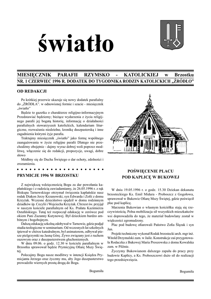 CZERWIEC 1996 „ŚWIATŁO” STR. światło MIESIĘCZNIK PARAFII RZYMSKO - KATOLICKIEJ w Brzostku NR. 1 CZERWIEC 1996 R. DODATEK DO TYGODNIKA RODZIN KATOLICKICH „ŹRÓDŁO” OD REDAKCJI Po krótkiej przerwie ukazuje się nowy dodatek parafialny do „ŻRÓDŁA”. w odnowionej formie i szacie - miesięcznik „światło” Będzie to gazetka o charakterze religijno-informacyjnym Przedstawiać będziemy; bieżące wydarzenia z życia religijnego parafii jej bogatą historię, informację o działalności parafialnych stowarzyszeń katolickich, kalendarium liturgiczne, rozważania niedzielne, kronikę duszpasterską i inne zagadnienia którymi żyje parafia. Traktujmy miesięcznik „światło” jako formę wspólnego zaangażowania w życie religijne parafii Dlatego nie przechodźmy obojętnie - dajmy wyraz dobrej woli poprzez modlitwę, włączenie się do redakcji, propozycje, uwagi, dobre słowo Módlmy się do Ducha Świętego o dar ochoty, zdolności i zrozumienia. POŚWIĘCENIE PLACU POD KAPLICĘ W BUKOWEJ PRYMICJE 1996 W BRZOSTKU Z największą wdzięcznością Bogu za dar powołania kapłańskiego i z radością zawiadamiamy, że 26.05.1996 r. z rąk Biskupa Tarnowskiego otrzymał święcenia kapłańskie nasz rodak Diakon Jerzy Krzanowski, syn Edwarda i Zofii z domu Krzyżak. Wczesne dzieciństwo spędził w domu rodzinnym dziadków śp. Cecylii i Wojciecha Krzyżak. Chrzest św. przyjął w naszym kościele parafialnym od Ks. Prałata Kazimierza Ostafińskiego. Tutaj też rozpoczął edukację w zerówce pod okiem Pani Zuzanny Kutynowej. Był dzieckiem bardzo ambitnym i bogobojnym. Dalszą edukację szkolną zdobywał w Tarnowie, gdzie podjął studia teologiczne w seminarium. Od wczesnych lat szkolnych śpiewał w chórze katedralnym, był animatorem, odbywał piesze pielgrzymki na Jasną Górę. Żywo związany jest z ruchem oazowym oraz z duszpasterstwem głuchoniemych. W dniu 09.06. o godz. 12.30 w kościele parafialnym w Brzostku sprawował będzie Prymicyjną Ofiarę Mszy Świętej. Polecajmy Bogu nasze modlitwy w intencji Księdza Prymicjanta Jerzego oraz życzmy mu, aby Jego duszpasterstwo prowadziło wiernych prostą drogą do Boga. W dniu 19.05.1996 r. o godz. 15.30 Dziekan dekanatu brzosteckiego Ks. Emil Midura - Proboszcz z Gogołowa, sprawował w Bukowie Ofiarę Mszy Świętej, gdzie poświęcił plac pod kaplicę. Marzenia Bukowian o własnym kościółku stają się rzeczywistością. Pełna mobilizacja sił wszystkich mieszkańców wsi doprowadziła do tego, że materiał budowlany został w większości zgromadzony. Plac pod budowę ofiarowali Państwo Zofia Ślęzak i syn Jan. Projekt techniczny wykonał Rodak brzostecki arch. mgr inż. Witold Drzymalski zam. w Jaśle. Konstrukcje zaś przygotowała Rodaczka z Bukowej Maria Proszowska z domu Kowalska zam. w Pilźnie. Życzymy Bukowianom dalszego zapału do pracy przy budowie Kaplicy, a Ks. Proboszczowi dużo sił do realizacji tego przedsięwzięcia. Bogumiła Bogumiła CZERWIEC 1996 „ŚWIATŁO” STR. POWSTANIE BRZOSTECKIEJ PARAFII HISTORYCZNY ZAMIAR Chrześcijaństwo od początku wpisane jest w dzieje państwa polskiego. Chrzest księcia Mieszka I w 966 r. dał podstawy do tworzenia kultury chrześcijańskiej. Polska znalazła się w gronie cywilizowanych państw europejskich. Przybywają wykształceni duchowni głosząc Słowo Boże, budowane są świątynie, przybywają zgromadzenia zakonne, zakładane są pierwsze szkoły, rozwija się piśmiennictwo, sztuka i architektura. W Tyńcu pod Krakowem ma swoją siedzibę Opactwo Benedyktynów. Zakon ten prowadził ożywioną akcję chrystianizacyjną i osadniczą podnosząc znaczenie kulturalne i gospodarcze swoich posiadłości. To wspomnienie jest ważne, gdyż z zakonem benedyktynów w Tyńcu związane są początki dziejów naszej parafii. Stwierdza to dokument pisany z lat 1123-1125, w którym legat papieski Idzi zatwierdzał - za zgodą księcia Bolesława Krzywoustego, posiadłości tegoż opactwa. Wśród wymienionych miejscowości są: Brzostek i Klecie. Klecie było wówczas największą osadą w okolicy. Dlatego tam prawdopodobnie już w XII w. Benedyktyni ufundowali kościół i założyli parafię. Należał do niej Brzostek. W klecieckiej parafii rozwinął się kult Świętego Leonarda. Przybywali liczni pielgrzymi z odległych stron, nawet Węgier i Rusi. Rosła sława o cudach za sprawą Św. Leonarda. Odpusty w dniu 6 listopada ściągały tłumy wiernych. Pisał o tym kronikarz Jan Długosz. W połowie XIV w. Klecie stały się siedzibą dekanatu. W sąsiedztwie Kleci szybko rozwijał się Brzostek. W 1354 r. określany był jako osada targowa. Sprzyjało temu korzystne położenie w widłach rzek, na wzgórzu, w otoczeniu bagien. Przebiegała również przez Brzostek droga handlowa na Węgry. Zachowany dokument o nadaniu praw miejskich Brzostkowi pochodzi z 1367 r. Nadania dokonał opat tyniecki Jan. Przekazywał on uposażenie ...” dla kościoła i przełożonego kościoła tegoż miasta...”. Można więc mówić o początkach tworzenia się oddzielnej parafii w Brzostku, która z pewnością już istniała na początku XV w. J. Długosz wymienia nazwisko ówczesnego proboszcza; którym był Świętosław z Orzechowic herbu Pylawa. Historia naszej parafii liczy ponad sześć wieków. Obecny kościół parafialny liczy 180 lat. Został zbudowany z kamienia w latach 1814-1816. Jest to klasycystyczna, jednonawowa świątynia o dł. 28 m. i nawie o sz. 15 m., posiadająca nieco zwężone prezbiterium z zakrystią i przedsionkiem. Świątynia była konsekrowana w 1826 r. Istniejący od północnej strony babieniec został dobudowany później. Kwestia dalszej rozbudowy kościoła pojawiła się na początku XX w Bardzo zasłużony dla brzosteckiej parafii Ks. Stefan Szymkiewicz widział potrzebę powiększenia świątyni i czynił w tej sprawie usilne starania. Istniały dwie możliwości rozbudowy: poprzez rozbudowę prezbiterium, alb