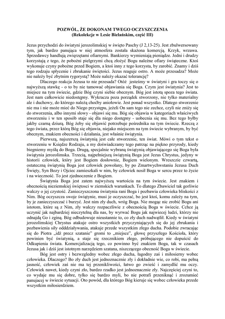 POZWÓL, śE DOKONAM TWEGO OCZYSZCZENIA (Rekolekcje w Lesie Bielańskim, część III) Jezus przychodzi do światyni jerozolimskiej w święto Paschy (J 2,13-25). Jest zbulwersowany tym, jak bardzo panująca w niej atmosfera została skaŜona komercją. Krzyk, wrzawa. Sprzedawcy handlują zwięrzętami ofiarnymi. Bankierzy wymieniają pieniądze. Jedni i drudzy korzystają z tego, Ŝe poboŜni pielgrzymi chcą złoŜyć Bogu naleŜne ofiary świąteczne. Ktoś wykonuje czyny poboŜne przed Bogiem, a ktoś inny z tego korzysta, by zarobić. Znamy i dziś tego rodzaju spłycenie i zbrukanie świętości. Jezus reaguje ostro. A moŜe przesadza? MoŜe nie naleŜy być zbytnim rygorystą? MoŜe naleŜy okazać tolerancję? Dlaczego reakcja Jezusa to nie przesada? OtóŜ jesteśmy w światyni i gra toczy się o najwyŜszą stawkę - o to by nie tamować objawiania się Boga. Czym jest światynia? Jest to miejsce na tym świecie, gdzie Bóg czyni siebie obecnym. Bóg jest istotą spoza tego świata. Jest nam całkowicie niedostępny. Wykracza poza porządek stworzony, nie tylko materialny ale i duchowy, do którego naleŜą choćby aniołowie. Jest ponad wszystko. Dlatego stworzenie nie ma i nie moŜe mieć do Niego przystępu, jeŜeli On sam tego nie zechce, czyli nie zniŜy się do stworzenia, albo innymi słowy - objawi się mu. Bóg się objawia w kategoriach właściwych stworzeniu i w ten sposób staje się dla niego dostępny - uobecnia się mu. Bez tego byłby jakby czarną dziurą. Bóg Ŝeby się objawić potrzebuje pośrednika na tym świecie. Rzeczą z tego świata, przez którą Bóg się objawia, niejako miejscem na tym świecie wybranym, by być obecnym, znakiem obecności i działania, jest właśnie świątynia. Pierwszą, najszerszą światynią jest całe stworzenie, ten świat. Mówi o tym tekst o stworzeniu w Księdze Rodzaju, a my doświadczamy tego patrząc na piękno przyrody, kiedy biegniemy myśłą do Boga. Drugą, specjalnie wybraną świątynią objawiającego się Boga była świątynia jerozolimska. Trzecią, najpełniejszą świątynią Boga jest Jezus Chrystus, jedyny w historii człowiek, który jest Bogiem dosłownie, Bogiem wielonym. Wreszczie czwartą, ostateczną świątynią Boga jest człowiek powołany, by po Zmartwychwstaniu Jezusa Duch Święty, Syn Bozy i Ojciec zamieszkali w nim, by człowiek nosił Boga w sercu przez to Ŝycie i na wieczność. To jest zjednoczenie z Bogiem. Świątynia Boga jest zatem najwyŜszą wartościa na tym świecie. Jest znakiem i obecnością nieziemskiej świętosci w ziemskich warunkach. To dlatego Zbawiciel tak gorliwie walczy o jej czystość. Zanieczyszczona światynia rani Boga i pozbawia człowieka bliskości z Nim. Bóg oczyszcza swoje świątynie, musi je oczyszczać, bo jest ktoś, komu zaleŜy na tym, by je zanieczyszczać i burzyć. Jest nim zły duch, wróg Boga. Nie mogąc nic zrobić Bogu ani istotom, które są z Nim, zły walczy rozpaczliwie z obecnością Boga w świecie. Cchce ją uczynić jak najbardziej nieczytelną dla nas, by wyrwać Bogu jak najwiecej ludzi, którzy nie odnajdą Go i zginą. Bóg odbudowuje nieustannie to, co zły duch nadwątlił. Kiedy w światyni jerozolimskiej Chrystus atakuje ostro wszystkich przyczyniających się do jej zbrukania i pozbawienia siły odddziaływania, atakuje przede wszystkim złego ducha. Podobie zwracając się do Piotra „idź precz szatanie” gromi to „miejsce”, głowę przyszłego Kościoła, który powinien być światynią, a staje się rzecznikiem złego, próbującego nie dopuścić do Odkupienia świata. Komercjalizacją tego, co powinno być znakiem Boga, tak w czasach Jezusa jak i dziś jest istotnym narzędziem szatana, niszczącego obecność Boga w świecie. Bóg jest ostry i bezwzgledny wobec złego ducha, łagodny zaś i miłosierny wobec człowieka. Dlaczego? Bo zły duch jest jednoznacznie zły i dokładnie wie, co robi, ma pełną jasność, człowiek zaś nie ma tej przenikliwości, łatwo go zwieść i zamydlić mu oczy. Człowiek nawet, kiedy czyni zło, bardzo rzadko jest jednoznacznie zły. Najczęściej czyni to, co wydaje mu się dobre, tylko się bardzo myli, bo nie potrafi przeniknąć i zrozumieć panujacej w świecie sytuacji. Oto powód, dla którego Bóg kieruje się wobec człowieka przede wszystkim miłosierdziem. Co zatem czyni miłosierny Bóg? Przede wszystkim demaskuje złego ducha. Zwraca się do niego i jego stronników ostro. Oczyszcza świątynię z grzechu i zła, a potem zapowiada, Ŝe jeśli nawet zło zniszczy świątynię, On we trzech dniach odbuduje ją na nowo. Tak postąpi z kaŜdą światynią, to znaczy zawsze przywróci obecność Boga w świecie. Bo obecność Boga, który raz do nas przyszedł, jest juŜ nieodwołalna. Bramy piekielne nie zwycięŜą jej, choć nadwątlają ją stale, a nawet burzą. Świątynie Boga na tym świecie stale niszczeją. Zły duch z przyjemnoscią zachęca człowieka, by przez swoją głupotę, niewiedzę, upór i egoizm niszczył tę światynię, którą jest świat - własność nie nasza ale Boga. Tan sam zły z lubością, wspierał grzech śydów i Rzymian, by w roku 70 n.e. zniszczyć świątynię jerozolimską. Z jeszcze wiekszą zawzietości zło zabiło Jezusa, człowieka i Syna BoŜego, zdając mu wyrafinowane tortury w odwecie za Jego świętość. To samo zło niszczy kaŜdego człowieka, światynię Boga, kusząc go do grzechu i doprowadzając do śmierci, której przecieŜ nie chciał Bóg. A jednak kto niszczy swiątynię Boga, tego zniszczy Bóg. On jest nieubłagany wobec złego ducha, a zły duch nie ma Ŝadnych szans. Natomiast człowiek ma szansę, moŜe mieć niezachwianą nadzieję, bo Bóg zapewnia, Ŝe kaŜda świątynia we trzech dniach będzie odbudowana. Obecności Boga z nami nikt nam nie odbierze, nikt nie zniweczy. Jak zatem działa Bóg wobec człowieka, by dbać o tę swoją obecność z nami, o odbudowywanie światyń? Przede wszystkim d