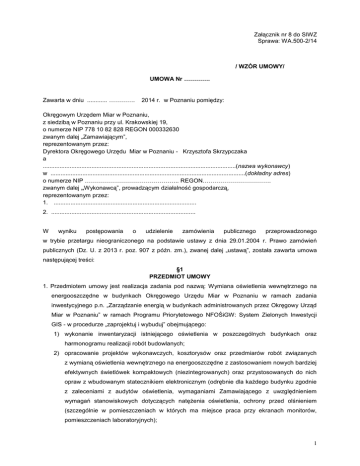 Załącznik nr 8 do SIWZ Sprawa: WA.500-2/14 / WZÓR UMOWY/ UMOWA Nr …………. Zawarta w dniu ............ …………. 2014 r. w Poznaniu pomiędzy: Okręgowym Urzędem Miar w Poznaniu, z siedzibą w Poznaniu przy ul. Krakowskiej 19, o numerze NIP 778 10 82 828 REGON 000332630 zwanym dalej „Zamawiającym”, reprezentowanym przez: Dyrektora Okręgowego Urzędu Miar w Poznaniu - Krzysztofa Skrzypczaka a ...................................................................................................................(nazwa wykonawcy) w ....................................................................................................................(dokładny adres) o numerze NIP ……………………………………….. REGON……………………………. zwanym dalej „Wykonawcą”, prowadzącym działalność gospodarczą, reprezentowanym przez: 1. ..................................................................................... 2. ...................................................................................... W wyniku postępowania o udzielenie zamówienia publicznego przeprowadzonego w trybie przetargu nieograniczonego na podstawie ustawy z dnia 29.01.2004 r. Prawo zamówień publicznych (Dz. U. z 2013 r. poz. 907 z późn. zm.), zwanej dalej „ustawą”, została zawarta umowa następującej treści: §1 PRZEDMIOT UMOWY 1. Przedmiotem umowy jest realizacja zadania pod nazwą: Wymiana oświetlenia wewnętrznego na energooszczędne w budynkach Okręgowego Urzędu Miar w Poznaniu w ramach zadania inwestycyjnego p.n. „Zarządzanie energią w budynkach administrowanych przez Okręgowy Urząd Miar w Poznaniu” w ramach Programu Priorytetowego NFOŚiGW: System Zielonych Inwestycji GIS - w procedurze „zaprojektuj i wybuduj” obejmującego: 1) wykonanie inwentaryzacji istniejącego oświetlenia w poszczególnych budynkach oraz harmonogramu realizacji robót budowlanych; 2) opracowanie projektów wykonawczych, kosztorysów oraz przedmiarów robót związanych z wymianą oświetlenia wewnętrznego na energooszczędne z zastosowaniem nowych bardziej efektywnych świetlówek kompaktowych (niezintegrowanych) oraz przystosowanych do nich opraw z wbudowanym statecznikiem elektronicznym (odrębnie dla każdego budynku zgodnie z zaleceniami z audytów oświetlenia, wymaganiami Zamawiającego z uwzględnieniem wymagań stanowiskowych dotyczących natężenia oświetlenia, ochrony przed olśnieniem (szczególnie w pomieszczeniach w których ma miejsce praca przy ekranach monitorów, pomieszczeniach laboratoryjnych); 1 3) przedstawienie dokumentacji wykonawczej do akceptacji Zamawiającego oraz inspektora nadzoru inwestorskiego; 4) przygotowanie stanowiska pracy dla wymiany opraw; 5) demontaż istniejących opraw ze świetlówkami liniowymi z zapłonem indukcyjnym i żarowym, żarówek oraz montaż w ich miejsce opraw ze statecznikiem elektronicznym oraz świetlówkami kompaktowymi o mniejszym poborze mocy, z możliwością wielokrotnego załączenia oświetlenia w ciągu dnia bez skrócenia żywotności źródeł światła, brakiem efektu pulsowania światła, niską temperaturą oprawy w trakcie działania (dłuższy czas życia oprawy), większą odpornością na wahania napięcia, z dostosowaniem do normatywnego poziomu natężenia oraz równomierności oświetlenia, 6) po zakończeniu montażu uporządkowanie i przywrócenie do stanu poprzedzającego roboty (wyrównanie podłoża z wymalowaniem farbą pustych placów po ewentualnie zdemontowanych oprawach); 7) wykonanie (po zakończeniu robot montażowo-budowlanych) badań i sprawdzeń oraz sporządzenie z przedmiotów badań i sprawdzeń stosownych protokołów w zakresie pomiaru natężenia oświetlenia w pomieszczeniach, w których zainstalowano nowe oświetlenia oraz niezbędne dokumenty związane z odbiorem robót, w tym dokumentacji powykonawczej; 8) w budynku w Poznaniu - zaprojektowanie i wykonanie wymiany oświetlenia korytarzy z zastosowaniem opraw wyposażonych w moduły awaryjne (ewakuacyjne) zapewniając natężenie oświetlenia na drogach ewakuacyjnych i wzdłuż nich w taki sposób, aby umożliwić bezpieczny ruch w kierunku wyjścia do bezpiecznego miejsca ewakuacji, zgodnie z wymaganiami krajowych norm i przepisów. 2. Zakresy robót i szczegółowe opisy przedmiotu zamówienia zawarte zostały w Specyfikacji Istotnych Warunków Zamówienia (SIWZ) oraz Programie funkcjonalno – użytkowym (PFU) stanowiącym załącznik nr 1 do SIWZ. § 2 POSTANOWIENIA OGÓLNE 1. Wykonawca zobowiązuje się wykonać roboty z należytą starannością i zgodnie z wymogami określonymi w dokumentacji przetargowej, zasadami wiedzy technicznej oraz obowiązującymi przepisami i normami. 2. Uznaje się, iż wykonawca przed złożeniem oferty przetargowej uzyskał wszelkie informacje niezbędne do wykonania przedmiotu zamówienia, jak również dotyczące ryzyka trudności oraz innych okoliczności jakie mogą mieć wpływ na wykonanie robót i uwzględnił je w wynagrodzeniu zawartym w przedłożonej ofercie. 3. Wykonawca bierze na siebie pełną odpowiedzialność za właściwe wykonanie robót, zapewnienie warunków bezpieczeństwa oraz za metody organizacyjno – techniczne stosowane na terenie budowy. 4. Materiały i urządzenia stosowane do realizacji niniejszego zamówienia powinny odpowiadać wymogom wyrobów dopuszczonych do obrotu i stosowania w budownictwie. Roboty będą wykonane przy użyciu materiałów, maszyn i urządzeń Wykonawcy. 5. Wykonawca gwarantuje wykonanie przedmiotu umowy przez osoby o odpowiednich kwalifikacjach zawodowych oraz ponosi odpowiedzialność z tego tytułu. 2 6. Wykonawca ponosi odpowiedzialność za wszelkie szkody wyrządzone właścicielowi obiektu, innym użytkownikom lub osobom trzecim w związku z realizacją niniejszej umowy. 7. Korespondencja w ramach niniejszej umowy pomiędzy Zamawiającym, a Wykonawcą będzie sporządzana w języku polskim. 1. Wykonawca ponosi § 