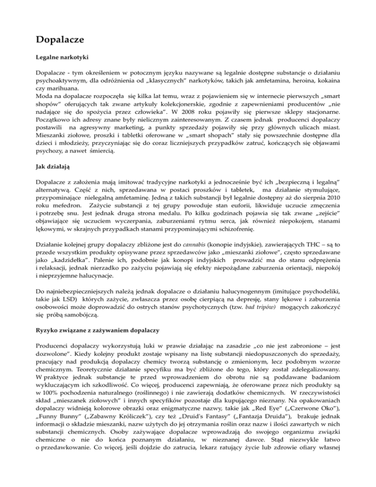 Dopalacze Legalne narkotyki Dopalacze - tym określeniem w potocznym języku nazywane są legalnie dostępne substancje o działaniu psychoaktywnym, dla odróżnienia od „klasycznych” narkotyków, takich jak amfetamina, heroina, kokaina czy marihuana. Moda na dopalacze rozpoczęła się kilka lat temu, wraz z pojawieniem się w internecie pierwszych „smart shopów” oferujących tak zwane artykuły kolekcjonerskie, zgodnie z zapewnieniami producentów „nie nadające się do spożycia przez człowieka”. W 2008 roku pojawiły się pierwsze sklepy stacjonarne. Początkowo ich adresy znane były nielicznym zainteresowanym. Z czasem jednak producenci dopalaczy postawili na agresywny marketing, a punkty sprzedaży pojawiły się przy głównych ulicach miast. Mieszanki ziołowe, proszki i tabletki oferowane w „smart shopach” stały się powszechnie dostępne dla dzieci i młodzieży, przyczyniając się do coraz liczniejszych przypadków zatruć, kończących się objawami psychozy, a nawet śmiercią. Jak działają Dopalacze z założenia mają imitować tradycyjne narkotyki a jednocześnie być ich „bezpieczną i legalną” alternatywą. Część z nich, sprzedawana w postaci proszków i tabletek, ma działanie stymulujące, przypominające nielegalną amfetaminę. Jedną z takich substancji był legalnie dostępny aż do sierpnia 2010 roku mefedron. Zażycie substancji z tej grupy powoduje stan euforii, likwiduje uczucie zmęczenia i potrzebę snu. Jest jednak druga strona medalu. Po kilku godzinach pojawia się tak zwane „zejście” objawiające się uczuciem wyczerpania, zaburzeniami rytmu serca, jak również niepokojem, stanami lękowymi, w skrajnych przypadkach stanami przypominającymi schizofrenię. Działanie kolejnej grupy dopalaczy zbliżone jest do cannabis (konopie indyjskie), zawierających THC – są to przede wszystkim produkty opisywane przez sprzedawców jako „mieszanki ziołowe”, często sprzedawane jako „kadzidełka”. Palenie ich, podobnie jak konopi indyjskich prowadzić ma do stanu odprężenia i relaksacji, jednak nierzadko po zażyciu pojawiają się efekty niepożądane zaburzenia orientacji, niepokój i nieprzyjemne halucynacje. Do najniebezpieczniejszych należą jednak dopalacze o działaniu halucynogennym (imitujące psychodeliki, takie jak LSD) których zażycie, zwłaszcza przez osobę cierpiącą na depresję, stany lękowe i zaburzenia osobowości może doprowadzić do ostrych stanów psychotycznych (tzw. bad tripów) mogących zakończyć się próbą samobójczą. Ryzyko związane z zażywaniem dopalaczy Producenci dopalaczy wykorzystują luki w prawie działając na zasadzie „co nie jest zabronione – jest dozwolone”. Kiedy kolejny produkt zostaje wpisany na listę substancji niedopuszczonych do sprzedaży, pracujący nad produkcją dopalaczy chemicy tworzą substancję o zmienionym, lecz podobnym wzorze chemicznym. Teoretycznie działanie specyfiku ma być zbliżone do tego, który został zdelegalizowany. W praktyce jednak substancje te przed wprowadzeniem do obrotu nie są poddawane badaniom wykluczającym ich szkodliwość. Co więcej, producenci zapewniają, że oferowane przez nich produkty są w 100% pochodzenia naturalnego (roślinnego) i nie zawierają dodatków chemicznych. W rzeczywistości skład „mieszanek ziołowych” i innych specyfików pozostaje dla kupującego nieznany. Na opakowaniach dopalaczy widnieją kolorowe obrazki oraz enigmatyczne nazwy, takie jak „Red Eye” („Czerwone Oko”), „Funny Bunny” („Zabawny Króliczek”), czy też „Druid's Fantasy” („Fantazja Druida”), brakuje jednak informacji o składzie mieszanki, nazw użytych do jej otrzymania roślin oraz nazw i ilości zawartych w nich substancji chemicznych. Osoby zażywające dopalacze wprowadzają do swojego organizmu związki chemiczne o nie do końca poznanym działaniu, w nieznanej dawce. Stąd niezwykle łatwo o przedawkowanie. Co więcej, jeśli dojdzie do zatrucia, lekarz ratujący życie lub zdrowie ofiary własnej lekkomyślności ma utrudnione zadanie – w przypadku niezidentyfikowanej substancji podjęcie skutecznego leczenia może być utrudnione. Od ciekawości do uzależnienia Legalność, ale przede wszystkim łatwa dostępność dopalaczy oraz działania marketingowe producentów wpływają na opinię „użytkowników” o nieszkodliwości dopalaczy, jak również o ich niskim lub też zerowym potencjale uzależniającym. W internecie funkcjonują liczne strony internetowe, blogi i fora, na których nastolatki opisują swoje przeżycia po przyjęciu określonej substancji. Wiele z tych relacji to opisy tak zwanych bad tripów, „złych podróży”, czyli fizycznych i psychicznych cierpień, jakie towarzyszą autorom wpisów po zażyciu różnych substancji. Nie zniechęca to jednak czytelników do nieraz bardzo niebezpiecznych eksperymentów z dopalaczami. Z ciekawości, w następnym kroku sięgają już po „twarde narkotyki”, dostępne na czarnym rynku. W celu ich zdobycia nierzadko dopuszczają się przestępstw i popadają w psychiczne i fizyczne uzależnienie. Relacje z forów internetowych Niżej przytoczone zostały relacje użytkowników forów internetowych po spożyciu kilku popularnych dopalaczy. Przykładowo, „Driud's Fantasy” to zielone kapsułki zawierające LSA. Jest to substancja psychoaktywna w strukturze i działaniu podobna do LSD. Występuje naturalnie w nasionach powojów i niektórych grzybach. Efekty psychiczne po spożyciu LSA mogą być bardziej przygnębiające i depresyjne niż po LSD. Dopalacz: „Druid's Fantasy” Użytkownik: Halooner Trochę się bałem więc najpierw poszła jedna (kapsułka) prawie zero efektów, gdzieś tak po 1h15min druga, dalej zero efektów - myślałem, że to koniec, ale nie. Gdzieś tak 4h po aplikacji poczułem.. najpierw euforia, i całkiem w porządku uczucie, ale zaraz po godzinie złapałem bad tripa. Mała dawka, ale muszę przy
