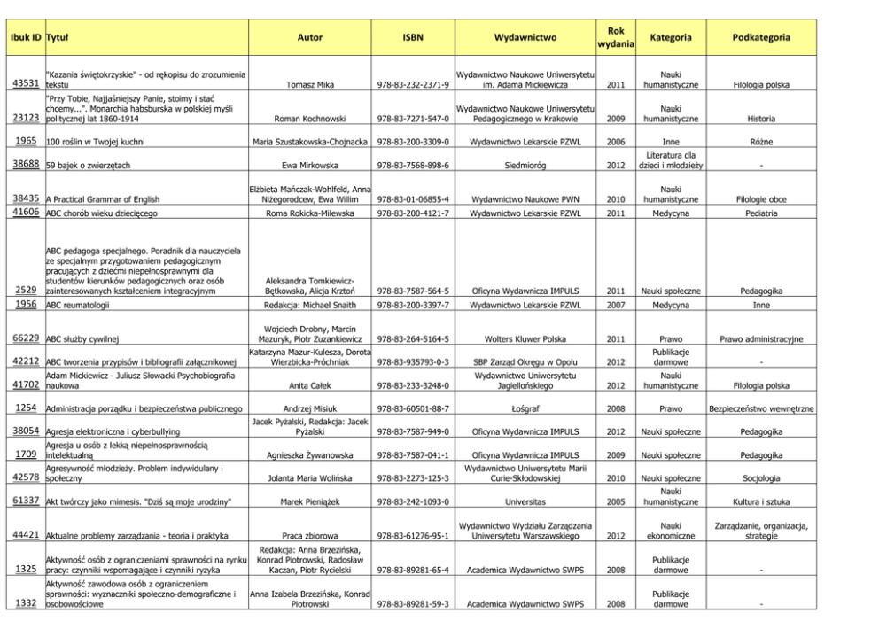 Ibuk ID Tytuł 43531 "Kazania świętokrzyskie" - od rękopisu do zrozumienia tekstu 23123 "Przy Tobie, Najjaśniejszy Panie, stoimy i stać chcemy...". Monarchia habsburska w polskiej myśli politycznej lat 1860-1914 1965 100 roślin w Twojej kuchni 38688 59 bajek o zwierzętach 38435 41606 A Practical Grammar of English 2529 1956 66229 978-83-232-2371-9 Wydawnictwo Naukowe Uniwersytetu im. Adama Mickiewicza Roman Kochnowski 978-83-7271-547-0 Maria Szustakowska-Chojnacka 978-83-200-3309-0 Ewa Mirkowska 978-83-7568-898-6 Elżbieta Mańczak-Wohlfeld, Anna Niżegorodcew, Ewa Willim 978-83-01-06855-4 Kategoria Podkategoria 2011 Nauki humanistyczne Filologia polska Wydawnictwo Naukowe Uniwersytetu Pedagogicznego w Krakowie 2009 Nauki humanistyczne Historia Wydawnictwo Lekarskie PZWL 2006 Inne Różne Siedmioróg 2012 Literatura dla dzieci i młodzieży - Wydawnictwo Naukowe PWN 2010 Nauki humanistyczne Filologie obce Wydawnictwo Lekarskie PZWL 2011 Medycyna Pediatria ABC pedagoga specjalnego. Poradnik dla nauczyciela ze specjalnym przygotowaniem pedagogicznym pracujących z dziećmi niepełnosprawnymi dla studentów kierunków pedagogicznych oraz osób zainteresowanych kształceniem integracyjnym Aleksandra TomkiewiczBętkowska, Alicja Krztoń 978-83-7587-564-5 Oficyna Wydawnicza IMPULS 2011 Nauki społeczne Pedagogika ABC reumatologii Redakcja: Michael Snaith 978-83-200-3397-7 Wydawnictwo Lekarskie PZWL 2007 Medycyna Inne Wojciech Drobny, Marcin Mazuryk, Piotr Zuzankiewicz 978-83-264-5164-5 Wolters Kluwer Polska 2011 Prawo Prawo administracyjne - ABC służby cywilnej 41702 42578 Tomasz Mika Rok wydania 978-83-200-4121-7 Adam Mickiewicz - Juliusz Słowacki Psychobiografia naukowa 1709 Wydawnictwo Roma Rokicka-Milewska ABC tworzenia przypisów i bibliografii załącznikowej 38054 ISBN ABC chorób wieku dziecięcego 42212 1254 Autor Administracja porządku i bezpieczeństwa publicznego Agresja elektroniczna i cyberbullying Agresja u osób z lekką niepełnosprawnością intelektualną Agresywność młodzieży. Problem indywidulany i społeczny Katarzyna Mazur-Kulesza, Dorota Wierzbicka-Próchniak 978-83-935793-0-3 SBP Zarząd Okręgu w Opolu Anita Całek 978-83-233-3248-0 Wydawnictwo Uniwersytetu Jagiellońskiego 2012 Publikacje darmowe 2012 Nauki humanistyczne Filologia polska Andrzej Misiuk 978-83-60501-88-7 Łośgraf 2008 Prawo Bezpieczeństwo wewnętrzne Jacek Pyżalski, Redakcja: Jacek Pyżalski 978-83-7587-949-0 Oficyna Wydawnicza IMPULS 2012 Nauki społeczne Pedagogika Agnieszka Żywanowska 978-83-7587-041-1 Oficyna Wydawnicza IMPULS 2009 Nauki społeczne Pedagogika 978-83-2273-125-3 Wydawnictwo Uniwersytetu Marii Curie-Skłodowskiej 2010 Nauki społeczne Socjologia Kultura i sztuka Jolanta Maria Wolińska 61337 Akt twórczy jako mimesis. "Dziś są moje urodziny" Marek Pieniążek 978-83-242-1093-0 Universitas 2005 Nauki humanistyczne 44421 Aktualne problemy zarządzania - teoria i praktyka Praca zbiorowa 978-83-61276-95-1 Wydawnictwo Wydziału Zarządzania Uniwersytetu Warszawskiego 2012 Nauki ekonomiczne Zarządzanie, organizacja, strategie Redakcja: Anna Brzezińska, Konrad Piotrowski, Radosław Kaczan, Piotr Rycielski 978-83-89281-65-4 Academica Wydawnictwo SWPS 2008 Publikacje darmowe - Anna Izabela Brzezińska, Konrad Piotrowski 978-83-89281-59-3 Academica Wydawnictwo SWPS 2008 Publikacje darmowe - 1325 Aktywność osób z ograniczeniami sprawności na rynku pracy: czynniki wspomagające i czynniki ryzyka 1332 Aktywność zawodowa osób z ograniczeniem sprawności: wyznaczniki społeczno-demograficzne i osobowościowe 65912 Algebra dla studentów 1160 Algebra z geometrią analityczną 1082 Algorytmika praktyczna Julian Klukowski, Ireneusz Nabiałek 978-83-7926-034-8 Wydawnictwo WNT 2013 Nauki matematycznoprzyrodnicze Matematyka Matematyka Przemysław Kajetanowicz, Jędrzej Wierzejewski 978-83-01-15493-6 Wydawnictwo Naukowe PWN 2008 Nauki matematycznoprzyrodnicze Piotr Stańczyk 978-83-01-15821-7 Wydawnictwo Naukowe PWN 2009 Informatyka Programowanie 521 Algorytmy genetyczne. Kompendium, t. 1 Tomasz Dominik Gwiazda 978-83-01-15168-3 Wydawnictwo Naukowe PWN 2009 Informatyka Programowanie 522 Algorytmy genetyczne. Kompendium, t. 2 Tomasz Dominik Gwiazda 978-83-01-15381-6 Wydawnictwo Naukowe PWN 2007 Informatyka Programowanie Magdalena Lewańska 978-83-63080-48-8 Wydawnictwo e-bookowo 2012 Literatura kobieca - Wiktor Osiatyński 978-83-244-0222-9 Iskry 2005 Poradniki - Agnieszka Przybylska 978-83-930628-2-9 Landie 2010 Sport - 2008 Nauki ekonomiczne Finanse i bankowość 2009 Nauki ekonomiczne Finanse i bankowość 2009 Nauki matematycznoprzyrodnicze Matematyka Matematyka 37888 42002 2958 469 2307 468 1373 42422 41518 41412 41434 Alina, alinka Alkoholizm Alpy i Dolomity, czyli gdzie warto jechać? Analiza finansowa przedsiębiorstwa Analiza finansowa w procesie decyzyjnym współczesnego przedsiębiorstwa Analiza funkcjonalna w zadaniach Analiza matematyczna Analiza różnicująca wybranych zespołów zaburzeń autystycznych Bożyna Pomykalska, Przemysław Pomykalski 978-83-01-14871-3 Redakcja: Gabriela Łukasik Adam Stachura, Stanisław Prus 978-83-7246-429-3 978-83-01-15228-4 Wydawnictwo Naukowe PWN Wydawnictwo Uniwersytetu Ekonomicznego w Katowicach Wydawnictwo Naukowe PWN Witold Kołodziej 978-83-01-15970-2 2009 Nauki matematycznoprzyrodnicze Jacek Błeszyński Wydawnictwo Naukowe Uniwersytetu 978-83-231-2600-3 Mikołaja Kopernika Wydawnictwo Naukowe PWN 2010 Nauki społeczne Pedagogika Anatomia człowieka t.1 Olgierd Narkiewicz 978-83-200-4106-4 Wydawnictwo Lekarskie PZWL 2010 Medycyna Anatomia Anatomia człowieka t.3 Olgierd Narkiewicz 978-83-200-4108-8 Wydawnictwo Lekarskie PZWL 2010 Medycyna Anatomia Anatomia człowieka t.4 Olgierd Narkiewicz 978-83-200-4109-5 Wydawnictwo Lekarskie PZWL 2010 Medycyna Anatomia 41601 Anestezja geriatryczna Redakcja: Laura Wołowicka, Iwona Trojanowska 978-83-200-3813-2 Wydawnictwo Lekarskie PZWL 2010 Medycyna Anestezjologia 41797 Angielski dl