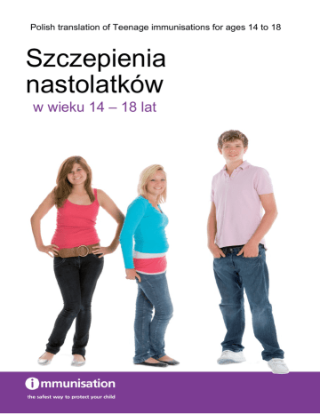 Polish translation of Teenage immunisations for ages 14 to 18 Szczepienia nastolatków w wieku 14 – 18 lat Wstęp Niniejszy przewodnik jest skierowany do nastolatków w wieku 14 – 18 lat i ich rodziców. Omówiono w nim: • szczepienia podawane nastolatkom, zazwyczaj jeszcze w trakcie nauki w szkole; • dlaczego szczepienia są potrzebne; • dlaczego obecnie podaje się nastolatkom szczepionkę MenACWY; • efekty uboczne mogące towarzyszyć szczepieniu. Ponadto przewodnik zawiera odpowiedzi na kilka najczęściej zadawanych pytań na temat tych szczepień. Aby uzyskać odpowiedzi na pytania lub dowiedzieć się więcej, porozmawiaj z pielęgniarką szkolną, lekarzem lub pielęgniarką w przychodni. Informacje znajdziesz również na stronach www.publichealth.hscni.net i www.nhs.uk/vaccinations 2 Po co nam szczepienia? Dzięki ogólnokrajowemu programowi szczepień udało się praktycznie zwalczyć występowanie na terenie Zjednoczonego Królestwa tak niebezpiecznych chorób, jak tężec, błonica czy polioJednak choroby te mogą powrócić, ponieważ wciąż występują jeszcze w Europie i innych częściach świata. Dlatego niezmiernie ważne jest, aby się przed nimi chronić. W Zjednoczonym Królestwie większość tych chorób jest kontrolowana dzięki wysokiemu odsetkowi osób zaszczepionych. Jak działa szczepionka? Szczepionki zawierają niewielkie ilości bakterii lub wirusów chorobotwórczych lub minimalne ilości związków chemicznych wytwarzanych przez dane bakterie. Działanie szczepionki polega na pobudzeniu układu odpornościowego organizmu do wytworzenia przeciwciał, czyli substancji zwalczających infekcje i choroby. Następnie w przypadku infekcji przeciwciała rozpoznają zagrożenie i chronią organizm. Szczepionka Td/IPV Podawana w formie połączonej szczepionka Td/IPV przedłuża ochronę uzyskaną w wieku dziecięcym przeciw takim chorobom, jak tężec (T – tetanus), błonica (d – diphtheria) i polio (IPV – inaktywowany wirus polio). Przed jakimi chorobami chroni Td/IPV? Tężec Tężec to bolesna choroba, która atakuje mięśnie i może powodować problemy z oddychaniem. Choroba atakuje układ nerwowy i może być śmiertelna. Do zakażenia tężcem dochodzi w wyniku przeniknięcia do ciała przez otwarte rany lub poparzenia bakterii bytujących w ziemi lub nawozie. Choroba nie przenosi się między osobami, ale wywołujące ją drobnoustroje są zawsze obecne w ziemi, nawet w tym kraju. Błonica Błonica to poważna choroba. Zazwyczaj rozpoczyna się od bólu gardła, jednak może szybko powodować problemy oddechowe. Choroba może powodować uszkodzenie serca i układu nerwowego, a w poważnych przypadkach nawet śmierć. Przed wprowadzeniem szczepionki w Irlandii Północnej każdego roku na błonicę zapadało nawet 1,5 tysiąca osób. Polio Wirus polio atakuje system nerwowy i może wywołać trwały paraliż mięśni. Choroba może być śmiertelna w przypadku objęcia mięśni klatki piersiowej lub mózgu. Przed wprowadzeniem szczepienia przeciwko polio każdego roku w Irlandii Północnej odnotowywano nawet 1,5 tysiąca przypadków zachorowań na polio. 3 Czy szczepionka przeciw tężcowi, błonicy i polio podana mi w wieku dziecięcym w dalszym ciągu mnie chroni? W pewnym stopniu ochrona może wciąż działać. Aby jednak ukończyć program szczepień rutynowych i zagwarantować sobie długotrwałą ochronę, należy przyjąć również tę dawkę przypominającą. Ile dawek przypominających należy przyjąć? Aby zbudować i utrzymać odporność, należy przyjąć łącznie 5 dawek szczepionki przeciw tężcowi, błonicy i polio. Schemat szczepienia: • pierwsze trzy dawki w wieku niemowlęcym; • czwarta dawka między 3. a 5. rokiem życia, przed rozpoczęciem nauki w szkole; • piąta dawka teraz. Przyjęcie 5 dawek szczepionki przeciw tężcowi, błonicy i polio wystarcza zazwyczaj na całe życie. Jednak w przypadku wyjazdu na teren określonych państw może być konieczne przyjęcie dodatkowych dawek. Informacje na ten temat można uzyskać u pielęgniarki w poradni zdrowia. Jeżeli podejrzewasz pominięcie którejkolwiek dawki, zwróć się z tym do pielęgniarki szkolnej lub lekarza Szczepionka MenACWY Co to jest choroba meningokokowa? Choroba meningokokowa to rzadka, ale zagrażająca życiu choroba wywoływana przez meningokoki. Bakterie te zostały sklasyfikowane w kilku grupach. Najczęściej występujące grupy to A, B, C, W i Y. Największe ryzyko choroby meningokokowej dotyczy niemowląt, małych dzieci, nastolatków i młodych osób dorosłych. Dlaczego mam przyjąć szczepionkę MenACWY właśnie teraz? Szczepionka MenACWY chroni przed chorobą wywoływaną przez meningokoki z grupy A, C, W i Y. W ostatnich latach w Zjednoczonym Królestwie nastąpił znaczny wzrost zachorowalności na chorobę wywoływaną przez grupę W, odnotowano nawet kilka przypadków śmiertelnych wśród niemowląt i nastolatków. Starsze nastolatki są w grupie podwyższonego ryzyka zachorowania na chorobę wywoływaną meningokokami z grupy W. Dlatego też szczepienie jest konieczne, aby się przed nią chronić. Od czasu wprowadzenia w 1999 roku szczepionki MenC choroba wywoływana meningokokami z grupy C występuje znacznie rzadziej. Jednakże ochrona zapewniona dawkami szczepionki MenC przyjętej w wieku niemowlęcym słabnie u nastolatków. Dlatego należy przyjąć dawkę przypominającą. Szczepionka MenACWY chroni przed meningokokami z grup A, W i Y, a ponadto przedłuża ochronę przed chorobą wywoływaną przez MenC. Szczepienie zmniejsza również ryzyko nosicielstwa bakterii, co chroni osoby w twoim otoczeniu. 8 4 Często zadawane pytania W jakiej formie otrzymam szczepionkę? Każda szczepionka to jeden zastrzyk w górną część ramienia. Nikt nie lubi zastrzyków, jednak wkłucie trwa bardzo krótko. Używa się do tego małej igły, więc poczujesz zaledwie niewielkie ukłucie. Jeżeli denerwujesz się przed zastrzyk