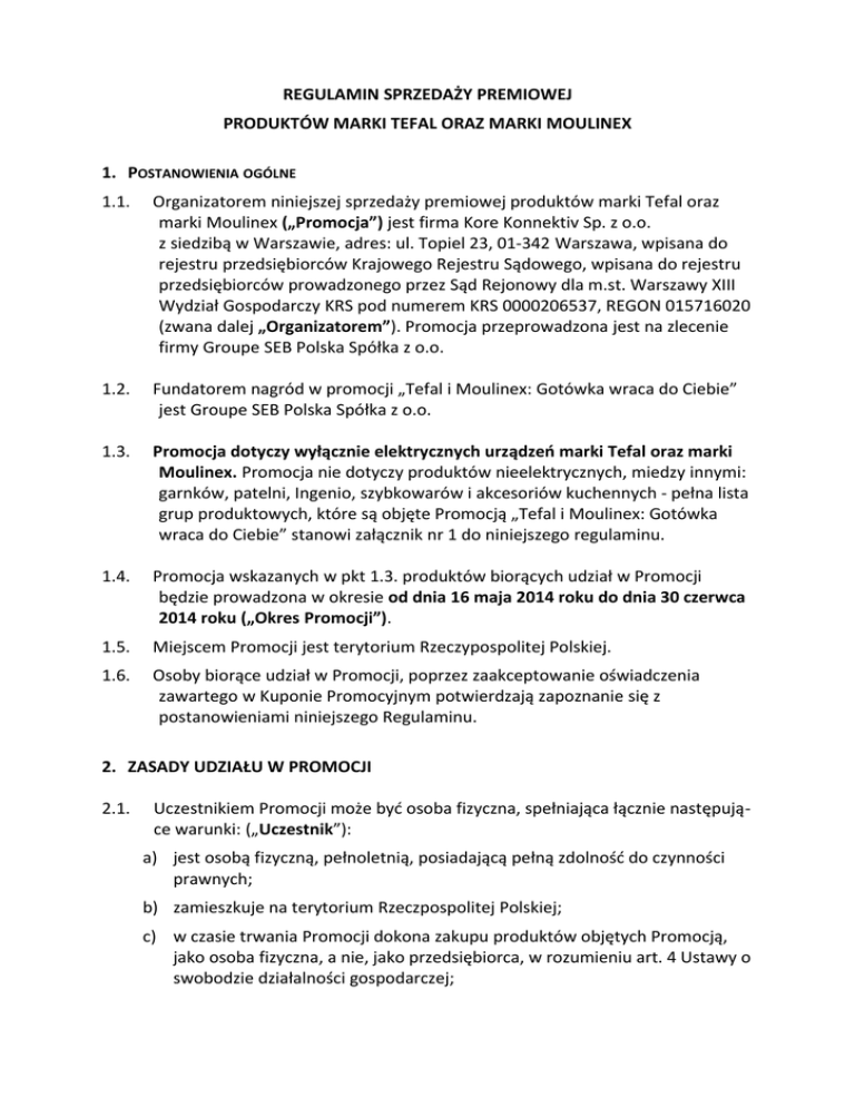 REGULAMIN SPRZEDAŻY PREMIOWEJ PRODUKTÓW MARKI TEFAL ORAZ MARKI MOULINEX 1. POSTANOWIENIA OGÓLNE 1.1. Organizatorem niniejszej sprzedaży premiowej produktów marki Tefal oraz marki Moulinex („Promocja”) jest firma Kore Konnektiv Sp. z o.o. z siedzibą w Warszawie, adres: ul. Topiel 23, 01-342 Warszawa, wpisana do rejestru przedsiębiorców Krajowego Rejestru Sądowego, wpisana do rejestru przedsiębiorców prowadzonego przez Sąd Rejonowy dla m.st. Warszawy XIII Wydział Gospodarczy KRS pod numerem KRS 0000206537, REGON 015716020 (zwana dalej „Organizatorem”). Promocja przeprowadzona jest na zlecenie firmy Groupe SEB Polska Spółka z o.o. 1.2. Fundatorem nagród w promocji „Tefal i Moulinex: Gotówka wraca do Ciebie” jest Groupe SEB Polska Spółka z o.o. 1.3. Promocja dotyczy wyłącznie elektrycznych urządzeń marki Tefal oraz marki Moulinex. Promocja nie dotyczy produktów nieelektrycznych, miedzy innymi: garnków, patelni, Ingenio, szybkowarów i akcesoriów kuchennych - pełna lista grup produktowych, które są objęte Promocją „Tefal i Moulinex: Gotówka wraca do Ciebie” stanowi załącznik nr 1 do niniejszego regulaminu. 1.4. Promocja wskazanych w pkt 1.3. produktów biorących udział w Promocji będzie prowadzona w okresie od dnia 16 maja 2014 roku do dnia 30 czerwca 2014 roku („Okres Promocji”). 1.5. Miejscem Promocji jest terytorium Rzeczypospolitej Polskiej. 1.6. Osoby biorące udział w Promocji, poprzez zaakceptowanie oświadczenia zawartego w Kuponie Promocyjnym potwierdzają zapoznanie się z postanowieniami niniejszego Regulaminu. 2. ZASADY UDZIAŁU W PROMOCJI 2.1. Uczestnikiem Promocji może być osoba fizyczna, spełniająca łącznie następujące warunki: („Uczestnik”): a) jest osobą fizyczną, pełnoletnią, posiadającą pełną zdolność do czynności prawnych; b) zamieszkuje na terytorium Rzeczpospolitej Polskiej; c) w czasie trwania Promocji dokona zakupu produktów objętych Promocją, jako osoba fizyczna, a nie, jako przedsiębiorca, w rozumieniu art. 4 Ustawy o swobodzie działalności gospodarczej; d) dokonuje zakupu produktów objętych promocją do użytku własnego, niezwiązanego z prowadzeniem działalności gospodarczej, w punkcie handlu detalicznego; e) spełni określone w niniejszym Regulaminie warunki, opisane w punktach 2.5-2.12; f) wypełni i wyśle Kupon Promocyjny, zgodnie z postanowieniami Regulaminu. 2.2. W promocji nie mogą brać udziału pracownicy i przedstawiciele Organizatora Promocji, pracownicy i przedstawiciele firmy Groupe SEB Polska Sp. z o.o. oraz inne osoby, które w jakikolwiek sposób brały udział w organizacji oraz przeprowadzeniu Promocji. 2.3. W promocji nie mogą brać udziału także członkowie najbliższej rodziny osób wymienionych w pkt 2.2. Przez członków najbliższej rodziny rozumie się wstępnych, zstępnych, rodzeństwo, małżonków, małżonków rodzeństwa, rodziców małżonków, kuzynów i osoby pozostające w stosunku przysposobienia. 2.4. Uczestnictwo w Promocji jest dobrowolne. 2.5. Każdy Uczestnik może wziąć udział w Promocji dowolną ilość razy, za każdym razem musi wypełnić warunki określone w niniejszym Regulaminie opisane w punktach 2.5 -2.18. 2.6. Warunkiem koniecznym udziału w Promocji jest zakup przez Uczestnika w sprzedaży detalicznej w Okresie Promocji jednego z produktów marki Tefal bądź marki Moulinex objętych promocją, jak również spełnienia warunków Promocji określonych w niniejszym Regulaminie. 2.7. Uczestnik Promocji, który w Okresie Promocji zakupi produkt marki Tefal bądź marki Moulinex objęty promocją uzyska zwrot w wysokości 20% wartości brutto zakupu określonego produktu. Zakup produktu promocyjnego musi być udokumentowany dowodem zakupu (paragon; faktura imienna). 2.8. Nabywca urządzenia objętego promocją nie nabywa prawa do otrzymania zwrotu gotówki w wysokości 20% od ceny brutto, w przypadku odstąpienia od umowy nabycia urządzenia lub jego zwrotu przed przekazaniem nagrody. 2.9. W celu otrzymania nagrody opisanej w punkcie 2.7. powyżej, Uczestnik Promocji zobowiązany jest wypełnić w całości i czytelnie kupon promocyjny („Kupon Promocyjny”), który jest dostępny na ulotce promocyjnej dostępnej w sklepach lub na stronie internetowej www.gotowkawraca.pl do wydrukowania, a następnie Uczestnik jest zobligowany przesłać: 1. wypełniony Kupon Promocyjny 2. czytelną kserokopię dowodu zakupu w Okresie Promocji produktu objętego Promocją 3. kod kreskowy EAN, wycięty z opakowania produktu objętego Promocją, listem w terminie 14 dni kalendarzowych liczonych od dnia zakupu (decyduje data nadania listu), na adres: Kore Konnektiv Sp. z o.o. ul. Topiel 23; 01 -342 Warszawa z dopiskiem „Promocja 20% zwrotu” 2.10. Dane osobowe kupującego wskazane na dowodzie zakupu (fakturze imiennej), której kserokopia została dołączona do Kuponu Promocyjnego muszą być takie same jak dane Uczestnika promocji wskazane na Kuponie Promocyjnym. 2.11. Koszty przesłania zgłoszenia opisanego w pkt 2.9 niniejszego Regulaminu pokrywa Uczestnik Promocji. 2.12. Udział w Promocji biorą tylko poprawne i w całości wypełnione Kupony Promocyjne, tj. Kupony, które spełniają wymagania wskazane w pkt 2.8-2.10 powyżej. 2.13. Uczestnik zobowiązany jest do zachowania oryginału dowodu zakupu produktu Tefal lub produktu Moulinex objętego Promocją. W przypadku wątpliwości Organizatora, co do autentyczności dowodu zakupu, Uczestnik zobowiązany jest do przesłania oryginału dowodu zakupu na żądanie Organizatora w celu weryfikacji autentyczności dowodu zakupu. Koszty przesyłki ponosi Uczestnik. Po zweryfikowaniu autentyczności dowodu zakupu, Organizator odsyła oryginał dowodu zakupu Uczestnikowi. 2.14. Po otrzymaniu przez Organizatora poprawnego i kompletnego zgłoszenia, na które składa się: prawidłowo i czytelnie wypełniony Kupon Promocyjny, kserokopia dowodu zakupu produktu marki Tefal lub marki Moulin