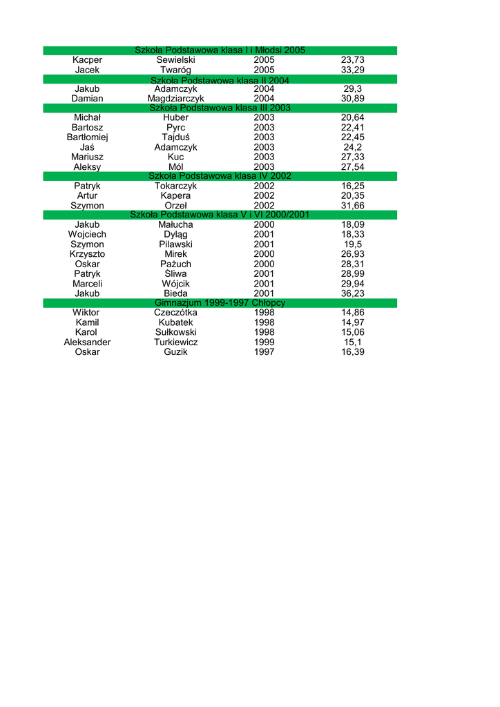 Kacper Jacek Jakub Damian Michał Bartosz Bartłomiej Jaś Mariusz Aleksy Patryk Artur Szymon Jakub Wojciech Szymon Krzyszto Oskar Patryk Marceli Jakub Wiktor Kamil Karol Aleksander Oskar Szkoła Podstawowa klasa I i Młodsi 2005 Sewielski 2005 Twaróg 2005 Szkoła Podstawowa klasa II 2004 Adamczyk 2004 Magdziarczyk 2004 Szkoła Podstawowa klasa III 2003 Huber 2003 Pyrc 2003 Tajduś 2003 Adamczyk 2003 Kuc 2003 Mól 2003 Szkoła Podstawowa klasa IV 2002 Tokarczyk 2002 Kapera 2002 Orzeł 2002 Szkoła Podstawowa klasa V i VI 2000/2001 Małucha 2000 Dyląg 2001 Pilawski 2001 Mirek 2000 Pażuch 2000 Śliwa 2001 Wójcik 2001 Bieda 2001 Gimnazjum 1999-1997 Chłopcy Czeczótka 1998 Kubatek 1998 Sułkowski 1998 Turkiewicz 1999 Guzik 1997 23,73 33,29 29,3 30,89 20,64 22,41 22,45 24,2 27,33 27,54 16,25 20,35 31,66 18,09 18,33 19,5 26,93 28,31 28,99 29,94 36,23 14,86 14,97 15,06 15,1 16,39