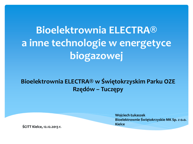 Bioelektrownia ELECTRA® a inne technologie w energetyce biogazowej Bioelektrownia ELECTRA® w Świętokrzyskim Parku OZE Rzędów – Tuczępy ŚCITT Kielce, 12.12.2013 r. Wojciech Łukaszek Bioelektrownie Świętokrzyskie MK Sp. z o.o. Kielce Co to jest bioelektrownia (biogazownia) wie w Polsce niemal każde dziecko, ale jak działa i czym różnią się poszczególne technologie nie orientują się nawet dorośli, często również ci, którzy energetyką odnawialną zajmują się profesjonalnie. Zatem od początku. Bioelektrownia (biogazownia) to ........ betonowa krowa. W komorach fermentacyjnych przebiega taki sam proces fermentacji jak w żołądku tego sympatycznego stworzenia. Efektem fermentacji jest w obu przypadkach biogaz i niestrawione pozostałości organiczne: u krowy – kupa, w bioelektrowni masa pofermentacyjna. Aktualnie na świecie pracuje około 40 mln bioelektrowni i biogazowni. Najwięcej – ponad 30 mln – pracuje w Chinach, pozostałe w Indiach, Nepalu i Bangladeszu, Wietnamie, Tajlandii, Korei Południowej. Są to „plecakowe” i przydomowe biogazownie o mocy elektrycznej od kilkudziesięciu watów do kilkunastu kilowatów. Najbardziej rozwinięte technologicznie bioelektrownie i biogazownie powstają w Niemczech, które są światowym potentatem energetyki biogazowej. Czynnych jest tam (listopad 2013) 7.964 bioelektrowni i biogazowni w większości o mocach od 250 do 1.000 kW. Największa w Penkun ma łączną moc elektryczną 20 MW (40 x 0,5 MW) W Polsce pracują 37 bioelektrownie, 11 jest w trakcie realizacji a około 70 na etapie projektowania Wszystkie czynne bioelektrownie w Polsce, zaprojektowano w niemieckiej technologii NaWaRo lub jej hybrydach Bioelektrownia zrealizowana w technologii NaWaRo Fermentacja dwuetapowa, ze zbiornikami dogazowującymi i zbiornikiem magazynowym. Wylewanie ciekłego pofermentu na pola. Polską przeciwwagą jest bioelektrownia realizowana w technologii ELECTRA® Fermentacja jednoetapowa, bez zbiorników dogazowujących i magazynowych. Produkcja z pofermentu nawozu organicznego . BIOELEKTROWNIA ELECTRA® jest jednym z najnowocześniejszych rozwiązań zarówno pod względem technologicznym jak i konstrukcyjnym jest zgłoszona w Urzędzie Patentowym RP (nr W.121256) przez Konsorcjum Projektowo – Wykonawcze EKOENERGIA – TERMO-KLIMA MK produkuje energię elektryczną i granulowany nawóz organiczny nie generuje żadnych odpadów – wszystkie powstające w procesie produkty uboczne (siarka i retentat z dużą zawartością azotu) wykorzystane są do produkcji nawozu woda wykorzystana jest w obiegu zamkniętym jest technologią hermetyczną – nie wytwarza żadnych odorów przygotowanie wsadu odbywa się w mikronizerze uzyskując cząsteczki substratu wielkości 10 – 180 mikrometrów z rozbitą błoną komórkową, dzięki czemu kilkusetkrotnie zwiększa się powierzchnię substratu do zgazowania jest bioelektrownią o technologii jednoetapowej – nie ma zbiorników dogazowujących oraz magazynowych i nie pozostawia inwestora z osadem pofermentacyjnym „do wylania na pole” pozwala na wymienne stosowanie substratów organicznych w zależności od ich dostępności ze zmianami recepturowymi w bardzo krótkim okresie bez zasadniczego wpływu na proces fermentacji W komorze fermentacyjnej kontrolujemy proces mieszania i utrzymania substratu w postaci mieszaniny jednorodnej przy pomocy przemysłowego tomografu komputerowego jest technologią mało energochłonną – na własne potrzeby zużywa około 8 - 12 % wyprodukowanej energii pracuje na mieszankach biomasy pochodzenia roślinnego (kiszonki, zielonki), zwierzęcego (odchody na ściółce, gnojowice, odpady poubojowe), oraz odpadach poprodukcyjnych przemysłu rolno – spożywczego (wywar gorzelniany, serwatka, wytłoki, wysłodki, makuch rzepakowy, gliceryna odpady owoców i warzyw itd.) Bioelektrownia ELECTRA ® (Urząd Patentowy RP – nr W.121256), polska instalacja do produkcji energii elektrycznej z biogazu wytworzonego z biomasy organicznej w większości pochodzenia rolniczego i granulowanego substytutu nawozu organicznego, jest rozwiązaniem które na bieżąco uzupełniane jest o najnowsze osiągnięcia techniczne przydatne w instalacji. Substraty: Przygotowanie substratów do fermentacji W ELECTRZE ® jako jednej z pierwszych bioelektrowni w Europie, kilkanaście lat temu, przyjęto zasadę odwadniania osadu pofermentacyjnego i produkowania z niego granulowanego substytutu nawozu organicznego. W produkcji tej wykorzystuje się zarówno siarkę otrzymywaną przy odsiarczaniu biogazu (mokrą metodą BIOSULFEX autorstwa polskiej firmy PROMIS) jak i koncentrat retentatu, otrzymywany w mikrooczyszczalni (stanowiącej stały element bioelektrowni ELECTRA ®). Mikrooczyszczalnia pracuje w technologii odwróconej osmozy i jest wykorzystywana przy oczyszczaniu awaryjnego zrzutu części wody nadosadowej (przy zagrożeniu przekroczenia dopuszczalnego progu azotowego w komorze fermentacyjnej). Bioelektrownia ELECTRA ® jest również jedyną instalacją gdzie w komorach fermentacyjnych zastosuje się mieszadło szczelinowe, dzięki któremu nie tylko „dokładniej” wygazowuje się substraty, ale również bezproblemowo usuwa się z komory fermentacyjnej mineralną zastoinę przydenną. W lipcu 2012 r. do bioelektrowni ELECTRA ® wprowadzono nowatorskie rozwiązania stanowiące innowacje w skali światowej. Są to urządzenia do mikronizacji substratu przygotowywanego do wprowadzenia do komory fermentacyjnej oraz metoda tomograficznego monitorowania, wizualizacji i optymalizacji procesu mieszania wielofazowego w komorze fermentacyjnej. Autorem pierwszego rozwiązania (mikronizer) jest emerytowany prof. dr hab. inż. Marian Mazurkiewicz z University of Science & Technology Rolla – Missouri w USA oraz PL-USA Centrum Badawczo – Rozwojowe Nowych Technologii w Lubaniu zaś tomograf w komorze fermentacyjnej to dzieło doc. dr hab. inż. Romana Szabatina z Politechnik