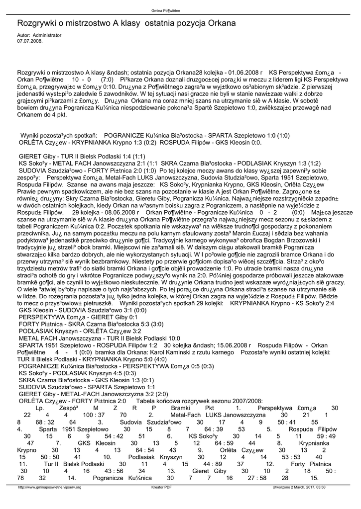 Gmina Po¶wiêtne Rozgrywki o mistrzostwo A klasy ostatnia pozycja Orkana Autor: Administrator 07.07.2008. Rozgrywki o mistrzostwo A klasy – ostatnia pozycja Orkana28 kolejka - 01.06.2008 r KS Perspektywa £om¿a Orkan Po¶wiêtne 10 - 0 (7:0) Pi³karze Orkana doznali druzgoc±cej pora¿ki w meczu z liderem ligi KS Perspektywa £om¿a, przegrywaj±c w £om¿y 0:10. Dru¿yna z Po¶wiêtnego zagra³a w wyj±tkowo os³abionym sk³adzie. Z pierwszej jedenastki wyst±pi³o zaledwie 5 zawodników. W tej sytuacji nasi gracze nie byli w stanie nawi±zaæ walki z dobrze graj±cymi pi³karzami z £om¿y. Dru¿yna Orkana ma coraz mniej szans na utrzymanie siê w A klasie. W sobotê bowiem dru¿yna Pogranicza Ku¼nica niespodziewanie pokona³a Spartê Szepietowo 1:0, zwiêkszaj±c przewagê nad Orkanem do 4 pkt. Wyniki pozosta³ych spotkañ: POGRANICZE Ku¼nica Bia³ostocka - SPARTA Szepietowo 1:0 (1:0) ORLÊTA Czy¿ew - KRYPNIANKA Krypno 1:3 (0:2) ROSPUDA Filipów - GKS Kleosin 0:0. GIERET Giby - TUR II Bielsk Podlaski 1:4 (1:1) KS Soko³y - METAL FACH Janowszczyzna 2:1 (1:1 SKRA Czarna Bia³ostocka - PODLASIAK Knyszyn 1:3 (1:2) SUDOVIA Szudzia³owo - FORTY Pi±tnica 2:0 (1:0) Po tej kolejce meczy awans do klasy wy¿szej zapewni³y sobie zespo³y: Perspektywa £om¿a, Metal-Fach LUKS Janowszczyzna, Sudovia Studzia³owo, Sparta 1951 Szepietowo, Rospuda Filipów. Szanse na awans maja jeszcze: KS Soko³y, Krypnianka Krypno, GKS Kleosin, Orlêta Czy¿ew Prawie pewnym spadkowiczem, ale nie bez szans na pozostanie w klasie A jest Orkan Po¶wiêtne. Zagro¿one s± równie¿ dru¿yny: Skry Czarna Bia³ostocka, Gieretu Giby, Pogranicza Ku¼nica. Najwa¿niejsze rozstrzygniêcia zapadn± w dwóch ostatnich kolejkach, kiedy Orkan na w³asnym boisku zagra z Pograniczem, a nastêpnie na wyje¼dzie z Rospud± Filipów. 29 kolejka - 08.06.2008 r Orkan Po¶wiêtne - Pogranicze Ku¼nica 0 - 2 (0:0) Maj±ca jeszcze szanse na utrzymanie siê w A klasie dru¿yna Orkana Po¶wiêtne przegra³a najwa¿niejszy mecz sezonu z s±siadem z tabeli Pograniczem Ku¼nica 0:2. Pocz±tek spotkania nie wskazywa³ na wiêksze trudno¶ci gospodarzy z pokonaniem przeciwnika. Ju¿ na samym pocz±tku meczu na polu karnym sfaulowany zosta³ Marcin £uczaj i sêdzia bez wahania podyktowa³ jedenastkê przeciwko dru¿ynie go¶ci. Tradycyjnie karnego wykonywa³ obroñca Bogdan Brzozowski i tradycyjnie ju¿ strzeli³ obok bramki. Miejscowi nie za³amali siê. W dalszym ci±gu atakowali bramkê Pogranicza stwarzaj±c kilka bardzo dobrych, ale nie wykorzystanych sytuacji. W I po³owie go¶cie nie zagrozili bramce Orkana i do przerwy utrzyma³ siê wynik bezbramkowy. Niestety po przerwie go¶ciom dopisa³o wiêcej szczê¶cia. Strza³ z oko³o trzydziestu metrów trafi³ do siatki bramki Orkana i go¶cie objêli prowadzenie 1:0. Po utracie bramki nasza dru¿yna straci³a ochotê do gry i wkrótce Pogranicze podwy¿szy³o wynik na 2:0. Pó¼niej gospodarze próbowali jeszcze atakowaæ bramkê go¶ci, ale czynili to wyj±tkowo nieskutecznie. W dru¿ynie Orkana trudno jest wskazaæ wyró¿niaj±cych siê graczy. O wiele ³atwiej by³oby napisaæ o tych najs³abszych. Po tej pora¿ce dru¿yna Orkana straci³a szanse na utrzymanie siê w lidze. Do rozegrania pozosta³a ju¿ tylko jedna kolejka, w której Orkan zagra na wyje¼dzie z Rospud± Filipów. Bêdzie to mecz o przys³owiow± pietruszkê. Wyniki pozosta³ych spotkañ 29 kolejki: KRYPNIANKA Krypno - KS Soko³y 2:4 GKS Kleosin - SUDOVIA Szudzia³owo 3:1 (0:0) PERSPEKTYWA £om¿a - GIERET Giby 0:1 FORTY Pi±tnica - SKRA Czarna Bia³ostocka 5:3 (3:0) PODLASIAK Knyszyn - ORLÊTA Czy¿ew 3:2 METAL FACH Janowszczyzna - TUR II Bielsk Podlaski 10:0 SPARTA 1951 Szepietowo - ROSPUDA Filipów 1:2 30 kolejka – 15.06.2008 r Rospuda Filipów - Orkan Po¶wiêtne 4 - 1 (0:0) bramka dla Orkana: Karol Kaminski z rzutu karnego Pozosta³e wyniki ostatniej kolejki: TUR II Bielsk Podlaski - KRYPNIANKA Krypno 5:0 (4:0) POGRANICZE Ku¼nica Bia³ostocka - PERSPEKTYWA £om¿a 0:5 (0:3) KS Soko³y - PODLASIAK Knyszyn 4:5 (0:3) SKRA Czarna Bia³ostocka - GKS Kleosin 1:3 (0:1) SUDOVIA Szudzia³owo - SPARTA Szepietowo 1:1 GIERET Giby - METAL-FACH Janowszczyzna 3:2 (2:0) ORLÊTA Czy¿ew - FORTY Pi±tnica 2:0 Tabela koñcowa rozgrywek sezonu 2007/2008: Lp. Zespó³ M Z R P Bramki Pkt 1. Perspektywa £om¿a 30 22 4 4 100 : 37 70 2. Metal-Fach LUKS Janowszczyzna 30 21 1 8 68 : 32 64 3. Sudovia Szudzia³owo 30 17 4 9 50 : 41 55 4. Sparta 1951 Szepietowo 30 15 8 7 64 : 39 53 5. Rospuda Filipów 30 15 6 9 54 : 42 51 6. KS Soko³y 30 14 5 11 59 : 49 47 7. GKS Kleosin 30 13 5 12 64 : 59 44 8. Krypnianka Krypno 30 13 4 13 64 : 54 43 9. Orlêta Czy¿ew 30 13 2 15 50 : 50 41 10. Podlasiak Knyszyn 30 12 4 14 53 : 53 40 11. Tur II Bielsk Podlaski 30 11 4 15 44 : 89 37 12. Forty Piatnica 30 10 4 16 43 : 56 34 13. Gieret Giby 30 10 2 18 50 : 78 32 14. Pogranicze Ku¼nica 30 7 7 16 27 : 58 28 15. http://www.gminaposwietne.vipserv.org Kreator PDF Utworzono 2 March, 2017, 03:50 Gmina Po¶wiêtne Skra Czarna Bia³ostocka 30 8 2 20 41 : 63 26 16. Orkan Poswiêtne 30 5 6 19 29 : 75 21 Do klasy okrêgowej awansowa³o bezpo¶rednio pierwszych sze¶æ dru¿yn. Szansê wykorzystali równie¿ pi³karze GKS Kleosin, którzy tak¿e awansowali, po zwyciêstwie w bara¿u o III ligê MKS Mielnik z Zatok± Braniewo (woj. warmiñsko mazurskie). Przyczyn s³abych wyników zespo³u UKS Orkan w rozgrywkach jest bardzo wiele. Jedn± z nich jest na pewno brak systematycznych treningów. Ale pomimo ich braku zespó³ w kilku meczach pokaza³, i¿ staæ go na dobr± grê i odnoszenie cennych zwyciêstw. Najwiêcej punktów (12 pkt.) dru¿yna zdoby³a w rundzie jesiennej, w okresie, kiedy przez kilka kolejek prowadzi³ j± trener Leszek Piwko. W ca³ym sezonie w dru¿ynie wyst±pi³o ponad dwudziestu graczy. W kilku spotkaniach, z ró¿nych powodów dru¿yna zagra³a jednak w mocno os³abionym sk³adzie, co tak¿e negatywnie odbi³o siê na wynikach (np. 0:10 w 