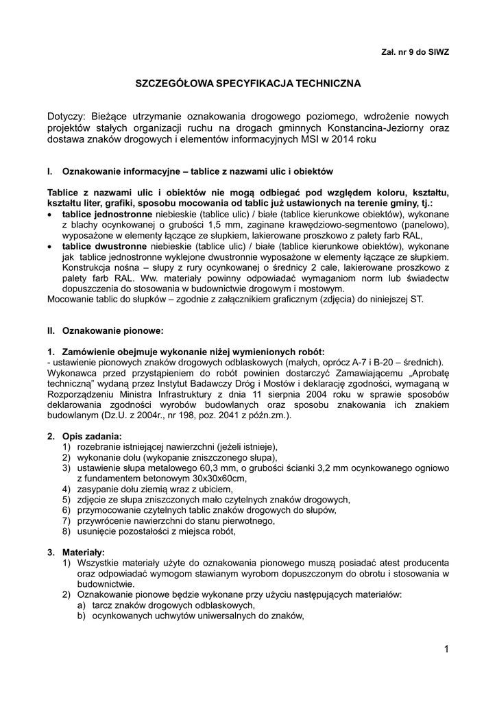 Zał. nr 9 do SIWZ SZCZEGÓŁOWA SPECYFIKACJA TECHNICZNA Dotyczy: Bieżące utrzymanie oznakowania drogowego poziomego, wdrożenie nowych projektów stałych organizacji ruchu na drogach gminnych Konstancina-Jeziorny oraz dostawa znaków drogowych i elementów informacyjnych MSI w 2014 roku I. Oznakowanie informacyjne – tablice z nazwami ulic i obiektów Tablice z nazwami ulic i obiektów nie mogą odbiegać pod względem koloru, kształtu, kształtu liter, grafiki, sposobu mocowania od tablic już ustawionych na terenie gminy, tj.: tablice jednostronne niebieskie (tablice ulic) / białe (tablice kierunkowe obiektów), wykonane z blachy ocynkowanej o grubości 1,5 mm, zaginane krawędziowo-segmentowo (panelowo), wyposażone w elementy łączące ze słupkiem, lakierowane proszkowo z palety farb RAL, tablice dwustronne niebieskie (tablice ulic) / białe (tablice kierunkowe obiektów), wykonane jak tablice jednostronne wyklejone dwustronnie wyposażone w elementy łączące ze słupkiem. Konstrukcja nośna – słupy z rury ocynkowanej o średnicy 2 cale, lakierowane proszkowo z palety farb RAL. Ww. materiały powinny odpowiadać wymaganiom norm lub świadectw dopuszczenia do stosowania w budownictwie drogowym i mostowym. Mocowanie tablic do słupków – zgodnie z załącznikiem graficznym (zdjęcia) do niniejszej ST. II. Oznakowanie pionowe: 1. Zamówienie obejmuje wykonanie niżej wymienionych robót: - ustawienie pionowych znaków drogowych odblaskowych (małych, oprócz A-7 i B-20 – średnich). Wykonawca przed przystąpieniem do robót powinien dostarczyć Zamawiającemu „Aprobatę techniczną” wydaną przez Instytut Badawczy Dróg i Mostów i deklarację zgodności, wymaganą w Rozporządzeniu Ministra Infrastruktury z dnia 11 sierpnia 2004 roku w sprawie sposobów deklarowania zgodności wyrobów budowlanych oraz sposobu znakowania ich znakiem budowlanym (Dz.U. z 2004r., nr 198, poz. 2041 z późn.zm.). 2. Opis zadania: 1) rozebranie istniejącej nawierzchni (jeżeli istnieje), 2) wykonanie dołu (wykopanie zniszczonego słupa), 3) ustawienie słupa metalowego 60,3 mm, o grubości ścianki 3,2 mm ocynkowanego ogniowo z fundamentem betonowym 30x30x60cm, 4) zasypanie dołu ziemią wraz z ubiciem, 5) zdjęcie ze słupa zniszczonych mało czytelnych znaków drogowych, 6) przymocowanie czytelnych tablic znaków drogowych do słupów, 7) przywrócenie nawierzchni do stanu pierwotnego, 8) usunięcie pozostałości z miejsca robót, 3. Materiały: 1) Wszystkie materiały użyte do oznakowania pionowego muszą posiadać atest producenta oraz odpowiadać wymogom stawianym wyrobom dopuszczonym do obrotu i stosowania w budownictwie. 2) Oznakowanie pionowe będzie wykonane przy użyciu następujących materiałów: a) tarcz znaków drogowych odblaskowych, b) ocynkowanych uchwytów uniwersalnych do znaków, 1 c) ocynkowanych ogniowo słupów do znaków 60,3 mm, o grubości ścianki 3,2 mm, d) fundamentu betonowego 30x30x60cm z betonu B 7,5 e) śrub, nakrętek, kształtowników. 3) Wykonanie znaków: a) wszystkie znaki powinny gwarantować właściwą wysoką jakość wykonania, zapewniającego minimum 36 miesięcy gwarancji i posiadać stosowne atesty, b) tła znaków powinny być wykonane z folii odblaskowej 1 generacji (oprócz znaków A-7, B-2, B-20, D-6, D-6a, D-6b, których tła muszą być wykonane z folii odblaskowej 2 generacji), c) wszelkie rodzaje znaków powinny być wykonane na blasze ocynkowanej, d) słupki do zamocowania znaków powinny być ocynkowane, o średnicy i długości zgodnej z wymogami dla tego rodzaju elementów, e) drobne elementy jak śruby, podkładki, kątowniki mocujące, uchwyty powinny być wykonane z blachy ocynkowanej, f) folie odblaskowe użyte do wykonania tarczy powinny wykazywać pełne związanie z płytą znaku przez cały czas deklarowanej trwałości znaku. Niedopuszczalne są lokalne nie doklejenia, odklejenia, złuszczenia lub odstawienie folii na krawędziach tarczy znaku oraz na jego powierzchni. Sposób połączenia folii z powierzchnią płyty znaku powinien uniemożliwiać jej odłączenie od płyty bez jej zniszczenia. Przy malowaniu lub klejeniu symboli lub obrzeży znaków na folii odblaskowej, technologia malowania lub klejenia oraz stosowane w tym celu materiały powinny być uzgodnione z producentem folii. Tylna strona płyty znaków odblaskowych musi być zabezpieczona farbą nieodblaskową barwy ciemno-szarej. Grubość powłoki farby powinna być zgodna z instrukcją o znakach i sygnałach na drodze, g) Na zamocowanie rur znaków drogowych w gruncie należy wykonać fundament betonowy 30x30x60cm. 4. Wykonanie robót: 1) przygotowanie podłoża dla umieszczenia fundamentu betonowego w gruncie polega na wykonaniu wykopu o głębokości uzgodnionej z osobą nadzorującą. Dno wykopu należy wyrównać i zagęścić ubijakiem ręcznym o masie 12-16 kg., 2) w przygotowanym fundamencie betonowym umocować słupki znaków drogowych zgodnie z wymogami dla tego typu elementów. 3) umieszczenie znaków od krawędzi jezdni, wysokość zamocowania znaku, lokalizacja ustawienia znaków powinny być całkowicie zgodne z Rozporządzeniem Ministra Infrastruktury z dnia 3 lipca 2003 roku w sprawie szczegółowych warunków technicznych, dla znaków i sygnałów drogowych oraz urządzeń bezpieczeństwa ruchu drogowego i warunków ich umieszczania na drogach (Dz.U. z 2003r., nr 220, poz. 2181). 5. Kontrola jakości robót: 1) sprawdzenie prawidłowości wysokości zamocowania tablic znaków od powierzchni terenu, 2) odległość umieszczenia znaków od krawędzi jezdni, 3) zgodność ustawienia znaków z lokalizacją wskazaną przez osobę nadzorującą, 4) pionowe ustawienie słupków znaków drogowych, 5) wymiany znaków, liter, symboli, 6) zgodność kolorystyki znaków z instrukcją, 7) widoczność znaków w dzień, 8) widoczność i odblaskowość znaków w nocy (wizualnie), 9) zabezpieczenie antykorozyjne. Dopuszczalne tolerancje: odchyłka 
