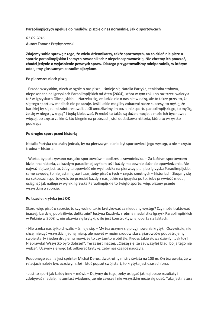 Paraolimpijczycy apelują do mediów: piszcie o nas normalnie, jak o sportowcach 07.09.2016 Autor: Tomasz Przybyszewski Zdajemy sobie sprawę z tego, że wielu dziennikarzy, także sportowych, na co dzień nie pisze o sporcie paraolimpijskim i samych zawodnikach z niepełnosprawnością. Nie chcemy ich pouczać, chodzi jedynie o wyjaśnienie pewnych spraw. Dlatego przygotowaliśmy miniporadnik, w którym oddajemy głos samym paraolimpijczykom. Po pierwsze: niech piszą - Przede wszystkim, niech w ogóle o nas piszą – śmieje się Natalia Partyka, tenisistka stołowa, niepokonana na Igrzyskach Paraolimpijskich od Aten (2004), która w tym roku po raz trzeci walczyła też w Igrzyskach Olimpijskich. – Narzeka się, że ludzie nic o nas nie wiedzą, ale to także przez to, że się tego sportu w mediach nie pokazuje. Jeśli ludzie mogliby zobaczyć nasze sukcesy, to myślę, że bardziej by się nami zainteresowali. Jeśli umożliwimy im poznanie sportu paraolimpijskiego, to myślę, że się w niego „wkręcą” i będą kibicować. Przecież tu także są duże emocje, a może ich być nawet więcej, bo często za kimś, kto biegnie na protezach, stoi dodatkowa historia, która to wszystko podkręca. Po drugie: sport przed historią Natalia Partyka chciałaby jednak, by na pierwszym planie był sportowiec i jego występ, a nie – często trudna – historia. - Warto, by pokazywano nas jako sportowców – podkreśla zawodniczka. – Za każdym sportowcem idzie inna historia, za każdym paraolimpijczykiem też i każdy ma pewnie dużo do opowiedzenia. Ale najważniejsze jest to, żeby ta opowieść nie wychodziła na pierwszy plan, bo Igrzyska Paraolimpijskie, same zawody, to nie jest miejsce i czas, żeby pisać o tych – często smutnych – historiach. Skupmy się na sukcesach sportowych, bo przecież każdy z nas jedzie na igrzyska po to, żeby przywieźć medal, osiągnąć jak najlepszy wynik. Igrzyska Paraolimpijskie to święto sportu, więc piszmy przede wszystkim o sporcie. Po trzecie: krytyka jest OK Skoro więc pisać o sporcie, to czy wolno także krytykować za nieudany występ? Czy może traktować inaczej, bardziej pobłażliwie, delikatnie? Justyna Kozdryk, srebrna medalistka Igrzysk Paraolimpijskich w Pekinie w 2008 r., nie obawia się krytyki, o ile jest konstruktywna, oparta na faktach. - Nie trzeba nas tylko chwalić – śmieje się. – My też uczymy się przyjmowania krytyki. Oczywiście, nie chcę mierzyć wszystkich jedną miarą, ale nawet w moim środowisku ciężarowców podpatrujemy swoje starty i jeden drugiemu mówi, że to czy tamto zrobił źle. Kiedyś takie słowa dziwiły: „Jak to?! Nieprawda! Wszystko było dobrze!”. Teraz jest inaczej: „Cieszę się, że zauważyłeś błąd, bo ja tego nie widzę”. Uczymy się więc tak odbierać krytykę, żeby nas czegoś nauczyła. Podobnego zdania jest sprinter Michał Derus, dwukrotny mistrz świata na 100 m. On też uważa, że w relacjach należy być uczciwym. Jeśli ktoś popsuł swój start, to krytyka jest uzasadniona. - Jest to sport jak każdy inny – mówi. – Dążymy do tego, żeby osiągać jak najlepsze rezultaty i zdobywać medale, natomiast wiadomo, że nie zawsze i nie wszystkim może się udać. Taka jest natura sportu. Jestem więc zdania, by nie zamykać nas pod takim kloszem, że jesteśmy osobami niepełnosprawnymi, że jak my świetnie wszystko robimy, że tyle mamy przeciwności, a trenujemy. Po czwarte: paraolimpijczycy nie są chorzy Michał Derus zauważył też pewien błąd znaczeniowy, który zdarza się w relacjach. - Zwróciłem uwagę, że paraolimpijczycy bywają przedstawiani jako „chorzy sportowcy” – podkreśla. – Czy my jesteśmy tacy chorzy? Wiadomo, nasza niepełnosprawność niekiedy wynika z różnego rodzaju schorzeń, ale żebyśmy byli chorzy? Dość kiepskie sformułowanie. Warto więc jeszcze raz powtórzyć: niepełnosprawność nie równa się chorobie. Może się równać lub z niej wynikać, ale „chory” to nie jest wyraz wymienny z „niepełnosprawny”. Po piąte: nie tylko dzielni Joanna Mendak, trzykrotna mistrzyni paraolimpijska w pływaniu, nie jest z kolei zwolenniczką sprowadzania wysiłku paraolimpijczyków do stwierdzenia, że „są dzielni”. - Każdy z nas jest dzielny, nieważne, czy jest to osoba pełnosprawna, czy osoba, która ma pewne ograniczenia – podkreśla. – Każdy podejmuje pewne wyzwanie, stawia sobie jakiś cel, który wiąże się z ograniczeniami, wynikającymi chociażby z życia na walizkach, w hotelach, z mniejszym kontaktem z bliskimi, zaległościami na uczelniach, w szkole czy chociażby z takim fizycznym bólem, wynikającym ze zmęczenia lub z kontuzji, które są tak samo obecne w sporcie olimpijskim, jak i paraolimpijskim. Po szóste: nie twórzmy superbohaterów Media miewają tendencję do robienia z osób z niepełnosprawnością (nie tylko paraolimpijczyków) suberbohaterów lub – druga skrajność – osób potrzebujących pomocy. - Z jednej strony nie użalajmy się, ale z drugiej – nie róbmy z zawodników aż takich superbohaterów – zaznacza Natalia Partyka. – Oczywiście, każdy wiele przeszedł, pokonał wiele przeszkód, ale my nie jesteśmy jakimiś nadludźmi, jak to w mediach jest często pokazywane. Mamy sportowca, który ostro trenował i zapracował sobie na to, żeby pojechać na igrzyska, więc traktujmy go przede wszystkim jako sportowca właśnie. Niepełnosprawność niech będzie na drugim planie, a nie odwrotnie. Nie piszmy wyłącznie przez pryzmat niepełnosprawności. - Myślę, że trzeba przede wszystkim pisać normalnie, tak jak jest – uważa Maciej Lepiato, mistrz paraolimpijski z Londynu w skoku wzwyż. – Nie koloryzować pewnych spraw, nie robić z nas nadludzi. Jest sukces, piszmy o tym sukcesie. Ale nie popadajmy też w skrajności w drugą stronę. Myślę, że normalność i zdrowy rozsądek są w tym przypadku najlepsze. Po siódme: zagł