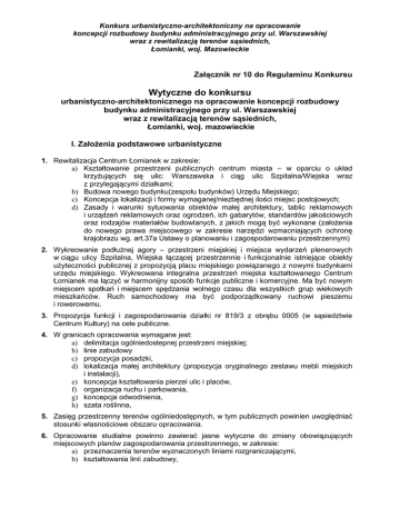 Konkurs urbanistyczno-architektoniczny na opracowanie koncepcji rozbudowy budynku administracyjnego przy ul. Warszawskiej wraz z rewitalizacją terenów sąsiednich, Łomianki, woj. Mazowieckie Załącznik nr 10 do Regulaminu Konkursu Wytyczne do konkursu urbanistyczno-architektonicznego na opracowanie koncepcji rozbudowy budynku administracyjnego przy ul. Warszawskiej wraz z rewitalizacją terenów sąsiednich, Łomianki, woj. mazowieckie I. ZałoŜenia podstawowe urbanistyczne 1. Rewitalizacja Centrum Łomianek w zakresie: a) Kształtowanie przestrzeni publicznych centrum miasta – w oparciu o układ krzyŜujących się ulic: Warszawska i ciąg ulic Szpitalna/Wiejska wraz z przylegającymi działkami; b) Budowa nowego budynku(zespołu budynków) Urzędu Miejskiego; c) Koncepcja lokalizacji i formy wymaganej/niezbędnej ilości miejsc postojowych; d) Zasady i warunki sytuowania obiektów małej architektury, tablic reklamowych i urządzeń reklamowych oraz ogrodzeń, ich gabarytów, standardów jakościowych oraz rodzajów materiałów budowlanych, z jakich mogą być wykonane (załoŜenia do nowego prawa miejscowego w zakresie narzędzi wzmacniających ochronę krajobrazu wg. art.37a Ustawy o planowaniu i zagospodarowaniu przestrzennym) 2. Wykreowanie podłuŜnej agory – przestrzeni miejskiej i miejsca wydarzeń plenerowych w ciągu ulicy Szpitalna, Wiejska łączącej przestrzennie i funkcjonalnie istniejące obiekty uŜyteczności publicznej z propozycją placu miejskiego powiązanego z nowymi budynkami urzędu miejskiego. Wykreowana integralna przestrzeń miejska kształtowanego Centrum Łomianek ma łączyć w harmonijny sposób funkcje publiczne i komercyjne. Ma być nowym miejscem spotkań i miejscem spędzania wolnego czasu dla wszystkich grup wiekowych mieszkańców. Ruch samochodowy ma być podporządkowany ruchowi pieszemu i rowerowemu. 3. Propozycja funkcji i zagospodarowania działki nr 819/3 z obrębu 0005 (w sąsiedztwie Centrum Kultury) na cele publiczne. 4. W granicach opracowania wymagane jest: a) delimitacja ogólniedostepnej przestrzeni miejskiej; b) linie zabudowy c) propozycja posadzki, d) lokalizacja małej architektury (propozycja oryginalnego zestawu mebli miejskich i instalacji), e) koncepcja kształtowania pierzei ulic i placów, f) organizacja ruchu i parkowania, g) koncepcja odwodnienia, h) szata roślinna, 5. Zasięg przestrzenny terenów ogólniedostępnych, w tym publicznych powinien uwzględniać stosunki własnościowe obszaru opracowania. 6. Opracowanie studialne powinno zawierać jasne wytyczne do zmiany obowiązujących miejscowych planów zagospodarowania przestrzennego, w zakresie: a) przeznaczenia terenów wyznaczonych liniami rozgraniczającymi, b) kształtowania linii zabudowy, Konkurs urbanistyczno-architektoniczny na opracowanie koncepcji rozbudowy budynku administracyjnego przy ul. Warszawskiej wraz z rewitalizacją terenów sąsiednich, Łomianki, woj. Mazowieckie c) wskaźników zagospodarowania terenu: intensywności, powierzchni zabudowy, minimalnego udziału powierzchni biologicznie czynnej, d) gabarytów budynków i kształtu dachu, e) kolorystyki elewacji i pokryć dachowych, f) osi widokowych, dominant przestrzennych (punktów eksponowanych widokowo) itp. II. ZałoŜenia podstawowe architektoniczne 1. Zakłada się docelową rozbiórkę istniejącego budynku i budowę nowych obiektów na wskazanym terenie inwestycji, ale realizacja planowanej zabudowy powinna uwzględniać ciągłość pracy Urzędu Miejskiego. Oznacza to, Ŝe budowa będzie przebiegała etapowo oraz, Ŝe oddawanie do uŜytku takŜe będzie etapowe. 2. Inwestycja moŜe składać się z jednego budynku, układu budynków bliźniaczych lub innego zespołu budynków połączonych łącznikami. Łączniki mogą mieć konstrukcję niezwiązaną trwale z gruntem (nadwieszoną). 3. ZałoŜenia funkcjonalne: a) budynek(zespół budynków) ma pełnić funkcję zarówno Ratusza, Magistratu, siedziby Urzędu Stanu Cywilnego oraz zawierać w parterze powierzchnie usługowe pod wynajem; b) dopuszcza się realizację inwestycji w partnerstwie publiczno-prywatnym, dlatego część komercyjna powinna cechować się atrakcyjnością funkcjonalną. c) obecny stan zatrudnienia w Urzędzie Miejskim to 122 pracowników w tym 17 pracowników OPS (ośrodka pomocy społecznej); naleŜy załoŜyć wzrost liczby pracowników o ok. 50% (w Urzędzie przewiduje się miejsce dla. filii wydziałów starostwa i jednostek organizacyjnych ). d) gabaryty budynku (zespołu budynków): − liczba kondygnacji od trzech (3) do pięciu (5) w tym jedna podziemna (dopuszcza się kondygnację przeznaczoną na garaŜ podziemny) − dopuszcza się przewyŜszenie – wieŜę – do siedmiu kondygnacji (do 20 m wysokości) − powierzchnia uŜytkowa do 2500,0 m2, 4. ZałoŜenia architektoniczne: a) obiekt charakterystyczny o współczesnej formie przestrzennej, zharmonizowany z otoczeniem, ewentualnie wyróŜniający się w krajobrazie jako punkt orientacji przestrzennej (wieŜa do 20 m wysokości) b) otwarte przestrzenie w parterze budynku, przenikające się i uzupełniające z podłuŜną agorą kształtowaną w oparciu o ciąg ulic Szpitalna, Wiejska, mające wspólnie stanowić przestrzeń publiczną miasta, miejsce spotkań mieszkańców, działań informacyjnych, kulturalnych i artystycznych, c) główne wejście do budynku w bezpośrednim sąsiedztwie placu miejskiego stanowiącego centralny element przestrzeni miejskiej centrum; d) dopuszcza się układ symetryczny oparty o oś kompozycyjną wyznaczoną ciągiem ulic Szpitalna-Wiejska 5. ZałoŜenia funkcjonalno-uŜytkowe; program funkcjonalno – uŜytkowy części administracyjnej powinien zawierać: a) reprezentacyjne sale kierownictwa urzędu (gabinety burmistrza, dwóch zastępców burmistrza, sekretarza, skarbnika), b) pomieszczenia Biura Rady Miejskiej w tym gabinet przewodniczącego Rady Miejskiej, pokój urzędników, pokój radnych słuŜący