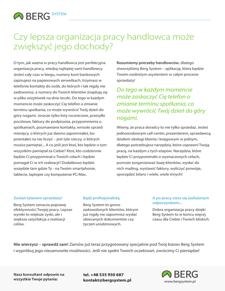 Czy lepsza organizacja pracy handlowca może zwiększyć jego dochody? O tym, jak ważna w pracy handlowca jest perfekcyjna Rozumiemy potrzeby handlowców, dlatego organizacja pracy, wiedzą najlepiej sami handlowcy. stworzyliśmy Berg System – aplikację, która będzie Jesteś cały czas w biegu, numery kont bankowych Twoim osobistym asystentem w całym procesie zapisujesz na papierowych serwetkach, trzymasz w sprzedaży! telefonie kontakty do osób, do których i tak nigdy nie zadzwonisz, a numery do Twoich klientów znajdują się w pliku wizytówek na dnie teczki. Do tego w każdym momencie może zaskoczyć Cię telefon o zmianie terminu spotkania, co może wywrócić Twój dzień do góry nogami. Jeszcze tylko listy rocznicowe, przesyłki pocztowe, faktury do podpisania, przypomnienia o Do tego w każdym momencie może zaskoczyć Cię telefon o zmianie terminu spotkania, co może wywrócić Twój dzień do góry nogami. spotkaniach, poumawiane kontakty, wnioski sprzed Wiemy, że praca doradcy to nie tylko sprzedaż. Jesteś miesięcy, o których już dawno zapomniałeś, bo jednoosobowym call center, prezenterem, sprzedawcą, przestałeś na nie liczyć – jest tyle rzeczy, o których działem obsługi klienta i księgowym w jednym, musisz pamiętać... A co jeśli jest ktoś, kto będzie o tym dlatego potrzebujesz narzędzia, które usprawni Twoją wszystkim pamiętał za Ciebie? Ktoś, kto codziennie pracę, na każdym z tych etapów. Narzędzia, które będzie Ci przypominał o Twoich celach i będzie będzie Ci przypominało o wyznaczonych celach, pomagał Ci w ich realizacji? Dodatkowo będzie pomoże zorganizować bazę klientów, wysłać do wszędzie tam gdzie Ty - na Twoim smartphonie, nich mailing, wystawić faktury, wyliczyć prowizje, tablecie, laptopie czy komputerze PC/Mac. sporządzić bilans i wiele, wiele innych! Zostań tytanem sprzedaży! Bądź profesjonalistą. Berg System oznacza poprawę efektywności Twojej pracy. Lepsze wyniki to większe zyski, ale i większa satysfakcja z realizacji celów. Berg System to grono zadowolonych klientów, którym już nigdy nie zapomnisz wysłać obiecanych dokumentów czy życzeń urodzinowych. A po pracy ciesz się zasłużonym odpoczynkiem... Dobra organizacja pracy dzięki Berg System to w końcu więcej czasu dla Ciebie i Twoich bliskich. Nie wierzysz – sprawdź sam! Zamów już teraz przygotowany specjalnie pod Twój biznes Berg System i wypróbuj jego niesamowite możliwości. Jeśli nie spełni Twoich oczekiwań, zwrócimy Ci pieniądze! Nasz konsultant odpowie na wszystkie Twoje pytania: tel. +48 535 950 687 [email protected] www.bergsystem.pl