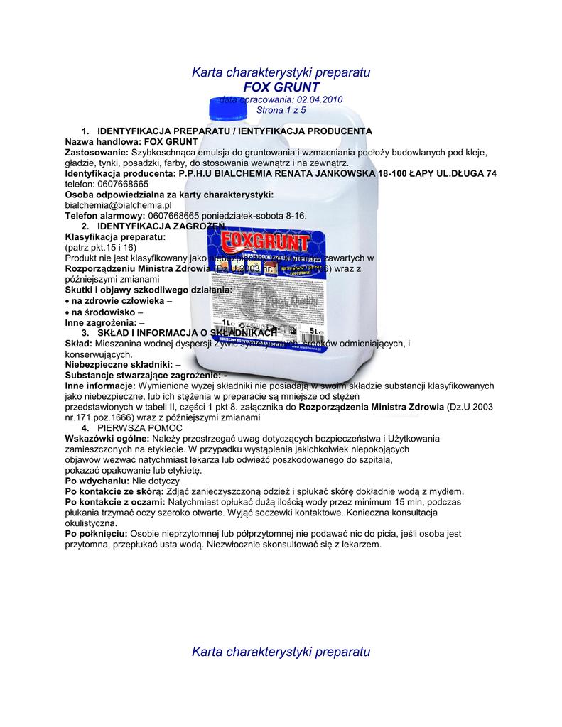 Karta charakterystyki preparatu FOX GRUNT data opracowania: 02.04.2010 Strona 1 z 5 1. IDENTYFIKACJA PREPARATU / IENTYFIKACJA PRODUCENTA Nazwa handlowa: FOX GRUNT Zastosowanie: Szybkoschnąca emulsja do gruntowania i wzmacniania podłoży budowlanych pod kleje, gładzie, tynki, posadzki, farby, do stosowania wewnątrz i na zewnątrz. Identyfikacja producenta: P.P.H.U BIALCHEMIA RENATA JANKOWSKA 18-100 ŁAPY UL.DŁUGA 74 telefon: 0607668665 Osoba odpowiedzialna za karty charakterystyki: [email protected] Telefon alarmowy: 0607668665 poniedziałek-sobota 8-16. 2. IDENTYFIKACJA ZAGROŻEŃ Klasyfikacja preparatu: (patrz pkt.15 i 16) Produkt nie jest klasyfikowany jako niebezpieczny wg kryteriów zawartych w Rozporządzeniu Ministra Zdrowia (Dz.U.2003 nr.171 poz.1666) wraz z późniejszymi zmianami Skutki i objawy szkodliwego działania: na zdrowie człowieka – na środowisko – Inne zagrożenia: – 3. SKŁAD I INFORMACJA O SKŁADNIKACH Skład: Mieszanina wodnej dyspersji Żywic syntetycznych, środków odmieniających, i konserwujących. Niebezpieczne składniki: – Substancje stwarzające zagrożenie: Inne informacje: Wymienione wyżej składniki nie posiadają w swoim składzie substancji klasyfikowanych jako niebezpieczne, lub ich stężenia w preparacie są mniejsze od stężeń przedstawionych w tabeli II, części 1 pkt 8. załącznika do Rozporządzenia Ministra Zdrowia (Dz.U 2003 nr.171 poz.1666) wraz z późniejszymi zmianami 4. PIERWSZA POMOC Wskazówki ogólne: Należy przestrzegać uwag dotyczących bezpieczeństwa i Użytkowania zamieszczonych na etykiecie. W przypadku wystąpienia jakichkolwiek niepokojących objawów wezwać natychmiast lekarza lub odwieźć poszkodowanego do szpitala, pokazać opakowanie lub etykietę. Po wdychaniu: Nie dotyczy Po kontakcie ze skórą: Zdjąć zanieczyszczoną odzież i spłukać skórę dokładnie wodą z mydłem. Po kontakcie z oczami: Natychmiast opłukać dużą ilością wody przez minimum 15 min, podczas płukania trzymać oczy szeroko otwarte. Wyjąć soczewki kontaktowe. Konieczna konsultacja okulistyczna. Po połknięciu: Osobie nieprzytomnej lub półprzytomnej nie podawać nic do picia, jeśli osoba jest przytomna, przepłukać usta wodą. Niezwłocznie skonsultować się z lekarzem. Karta charakterystyki preparatu FOX GRUNT data opracowania: 02.04.2010 Strona 2 z 5 5. POSTĘPOWANIE W PRZYPADKU POŻARU Palność: Preparat nie jest palny. odpowiednie środki gaśnicze Pożar w otoczeniu gasić środkami odpowiednimi dla przyczyny pożaru. środki gaśnicze, których nie wolno Używać Brak specjalnych przeciwwskazań. szczególne zagrożenia W przypadku pożaru mogą tworzyć się niebezpieczne gazy (CO2, CO) w określonych warunkach spalania, nie można wykluczyć powstania innych szkodliwych substancji. środki ochrony indywidualnej dla gaszących pożar W przypadku pożaru nie wdychać dymu, Używać sprzętu chroniącego drogi oddechowe. Inne informacje Produktu nie dodawać do rozprzestrzeniającego się ognia w przypadku pożaru magazynu. 6. POSTĘPOWANIE W PRZYPADKU NIEZAMIERZONEGO UWOLNIENIA DO ŚRODOWISKA Indywidualne środki ostrożności: Unikać kontaktu ze skórą i oczami (po wyschnięciu staje się stosunkowo trudny do zmycia). Unikać rozlania - tworzy śliskie warstwy. Środki ostrożności z zakresie ochrony środowiska: Unikać wprowadzenia preparatu do kanalizacji, wód powierzchniowych i gruntowych oraz gleby. W przypadku zanieczyszczenia wód lub ścieków należy poinformować odpowiednie władze. W przypadku rozlania usuwać przy pomocy materiału absorbującego (piach, ziemia, trociny). Metody oczyszczania: Usuwać przy pomocy środków mechanicznych, produkt gromadzić w kontenerze do czasu przyszłego zniszczenia. Podłogi i inne przedmioty myć dokładnie, natychmiast po zanieczyszczeniu przez produkt. Duże ilości odpadów usuwać zgodnie z obowiązującymi przepisami. Zaschnięte pozostałości produktu można usuwać za pomocą środka do usuwania pozostałości po wszystkich wyrobach opartych na dyspersjach polimerowych . Nigdy nie stosować lub unikać – 7. POSTĘPOWANIE Z PREPARATEM I JEGO MAGAZYNOWANIE Postępowanie z preparatem: Unikać kontaktu z oczami i ze skórą - po wyschnięciu stosunkowo trudny do zmycia, unikać rozlania tworzy śliskie warstwy. Zaschnięte pozostałości produktu można usuwać za pomocą środka do usuwania pozostałości po wszystkich wyrobach opartych na dyspersjach polimerowych Magazynowanie: Przechowywać w suchym i chłodnym miejscu, chronić przed wysokimi temperaturami (powyżej 30 °C) i zamrożeniem – produkt zamarza i traci nieodwracalnie swoje właściwości Użytkowe w temp poniżej 0°C, nie zostawia ć otwartych pojemników. Specyficzne zastosowania: – 8. KONTROLA NARAŻENIA I ŚRODKI OCHORONY INDYWIDUALNEJ Kontrola narażenia – NDS i NDSCh – DSB – monitoring Rozporządzenie Ministra Zdrowia z dnia 20 kwietnia 2005 w sprawie badań i pomiarów czynników szkodliwych dla zdrowia w środowisku pracy (Dz.U.2005 nr.73poz.645) Środki ochrony: dróg oddechowych Nie są wymagane rąk Rękawice gumowe oczu i twarzy Okulary ochronne zamknięte (gogle) skóry Ubranie i obuwie robocze 9. WŁAŚCIWOŚCI FIZYCZNE I CHEMICNZE Postać / kolor: mleczna ciecz Karta charakterystyki preparatu FOX GRUNT data opracowania: 02.04.2010 Strona 3 z 5 Zapach: wyczuwalny charakterystyczny pH: ok. 8 Temperatura: wrzenia / zakresu temp. > 100 oC topnienia / zakresu temp. nie dotyczy zapłonu nie dotyczy samozapłonu nie dotyczy Palność: nie jest palny Właściwości wybuchowe: nie posiada Właściwości utleniające: nie posiada Prężność par: nie dotyczy Gęstość względna/nasypowa: ok. 1 g/cm3 Rozpuszczalność: w wodzie w postaci handlowej rozpuszczalny, po wyschnięciu nie rozpuszczalny w rozpuszczalnikach organicznych nie rozpuszczalny Lepkość 60 cP / mPas (pomiar lepkościomierzem Brookfield DV II+ S05 20 rpm) Gęstość par nie dotyczy Szybkość paro
