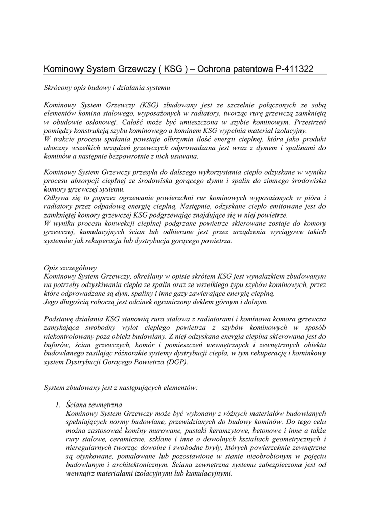 Kominowy System Grzewczy ( KSG ) – Ochrona patentowa P-411322 Skrócony opis budowy i działania systemu Kominowy System Grzewczy (KSG) zbudowany jest ze szczelnie połączonych ze sobą elementów komina stalowego, wyposaŜonych w radiatory, tworząc rurę grzewczą zamkniętą w obudowie osłonowej. Całość moŜe być umieszczona w szybie kominowym. Przestrzeń pomiędzy konstrukcją szybu kominowego a kominem KSG wypełnia materiał izolacyjny. W trakcie procesu spalania powstaje olbrzymia ilość energii cieplnej, która jako produkt uboczny wszelkich urządzeń grzewczych odprowadzana jest wraz z dymem i spalinami do kominów a następnie bezpowrotnie z nich usuwana. Kominowy System Grzewczy przesyła do dalszego wykorzystania ciepło odzyskane w wyniku procesu absorpcji cieplnej ze środowiska gorącego dymu i spalin do zimnego środowiska komory grzewczej systemu. Odbywa się to poprzez ogrzewanie powierzchni rur kominowych wyposaŜonych w pióra i radiatory przez odpadową energię cieplną. Następnie, odzyskane ciepło emitowane jest do zamkniętej komory grzewczej KSG podgrzewając znajdujące się w niej powietrze. W wyniku procesu konwekcji cieplnej podgrzane powietrze skierowane zostaje do komory grzewczej, kumulacyjnych ścian lub odbierane jest przez urządzenia wyciągowe takich systemów jak rekuperacja lub dystrybucja gorącego powietrza. Opis szczegółowy Kominowy System Grzewczy, określany w opisie skrótem KSG jest wynalazkiem zbudowanym na potrzeby odzyskiwania ciepła ze spalin oraz ze wszelkiego typu szybów kominowych, przez które odprowadzane są dym, spaliny i inne gazy zawierające energię cieplną. Jego długością roboczą jest odcinek ograniczony deklem górnym i dolnym. Podstawę działania KSG stanowią rura stalowa z radiatorami i kominowa komora grzewcza zamykająca swobodny wylot ciepłego powietrza z szybów kominowych w sposób niekontrolowany poza obiekt budowlany. Z niej odzyskana energia cieplna skierowana jest do buforów, ścian grzewczych, komór i pomieszczeń wewnętrznych i zewnętrznych obiektu budowlanego zasilając róŜnorakie systemy dystrybucji ciepła, w tym rekuperację i kominkowy system Dystrybucji Gorącego Powietrza (DGP). System zbudowany jest z następujących elementów: 1. Ściana zewnętrzna Kominowy System Grzewczy moŜe być wykonany z róŜnych materiałów budowlanych spełniających normy budowlane, przewidzianych do budowy kominów. Do tego celu moŜna zastosować kominy murowane, pustaki keramzytowe, betonowe i inne a takŜe rury stalowe, ceramiczne, szklane i inne o dowolnych kształtach geometrycznych i nieregularnych tworząc dowolne i swobodne bryły, których powierzchnie zewnętrzne są otynkowane, pomalowane lub pozostawione w stanie nieobrobionym w pojęciu budowlanym i architektonicznym. Ściana zewnętrzna systemu zabezpieczona jest od wewnątrz materiałami izolacyjnymi lub kumulacyjnymi. 2. Izolacja Ściany wewnętrzne, dekiel górny i dekiel dolny KSG w celu zabezpieczenia odzyskanej energii cieplnej przed utratą temperatury i przenikaniem ciepła poza KSG muszą być odizolowane skutecznie w sposób szczelny, co stanowi podstawę działania systemu. Jako materiały izolacyjne moŜna zastosować wszelkiego typu wełny mineralne, płyty izolacyjne i płyty akumulacyjne. Wszystkie połączenia muszą być zaklejone, skutecznie zaszpachlowane i zasłonięte w sposób szczelny. Powierzchnie materiałów pylących jak np. wełny mineralne muszą być przed tym zabezpieczone skutecznie. Dzięki temu przepływające przez komorę grzewczą powietrze będzie czyste i moŜliwe do bezpośredniego odprowadzenia np. do innych pomieszczeń obiektu budowlanego. 3. Komora grzewcza Jest to przestrzeń pomiędzy dolną częścią sekcji środkowej komina – deklem dolnym i górną częścią tej sekcji wewnątrz szybu kominowego - deklem górnym odcinającym wylot ciepła z budynku, a takŜe pomiędzy bocznymi ścianami wewnętrznymi KSG a rurą odprowadzającą spaliny poza budynek. Komora słuŜy do transportu odzyskanej energii do innych pomieszczeń, odbiorników akumulacyjnych i systemów dystrybucji. Komora grzewcza tym samym z góry i dołu jest zamknięta materiałami izolacyjnymi a przestrzeń boczna ograniczona jest z jednej strony materiałem akumulacyjnym lub izolacyjnym a z drugiej rurą z gorącymi spalinami. W prezentowanym w ofercie rozwiązaniu komora grzewcza wykonana jest z rury osłonowej z blachy ocynkowanej a w kolejnej warstwie znajduje się wełna mineralna lub płyta akumulacyjna. 4. Rury spalinowe Podstawę rozwiązania KSG stanowią Ŝaroodporne rury wykonane z najwyŜszej jakości stali szlachetnej, spełniającej najwyŜsze normy budowlane. Zastosowane w systemie rury mają przekrój okrągły o średnicy 200 mm. Do obwodu kaŜdej rury o długości od 300 do 550 cm przyspawane jest 20 radiatorów o wysokości 30 mm. Radiatory odbierają ciepło z rury dymowo - spalinowej i przekazują do komory grzewczej. Dzięki szczelnemu zamknięciu rury KSG w komorze grzewczej moŜemy w sposób kontrolowany przesyłać odzyskaną energię do dalszego wykorzystania. Diagram w punkcie 8 zawiera informacje dotyczące długości dostępnych kominów, osiąganych oszczędności i wielu szczegółów omawianego rozwiązania. 5. Bezpieczeństwo Odprowadzenie spalin z urządzenia podłączonego do KSG musi odbywać się przy zastosowaniu rur i systemów łączących zapewniających i gwarantujących stu procentową szczelność na całej długości systemu. Budując komin dla KSG z rur o długościach wymagających łączenia i składania z róŜnych odcinków naleŜy zastosować rozwiązania połączeń gwarantujące całkowitą szczelność spalin i dymu przepływających na całej długości roboczej KSG. Wymaganie to wynika z obawy, iŜ w przypadkach zastosowania urządzeń mechanicznych do dystrybucji ciepła, o których mowa we wstępie opracowania moŜe następować wysysanie spalin z nieszczeln