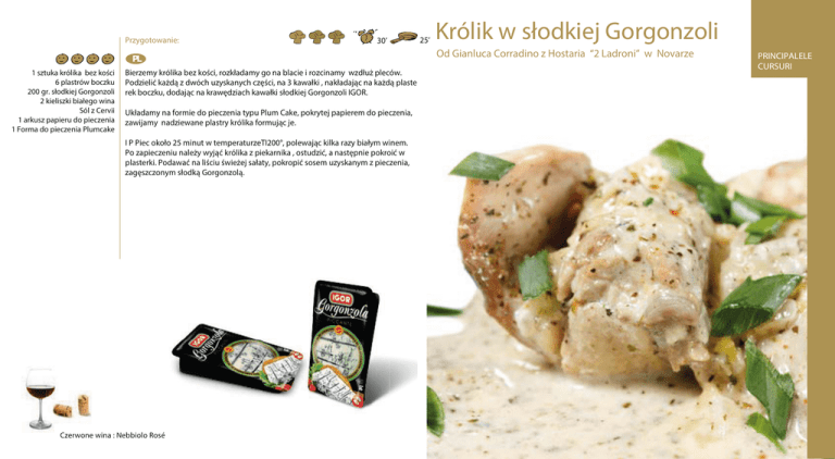Przygotowanie: 30’ PL 1 sztuka królika bez kości 6 plastrów boczku 200 gr. słodkiej Gorgonzoli 2 kieliszki białego wina Sól z Cervii 1 arkusz papieru do pieczenia 1 Forma do pieczenia Plumcake Bierzemy królika bez kości, rozkładamy go na blacie i rozcinamy wzdłuż pleców. Podzielić każdą z dwóch uzyskanych części, na 3 kawałki , nakładając na każdą plaste rek boczku, dodając na krawędziach kawałki słodkiej Gorgonzoli IGOR. Układamy na formie do pieczenia typu Plum Cake, pokrytej papierem do pieczenia, zawijamy nadziewane plastry królika formując je. I P Piec około 25 minut w temperaturzeTI200°, polewając kilka razy białym winem. Po zapieczeniu należy wyjąć królika z piekarnika , ostudzić, a następnie pokroić w plasterki. Podawać na liściu świeżej sałaty, pokropić sosem uzyskanym z pieczenia, zagęszczonym słodką Gorgonzolą. Czerwone wina : Nebbiolo Rosé 25’ Królik w słodkiej Gorgonzoli Od Gianluca Corradino z Hostaria “2 Ladroni” w Novarze PRINCIPALELE CURSURI
