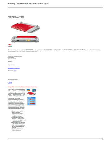 Routery LAN/WLAN/VOIP : FRITZ!Box 7330 FRITZ!Box 7330 Bezprzewodowy router z modemem ADSL/ADSL2+ - wsparcie dla annex A i B, WAN Ethernet, Gigabit Ethernet (10/100/1000 Mbps), WiFi 802.11 N 300 Mbps, centralka telefoniczna dla telefonii stacjonarnej i internetowej, wbudowana baza DECT Ocena Nie ma jeszcze oceny Cena brutto Cena po rabacie 549,00 zł Zadaj pytanie o produkt Producent: AVM Szczegóły produktu Opis Uwaga: Brak możliwości odbioru osobistego, tylko wysyłka. FRITZ!Box 7330 to idealny wybór dla osób szukających kompleksowego rozwiązania sieciowego dla swojego domu lub biura i korzystających z linii ADSL2+ bądź łączy kablowych. Szybka sieć WLAN dla bezprzewodowego surfowania, zintegrowany media serwer, centralka telefoniczna PBX z wbudowaną stacją bazową DECT oraz szeroka gama użytecznych funkcji czynią z FRITZ!Box 7330 kompleksowe centrum łączności dla nowoczesnego domu i biura. Szybki internet do 24 Mbit/s na liniach telefonicznych dzięki zintegrowanemu modemowi ADSL2+ Uniwersalny port WAN Ethernet – obsługa łączy kablowych nowej generacji i sieci osiedlowych Współpraca z modemami USB UMTS, HSPA i LTE Sieć WLAN N o prędkości do 300 Mbit/s w paśmie 2,4 GHz Centralka telefoniczna (PBX) dla telefonii 1/3 Routery LAN/WLAN/VOIP : FRITZ!Box 7330 internetowej i analogowej telefonii stacjonarnej z wbudowaną automatyczną sekretarką i funkcją odbioru faksów. Zintegrowana stacja bazowa DECT z możliwością zalogowania do 6 bezprzewodowych słuchawek Dwa porty USB dla dysków twardych, pamięci flash, drukarek i skanerów Wbudowany media serwer dla udostępniania muzyki zdjęć i filmów w sieci Funkcjonalność NAS (wsparcie dla FTP/FTPS, SMB, UPnP AV, WebDAV) Usługa - chmura MyFRITZ! – zdalny bezpieczny dostęp do swojego FRITZ!Box i innych urządzeń z każdego miejsca na świecie Integracja smartfonów i tabletów z systemem Android i Apple iOS w sieci domowej oraz biurowej za pomocą WLAN. Dostęp do telefonii stacjonarnej i internetowej oraz multimediów. W momencie podłączenia FRITZ!Box 7330 staje się sercem systemu telekomunikacyjnego w twoim otoczeniu. Internet, sieć bezprzewodowa, serwer sieciowy plików i inne usługi są nieustannie zarządzane przez jedno uniwersalne urządzenie. FRITZ!Box 7330 oferuje zróżnicowane i elastyczne sposoby łączności, dzięki czemu może być używany do różnych zastosowań zarówno w domu jak i małej firmie. Połączenie ADSL lub ADSL2+ oraz możliwość podłączenia analogowej linii stacjonarnej Działanie z zewnętrznymi modemami kablowymi lub sieciami osiedlowymi za pomocą portu WAN Ethernet Router współpracuje z modemami USB UMTS, HSPA lub LTE Wejście dla linii telefonicznej (miejskiej) w wersji analogowej (POTS) Port analogowy dla podłączenia aparatu telefonicznego lub faksu Stacja bazowa DECT dla 6 aparatów bezprzewodowych (GAP/CAT-iq) Centralka dla 10 aparatów IP Sieć bezprzewodowa WLAN – wsparcie dla wszystkich aktualnych standardów (802.11 n/g/b) Jeden port Gigabit Ethernet (1000 Mbit/s) i jeden port Fast Ethernet (100 Mbit/s) dla komputerów, konsol do gier i innych urządzeń LAN Dwa porty USB 2.0 do udostępnienia w sieci drukarek, skanerów i nośników danych (dyski twarde i pamięci flash) Integracja dla smartfonów i tabletów z systemem Android oraz Apple iPhone/iPad zapewnia połączenie z zasobami multimedialnymi sieci domowej i korzystanie z funkjconalności centralki telefonicznej Koncentrator VPN IPSec – szyfrowana komunikacja przez Internet Obsługa Podczas projektowania FRITZ!Box 7330 duży nacisk położono na kwestię łatwości użytkowania. Wielojęzyczny asystent instalacji oraz intuicyjny, oparty na przeglądarce, interfejs routera są przełomowe i wyznaczają nowe standardy pod względem ergonomii obsługi. Inżynierowie AVM nieustannie pracują na tym, aby każdy użytkownik mógł w pełni korzystać ze wszystkich funkcji FRITZ!Box i łatwo dopasowywać go do swoich indywidualnych potrzeb. Kompleksowa dokumentacja oraz bezpłatny system wsparcia technicznego podkreślają zaangażowanie i troskę AVM o możliwie największą satysfakcję użytkowników FRITZ!Box. Dzięki temu, urządzenia AVM cieszą się tak dużą popularnością i uznaniem w Europie. Łatwa konfiguracja routera z poziomu przeglądarki – praca w systemach Windows , Mac OS i Linux Interfejs użytkownika i asystenci instalacji w języku angielskim, niemieckim, francuskim, włoskim i hiszpańskim Indywidualna konfiguracja dla telefonii, automatycznych sekretarek i faksów Zaawansowane reguły wybierania numerów telefonicznych dla telefonii internetowej i stacjonarnej Skrócone wybieranie numerów, blokowanie i historia połączeń połączeń Połączenia konferencyjne i przekierowywanie rozmów Rozbudowana książka telefoniczna z możliwością drukowania i synchronizacją on-line z Google Prosta rejestracja słuchawek DECT za pomocą jednego przycisku Możliwość prowadzenia do 3 rozmów jednocześnie przez bazę DECT (łącznie do 5 jednoczesnych połączeń telefonicznych) Domyślnie szyfrowana sieć WLAN z unikalnym kluczem Sterowanie WLAN za pomocą przycisków na routerze i aparatów telefonicznych Szybka konfiguracja sieci WLAN za pomocą jednego przycisku - AVM Stick&Surf lub WPS (WiFi Protected Setup) Ochrona dostępu dla nośników danych USB Zaawansowane zarządzanie i monitorowanie zużytej energii oraz zasobów systemowych Dwa tryby pracy interfejsu - standardowy oraz tryb dla zaawansowanych użytkowników Proste zarządzenie przez internet za pomocą smartfonów i tabletów z systemem Apple iOS oraz Android (chmura MyFRITZ!) 2/3 Routery LAN/WLAN/VOIP : FRITZ!Box 7330 Zawartość opakowania FRITZ!Box 7330 dostarczany jest ze wszystkim niezbędnymi kablami i adapterami potrzebnymi do instalacji w Polsce. W opakowaniu znajduje się także drukowana instrukcja obsługi w języku polskim. FRITZ!Box Fon WLAN 7330 wersja międzynarodowa Annex A iB (nr produktu 20002