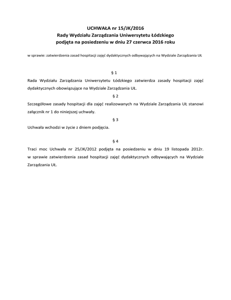 UCHWAŁA nr 15/JK/2016 Rady Wydziału Zarządzania Uniwersytetu Łódzkiego podjęta na posiedzeniu w dniu 27 czerwca 2016 roku w sprawie: zatwierdzenia zasad hospitacji zajęć dydaktycznych odbywających na Wydziale Zarządzania UŁ §1 Rada Wydziału Zarządzania Uniwersytetu Łódzkiego zatwierdza zasady hospitacji zajęć dydaktycznych obowiązujące na Wydziale Zarządzania UŁ. §2 Szczegółowe zasady hospitacji dla zajęć realizowanych na Wydziale Zarządzania UŁ stanowi załącznik nr 1 do niniejszej uchwały. §3 Uchwała wchodzi w życie z dniem podjęcia. §4 Traci moc Uchwała nr 25/JK/2012 podjęta na posiedzeniu w dniu 19 listopada 2012r. w sprawie zatwierdzenia zasad hospitacji zajęć dydaktycznych odbywających na Wydziale Zarządzania UŁ. Załącznik nr 1 do Uchwały Rady Wydziału Zarządzania nr 15/JK/2016 z dnia 27.06.2016 Zasady hospitacji zajęć dydaktycznych na Wydziale Zarządzania Uniwersytetu Łódzkiego - dotyczą programów kształcenia rozpoczętych po 01.10.2016 r. Na Wydziale Zarządzania Uniwersytetu Łódzkiego realizowane są hospitacje zajęć dydaktycznych prowadzonych dla studentów Wydziału według następujących zasad: 1. Za przygotowanie i realizację hospitacji odpowiadają Katedry, w których zatrudniany jest oceniany pracownik: a. na stanowisku asystenta i asystenta-doktoranta – w pierwszym roku zatrudnienia, a następnie raz na dwa lata; b. na stanowisku adiunkta – w pierwszym roku zatrudnienia lub zmiany stanowiska; c. nie będący pracownikiem Uniwersytetu Łódzkiego – według uznania Kierownika Katedry. 2. Za przygotowanie i realizację hospitacji zajęć w pozostałych przypadkach odpowiada Kolegium Dziekańskie. 3. Hospitacji poddawane są zajęcia realizowane przez pracowników, którzy w poprzedniej edycji prowadzonych zajęć uzyskali niezadawalające oceny studentów. 4. Kierownik Katedry przeprowadza hospitacje samodzielnie lub deleguje do ich przeprowadzenia pracownika zatrudnionego w Katedrze na pełnym etacie bądź jego części. 5. Przeprowadzający hospitacje sporządza pisemne sprawozdanie (Załącznik A). 6. W przypadku, gdy osoba hospitowana nie zgadza się z oceną, przysługuje jej prawo odwołania się do Kolegium Dziekańskiego, w terminie 14 dni od zapoznania się z wynikiem hospitacji. 7. W terminie dwóch tygodni po zakończeniu semestru Kierownik Katedry składa w Dziale Jakości Kształcenia komplet sprawozdań z przeprowadzonych hospitacji wraz z zestawieniem zbiorczym (Załącznik B). 8. Wgląd w sprawozdania z indywidualnych hospitacji mają: a. Osoby poddawane hospitacji b. Kolegium Dziekańskie c. Wydziałowa Komisja ds. Jakości Kształcenia 9. Wgląd w zestawienia zbiorcze z hospitacji mają: a. Kolegium Dziekańskie b. Wydziałowa Komisja ds. Jakości Kształcenia 10. Wgląd w sprawozdania z indywidualnych hospitacji mogą uzyskać Kierownicy Kierunków/Specjalności na pisemny wniosek skierowany do Kolegium Dziekańskiego. Załącznik A Wydział Zarządzania UŁ Katedra ……………...……………………. SPRAWOZDANIE Z HOSPITACJI przeprowadzonej w semestrze zimowym / letnim roku akademickiego …………….. w dniu …………….… 1. Osoba hospitowana: (tytuł, stopień naukowy, imię i nazwisko, stanowisko) …………………………………………………………………………………………………………………………………………………………….…….. 2. Rodzaj hospitacji: zapowiedziana, niezapowiedziana, interwencyjna1 3. Przedmiot: ……………………………………………………………………………………………………………………………………………….. typ studiów……………………. rok studiów…………………….. 4. 5. 6. 7. Forma zajęć: …………………….. Sala nr: …………………….. Czas trwania zajęć: od godz. …………………. do godz. ………………… Stan osobowy grupy: ……….……. Obecnych w trakcie hospitacji: ……..………….. Osoba hospitująca: (tytuł, stopień naukowy, imię i nazwisko, stanowisko): …………………………………………………………………………………………………………….…………………………………………………….. Uwagi o pracy hospitowanego nauczyciela 1. Tematyka zajęć: 2. Ocena przygotowania się do zajęć i ich merytorycznej poprawności: 3. Technika nauczania i organizacja pracy: 4. Predyspozycje pedagogiczne i wychowawcze: (szczególną uwagę zwrócić na klarowność wypowiedzi, istnienie sprzężenia zwrotnego między prowadzącym i słuchaczami, dykcję, wytwarzanie motywacji, korygowanie poprawności wypowiedzi studentów itp.) 5. Zgodność tematyki prowadzonych zajęć z programem: 6. Inne uwagi dotyczące sposobu prowadzenia zajęć: Uwagi o warunkach prowadzenia zajęć: (wielkość sali, stan jej wyposażenia, pomoce dydaktyczne, oświetlenie, temperatura itp.) Podsumowanie i wnioski pohospitacyjne: 1 …………………..……………………….. …………………..……………………….. Podpis osoby hospitującej Podpis osoby hospitowanej niepotrzebne skreślić Załącznik B Wydział Zarządzania UŁ Katedra ………………………………………. ZESTAWIENIE ZBIORCZE Z HOSPITACJI przeprowadzonych w semestrze zimowym / letnim roku akademickiego …………………….. L.P. NAZWA PRZEDMOTU FORMA ZAJĘĆ STANOWISKO OSOBY HOSPITOWANEJ IMIĘ I NAZWISKO OSOBY HOSPITOWANEJ WYNIK HOSPITACJI