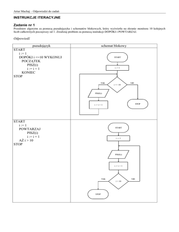 Artur Machaj – Odpowiedzi do zadań INSTRUKCJE ITERACYJNE Zadanie nr 1 Przedstaw algorytm za pomocą pseudojęzyka i schematów blokowych, który wyświetla na ekranie monitora 10 kolejnych liczb całkowitych począwszy od 1. Zrealizuj problem za pomocą instrukcji DOPÓKI i POWTARZAJ. Odpowiedź pseudojęzyk schemat blokowy START i := 1 DOPÓKI i <=10 WYKONUJ POCZĄTEK PISZ(i) i := i + 1 KONIEC STOP START i := 1 TAK NIE i <= 10 PISZ(i) STOP i := i + 1 START i := 1 POWTARZAJ PISZ(i) i := i + 1 Aś i > 10 STOP START i := 1 PISZ(i) i := i + 1 TAK NIE i > 10 STOP Artur Machaj – Odpowiedzi do zadań Zadanie nr 2 Przedstaw algorytm za pomocą pseudojęzyka i schematów blokowych, który oblicza sumę 10 kolejnych liczb całkowitych począwszy od 1 i wyświetla ją na ekranie monitora. Zrealizuj problem za pomocą instrukcji DOPÓKI i POWTARZAJ. Odpowiedź pseudojęzyk schemat blokowy START i := 1 s := 0 DOPÓKI i <=10 WYKONUJ POCZĄTEK s := s + i i := i + 1 KONIEC PISZ(s) STOP START i := 1 s:= 0 TAK NIE i <= 10 PISZ(s) s := s + i i := i + 1 STOP START i := 1 s := 0 POWTARZAJ s := s + i i := i + 1 Aś i > 10 PISZ(s) STOP START i := 1 s := 0 s := s + i i := i + 1 NIE TAK i > 10 PISZ(s) STOP Artur Machaj – Odpowiedzi do zadań Zadanie nr 3 Przedstaw algorytm za pomocą pseudojęzyka i schematów blokowych, który oblicza sumę 10 kolejnych parzystych liczb całkowitych począwszy od 2 i wyświetla ją na ekranie monitora. Zrealizuj problem za pomocą instrukcji DOPÓKI i POWTARZAJ. Odpowiedź pseudojęzyk schemat blokowy START i := 1 j := 2 s := 0 DOPÓKI i <=10 WYKONUJ POCZĄTEK s := s + j j := j + 2 i := i + 1 KONIEC PISZ(s) STOP START i := 1 j := 2 s:= 0 TAK NIE i <= 10 PISZ(s) s := s + j j := j + 2 i := i + 1 STOP START i := 1 j := 2 s := 0 POWTARZAJ s := s + j j := j + 2 i := i + 1 Aś i > 10 PISZ(s) STOP START i := 1 j := 2 s := 0 s := s + j j := j + 2 i := i + 1 NIE TAK i > 10 PISZ(s) STOP Artur Machaj – Odpowiedzi do zadań Zadanie nr 4 Ojciec ma syna, któremu daje przez 30 dni pieniądze w następujący sposób. Pierwszego dnia syn otrzymuje 2 złote, kaŜdego następnego dnia otrzymuje o dwa złote więcej niŜ w dniu poprzednim. Ile pieniędzy zaoszczędzi syn. Odpowiedź pseudojęzyk schemat blokowy START i := 1 j := 2 s := 0 DOPÓKI i <=30 WYKONUJ POCZĄTEK s := s + j j := j + 2 i := i + 1 KONIEC PISZ(s) STOP START i := 1 j := 2 s:= 0 TAK i <= 30 NIE PISZ(s) s := s + j j := j + 2 i := i + 1 STOP START i := 1 j := 2 s := 0 POWTARZAJ s := s + j j := j + 2 i := i + 1 Aś i > 30 PISZ(s) STOP START i := 1 j := 2 s := 0 s := s + j j := j + 2 i := i + 1 NIE TAK i > 30 PISZ(s) STOP Artur Machaj – Odpowiedzi do zadań Zadanie nr 5 Ojciec ma syna, któremu daje przez 10 dni pieniądze w następujący sposób. Pierwszego dnia syn otrzymuje 2 złote, kaŜdego następnego dnia otrzymuje dwa razy więcej niŜ w dniu poprzednim. Ile pieniędzy zaoszczędzi syn. Odpowiedź pseudojęzyk schemat blokowy START i := 1 j := 2 s := 0 DOPÓKI i <=10 WYKONUJ POCZĄTEK s := s + j j := j * 2 i := i + 1 KONIEC PISZ(s) STOP START i := 1 j := 2 s:= 0 TAK i <= 10 NIE PISZ(s) s := s + j j := j * 2 i := i + 1 STOP START i := 1 j := 2 s := 0 POWTARZAJ s := s + j j := j * 2 i := i + 1 Aś i > 10 PISZ(s) STOP START i := 1 j := 2 s := 0 s := s + j j := j * 2 i := i + 1 NIE TAK i > 10 PISZ(s) STOP Artur Machaj – Odpowiedzi do zadań Zadanie nr 6 Przedstaw algorytm za pomocą pseudojęzyka i schematów blokowych, który wyświetla na ekranie 20 elementów ciągu arytmetycznego: pierwszy element ciągu ma wartość 150, kaŜdy element następny jest o 5 mniejszy. Zrealizuj problem za pomocą instrukcji DOPÓKI i POWTARZAJ. Odpowiedź pseudojęzyk schemat blokowy START i := 1 j := 150 DOPÓKI i <= 20 WYKONUJ POCZĄTEK PISZ(j) j := j – 5 i := i + 1 KONIEC STOP START i := 1 j := 150 TAK NIE i <= 20 PISZ(j) j := j - 5 i := i + 1 START i := 1 j := 150 POWTARZAJ PISZ(j) j := j – 5 i := i + 1 Aś i > 20 STOP STOP START i := 1 j := 150 PISZ(j) j := j - 5 i := i + 1 NIE TAK i > 20 STOP Artur Machaj – Odpowiedzi do zadań Zadanie nr 7 Przedstaw algorytm za pomocą pseudojęzyka i schematów blokowych, który oblicza ilość cegieł w piramidzie o podstawie 10 na 10 cegieł. Zrealizuj problem za pomocą instrukcji DOPÓKI i POWTARZAJ. Odpowiedź pseudojęzyk schemat blokowy START i := 1 s := 0 DOPÓKI i <= 10 WYKONUJ POCZĄTEK s := s + i*i i := i + 1 KONIEC PISZ(s) STOP START i := 1 s:= 0 TAK i <= 10 NIE PISZ(s) s := s + i*i i := i + 1 STOP START i := 1 s := 0 POWTARZAJ s := s + i*i i := i + 1 Aś i > 10 PISZ(s) STOP START i := 1 s := 0 s := s + i*i i := i + 1 NIE TAK i > 10 PISZ(s) STOP Artur Machaj – Odpowiedzi do zadań Zadanie nr 8 Pan Kowalski zbudował ścianę z cegieł. KaŜda cegła waŜyła 2 kilogramy. U podstawy ściany znajdowało się 15 cegieł. KaŜda warstwa wyŜsza posiadała o jedną cegłę mnie. Napisz algorytm za pomocą pseudojęzyka i schematów blokowych, który oblicza masę ściany. Zrealizuj problem za pomocą instrukcji DOPÓKI i POWTARZAJ. Odpowiedź pseudojęzyk schemat blokowy START i := 15 s := 0 DOPÓKI i >= 1 WYKONUJ POCZĄTEK s := s + i*i i := i – 1 KONIEC s := s*2 PISZ(s) STOP START i := 15 s:= 0 TAK i >= 1 NIE s := s*2 s := s + i*i i := i - 1 PISZ(s) STOP START i := 15 s := 0 POWTARZAJ s := s + i*i i := i - 1 Aś i < 1 s := s*2 PISZ(s) STOP START i := 15 s := 0 s := s + i*i i := i - 1 NIE TAK i<1 s := s*2 PISZ(s) STOP Artur Machaj – Odpowiedzi do zadań Zadanie nr 9 Napisz algorytm za pomocą pseudojęzyka i schematów blokowych, który wyświetla na ekranie monitora tabliczkę mnoŜenia w następujący sposób: a) Zrealizuj problem za pomocą instrukcji DOPÓKI i POWTARZAJ. b) Wartość pierwszego czynnika w kaŜdym działaniu wynosi 5 c) Wartość drugiego czynnika w działaniu pierwszym ma wartość 3 a w kaŜdym następnym jest o jeden większa. d) Program ma wyświetlać 20 działań Odpowiedź pseudojęzyk START i := 3 DOPÓKI i <= 22 WYKONUJ POCZĄTEK PISZ(5;"*";