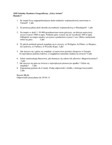 XIII Szkolny Konkurs Geograficzny „Góry świata” Runda 5 1. Ile stopni liczy najpopularniejsza skala trudności wspinaczkowej stosowana w Tatrach? 1 pkt 2. Za pomocą jakiej skali określa się trudność wspinaczkową w Himalajach? 1 pkt 3. Na mapie w skali 1: 50 000 przedstawiono teren górzysty, na którym najwyższy szczyt wynosi 1800 m npm. Podnóże góry wznosi się na wysokości 300 m npm. Odległość na mapie między szczytem a podnóżem wynosi 3 cm. Oblicz nachylenie stoku tej góry. 3 pkt 4. W jakich polskich górach znajdują się te szczyty: a) Waligóra, b) Pilsko, c) Skopiec, d) Lackowa, e) Turbacz, f) Wysoka Kopa. 2 pkt 5. Jak nazywa się i gdzie się znajduje: a) najwyższa przełęcz drogowa w Europie b) największa jaskinia lodowa, c) najgłębsza naturalna studnia na świecie? 6 pkt 6. Gdzie zamieszkują Hunzowie, jak tłumaczy się sekret ich zdrowia i długowieczności? 2 pkt 7. Jak nazywa się góra na świecie o największym pionowym spadku ? Gdzie się znajduje? 1 pkt 8. Zaproponuj pytanie do 6 rundy. Podaj odpowiedź i źródło, z którego korzystałeś 2 pkt Razem 18 pkt Odpowiedzi przesyłamy do 29.05.13