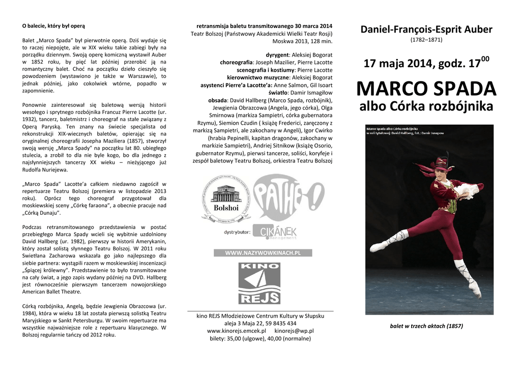 O balecie, który był operą Balet „Marco Spada” był pierwotnie operą. Dziś wydaje się to raczej niepojęte, ale w XIX wieku takie zabiegi były na porządku dziennym. Swoją operę komiczną wystawił Auber w 1852 roku, by pięć lat później przerobić ją na romantyczny balet. Choć na początku dzieło cieszyło się powodzeniem (wystawiono je także w Warszawie), to jednak później, jako cokolwiek wtórne, popadło w zapomnienie. Ponownie zainteresował się baletową wersją historii wesołego i sprytnego rozbójnika Francuz Pierre Lacotte (ur. 1932), tancerz, baletmistrz i choreograf na stałe związany z Operą Paryską. Ten znany na świecie specjalista od rekonstrukcji XIX-wiecznych baletów, opierając się na oryginalnej choreografii Josepha Maziliera (1857), stworzył swoją wersję „Marca Spady” na początku lat 80. ubiegłego stulecia, a zrobił to dla nie byle kogo, bo dla jednego z najsłynniejszych tancerzy XX wieku – nieżyjącego już Rudolfa Nuriejewa. retransmisja baletu transmitowanego 30 marca 2014 Teatr Bolszoj (Państwowy Akademicki Wielki Teatr Rosji) Moskwa 2013, 128 min. dyrygent: Aleksiej Bogorat choreografia: Joseph Mazilier, Pierre Lacotte scenografia i kostiumy: Pierre Lacotte kierownictwo muzyczne: Aleksiej Bogorat asystenci Pierre’a Lacotte’a: Anne Salmon, Gil Isoart światło: Damir Ismagiłow obsada: David Hallberg (Marco Spada, rozbójnik), Jewgienia Obrazcowa (Angela, jego córka), Olga Smirnowa (markiza Sampietri, córka gubernatora Rzymu), Siemion Czudin ( książę Frederici, zaręczony z markizą Sampietri, ale zakochany w Angeli), Igor Cwirko (hrabia Pepinelli, kapitan dragonów, zakochany w markizie Sampietri), Andriej Sitnikow (książę Osorio, gubernator Rzymu), pierwsi tancerze, soliści, koryfeje i zespół baletowy Teatru Bolszoj, orkiestra Teatru Bolszoj Daniel-François-Esprit Auber (1782–1871) 17 maja 2014, godz. 1700 MARCO SPADA albo Córka rozbójnika „Marco Spada” Lacotte’a całkiem niedawno zagościł w repertuarze Teatru Bolszoj (premiera w listopadzie 2013 roku). Oprócz tego choreograf przygotował dla moskiewskiej sceny „Córkę faraona”, a obecnie pracuje nad „Córką Dunaju”. Podczas retransmitowanego przedstawienia w postać przebiegłego Marca Spady wcieli się wybitnie uzdolniony David Hallberg (ur. 1982), pierwszy w historii Amerykanin, który został solistą słynnego Teatru Bolszoj. W 2011 roku Swietłana Zacharowa wskazała go jako najlepszego dla siebie partnera: wystąpili razem w moskiewskiej inscenizacji „Śpiącej królewny”. Przedstawienie to było transmitowane na cały świat, a jego zapis wydany później na DVD. Hallberg jest równocześnie pierwszym tancerzem nowojorskiego American Ballet Theatre. Córką rozbójnika, Angelą, będzie Jewgienia Obrazcowa (ur. 1984), która w wieku 18 lat została pierwszą solistką Teatru Maryjskiego w Sankt Petersburgu. W swoim repertuarze ma wszystkie najważniejsze role z repertuaru klasycznego. W Bolszoj regularnie tańczy od 2012 roku. WWW.NAZYWOWKINACH.PL kino REJS Młodzieżowe Centrum Kultury w Słupsku aleja 3 Maja 22, 59 8435 434 www.kinorejs.emcek.pl [email protected] bilety: 35,00 (ulgowe), 40,00 (normalne) balet w trzech aktach (1857) AKT PIERWSZY AKT DRUGI AKT TRZECI Scena pierwsza W pewnej wsi trwa wesele. Wieśniacy skarżą się księciu Osorio, gubernatorowi Rzymu, na niecne występki niejakiego Marca Spady. Choć nikt nigdy nie widział go na oczy, opowieści o kradzieżach dokonanych w najbliższej okolicy przez tego rozbójnika są głównym tematem rozmów wieśniaków. Do wsi wkracza pułk dragonów. Hrabia Pepinelli, ich kapitan, ulega czarowi obecnej na wiejskim weselu markizy Sampietri, córki gubernatora, lecz ta, jak na złość, zaręczona jest już z księciem Frederici. Pojawia się, przez nikogo nierozpoznany, Marco Spada, który zręcznie opróżnia kieszenie niczego nieświadomych zebranych. Kiedy okradzeni orientują się w sytuacji, jest już za późno. Deszcz zagania wieśniaków do domu. Na placu zostaje tylko zrozpaczony ojciec Boromeusz – wszak Marco Spada pozbawił całe towarzystwo środków, które mogłyby być przeznaczone na ofiarę! Gubernator Rzymu zaprasza Marca Spadę i jego córkę Angelę na bal. Książę Frederici zbiera się do tego, by poprosić Spadę o rękę Angeli, choć przecież zaręczony jest już z markizą Sampietri. Sytuację komplikuje pojawienie się ojca Boromeusza, który żali się, że został okradziony. Księżulo jest też pewien, że rozpozna złodzieja. Marco Spada wie, że najwyższy czas, by się ulotnić, jednak jest już za późno – ojciec Boromeusz wskazuje na niego! Wszystko w końcu staje się jasne. Zdruzgotana Angela oświadcza księciu Frederici, że w związku z zaistniałą, kompromitującą ją, sytuacją nie może zostać jego narzeczoną. Urażony książę natychmiast oficjalnie ogłasza swoje zaręczyny z markizą Sampietri. Teraz z kolei hrabia Pepinelli ma powód do zmartwienia, bo przecież kocha markizę... Scena pierwsza Hrabia Pepinelli postanawia po raz ostatni wyznać miłość markizie Sampietri, lecz ta, podjąwszy już decyzję, przyjmuje go ubrana w suknię ślubną... Nagle pojawiają się rozbójnicy i porywają zaskoczonego hrabiego wraz z równie zaskoczoną markizą. Scena druga Markiza Sampietri, jej ojciec, czyli gubernator Rzymu, oraz hrabia Pepinelli, zabłądziwszy podczas górskiej wędrówki, nie zdają sobie sprawy, że właśnie schronili się w kryjówce Marca Spady. Angela, córka rozbójnika, która ich przyjęła, jest z kolei kompletnie nieświadoma bandyckiej – starannie przecież przed nią skrywanej – działalności swego ojca. Przekonani, że nikogo tam nie zastaną, do kryjówki Marca Spady zachodzą jego towarzysze. Ulatniają się jednak natychmiast, kiedy zauważają, że nie są jedynymi gośćmi. Gdy w domu zjawia się Marco Spada, hrabia Pepinelli, który był świadkiem całego zajścia