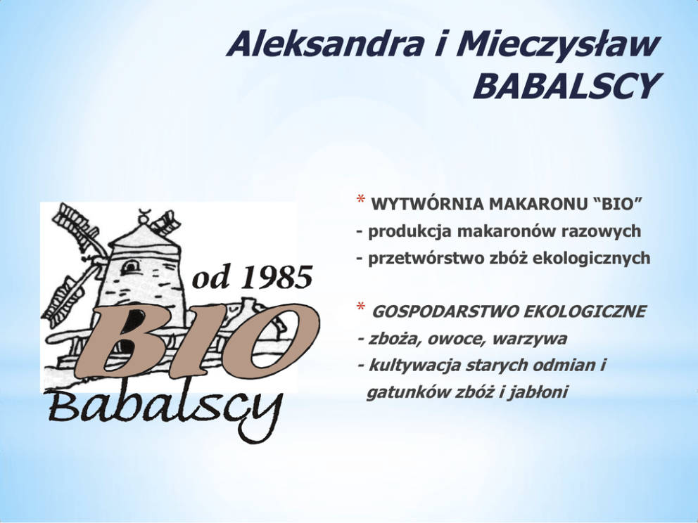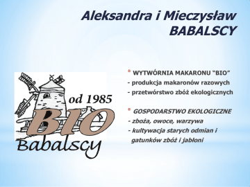 Aleksandra i Mieczysław BABALSCY * WYTWÓRNIA MAKARONU “BIO” - produkcja makaronów razowych - przetwórstwo zbóż ekologicznych * GOSPODARSTWO EKOLOGICZNE - zboża, owoce, warzywa - kultywacja starych odmian i gatunków zbóż i jabłoni WYTWÓRNIA MAKARONU “BIO” GOSPODARSTWO EKOLOGICZNE Aleksandra i Mieczysław BABALSCY * Gospodarstwo od 1985 r prowadzone metodami ekologicznymi o pow. 9,5 ha * * * * Atest Ekoland od 1990 r * * owoce: jabłka, wiśnie, czereśnie, śliwki, * poletka zachowawcze starych odmian i gatunków zbóż – ok. 60 * zwierzęta:4 szt. bydła: czerwona polska, - 100 szt. kury rasy zielononóżka kuropatwiana Certyfikat AGRO BIO TEST PL-EKO-07-90001 zboża: owies, pszenica, stare gatunki zbóż (pszenica orkisz, płaskurka, samopsza), szkółka zachowawcza oraz reprodukcja starych odmian jabłoni. WYTWÓRNIA MAKARONU “BIO” GOSPODARSTWO EKOLOGICZNE Aleksandra i Mieczysław BABALSCY * * * Przetwórstwo zbóż ekologicznych od 1991r Atest EKOLAND od 1994 r Nr P194 Certyfikat AGRO BIO TEST PL-EKO-07-04194 Produkcja: * makarony razowe: pszenne, żytnie, orkiszowe, * mąki razowe: pszenna, żytnia, orkiszowa, z owsiane i pszenny z ziołami płaskurki, samopszy, jęczmienna, owsiana, gryczana, grochowa * płatki zbożowe: pszenne, żytnie, jęczmienne, owsiane, orkiszowe * otręby: pszenne, żytnie, owsiane, orkiszowe, owsiane * kasze: jęczmienne, orkiszowe, gryczane, z płaskurki, z samopszy * ziarna zbóż, nasiona roślin strączkowych, poduszki i materace z łuski gryki i plew orkiszu. WYTWÓRNIA MAKARONU “BIO” GOSPODARSTWO EKOLOGICZNE Aleksandra i Mieczysław BABALSCY Grupa pierwszych rolników ekologicznych z atestem Ekolandu (1990 rok). WYTWÓRNIA MAKARONU “BIO” GOSPODARSTWO EKOLOGICZNE Aleksandra i Mieczysław BABALSCY Pionierzy rolnictwa ekologicznego. WYTWÓRNIA MAKARONU “BIO” GOSPODARSTWO EKOLOGICZNE Aleksandra i Mieczysław BABALSCY Uczestniczyliśmy w wielu kiermaszach, festynach, wystawach, seminariach, szkoleniach i innych imprezach WYTWÓRNIA MAKARONU “BIO” GOSPODARSTWO EKOLOGICZNE Aleksandra i Mieczysław BABALSCY Uczestniczyliśmy w wielu kiermaszach, festynach, wystawach, seminariach, szkoleniach i innych imprezach WYTWÓRNIA MAKARONU “BIO” GOSPODARSTWO EKOLOGICZNE Aleksandra i Mieczysław BABALSCY Uczestniczyliśmy w wielu kiermaszach, festynach, wystawach, seminariach, szkoleniach i innych imprezach * MOJE TRZY RADY: 1. Uczciwie pracować i handlować. 2. Jeść produkty ekologiczne. 3. Nie bać się konkurencji. WYTWÓRNIA MAKARONU “BIO” GOSPODARSTWO EKOLOGICZNE Nowe logo rolnictwa ekologicznego obowiązujące w całej Unii Europejskiej www.eko-lan.pl WIGILIA 2000r Żadna dziedzina ludzkiej działalności – nawet medycyna – nie ma takiego wpływu na zdrowie człowieka, jak rolnictwo. Pierre Delbet Dziękuję za uwagę