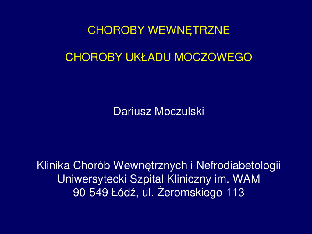 CHOROBY WEWNĘTRZNE CHOROBY UKŁADU MOCZOWEGO Dariusz Moczulski Klinika Chorób Wewnętrznych i Nefrodiabetologii Uniwersytecki Szpital Kliniczny im. WAM 90549 Łódź, ul. Żeromskiego 113 Niewydolność nerek Niewydolność nerek Upośledzenie funkcji wydzielniczej i regulatorowej nerek Usuwanie produktów przemiany materii mocznik, kreatynina, kwas moczowy Usuwanie nadmiaru kwasów Regulacja stężenia elektrolitów sodu potasu fosforanów nieorganicznych wapnia magnezu Regulacja gospodarki wodnej Usuwanie metabolitów leków Niewydolność nerek Upośledzenie funkcji wydzielniczej i regulatorowej nerek Regulacja ciśnienia tętniczego renina Regulacja tworzenia komórek układu czerwonokrwinkowego erytropoetyna Metabolizm witaminy D nerki są główną lokalizacją 1hydroksylazy witaminy D Metabolizm hormonów – insulina, prolaktyna Usuwanie toksyn bakteryjnych Niewydolność nerek (termin stary) Ostre uszkodzenie nerek odwracalne Przewlekła choroba nerek nieodwracalna Ostre uszkodzenie nerek Ostre uszkodzenie nerek Nagłe pogorszenie funkcji wydzielniczej nerek w ciągu godzin lub dni Spadek wydzielania toksyn mocznicowych Zaburzenia elektrolitowe, kawasowozasadowe i wodne Może być odwracalne!!! Ostre uszkodzenie nerek Przednerkowe Nerkowe Pozanerkowe Zaburzenia ukrwienia Hipowolemia Uszkodzenie toksyczne Zaburzony odpływ moczu Należy jak najszybciej znaleźć przyczynę i ją usunąć Nerki mogą wrócić do swojej pierwotnej funkcji Ostre uszkodzenie nerek Przyczyna przednerkowa Najczęstsza przyczyna to hypowolemia Nieprawidłowym nawodnieniem organizmu Odwodnieniem organizmu Wymioty, biegunka Szczególnie u ludzi starszych Ostre krwawienie, operacje chirurgiczne Ostre uszkodzenie nerek Przyczyna przednerkowa Leczenie Zapewnić prawidłowe nawodnienie!!! Uzupełnić utratę krwi W miarę możliwości leczenie zachowawcze bez hemodializ Leczenie nerkozastępcze hemodializa – do 6 tygodni Kontrola Diurezy – (bilans płynów) Ciśnienia tętniczego Kreatyniny Lektrolitów – sód, potas Gospodrki kwasowozasadowej – gazometria, HCO3 Ostre uszkodzenie nerek Przyczyna nerkowa Uszkodzenie toksyczne Leki Substancje toksyczne Nefropatia pokontrastowa Zespół zmiażdżenia Usunięcia przyczyny Postępowanie jak w ostrej przednerkowej niewydolności nerek Nefropatia kontrastowa Nefropatia kontrastowa jest najważniejszym klinicznie powikłaniem stosowania środków kontrastowych zawierających jod. Wykazuje ona związek ze zwiększoną śmiertelnością oraz z koniecznością stosowania terapii nerkozastępczej Klinicznie nefropatia kontrastowa objawia się pogorszeniem funkcji nerek pojawiającym się w ciągu 3 dni od podania środka kontrastowego Zwykle objawia się to wzrostem stężenia kreatyniny we krwi o co najmniej 0,5 mg/dl (44 µmol/l) lub względnym wzrostem o co najmniej 25% wartości wyjściowej Większość epizodów nefropatii kontrastowej nie wymaga leczenia i zanika po 10 dniach Istnieją jednak dowody, że nawet niewielki wzrost stężenia kreatyniny w surowicy krwi ma związek ze zwiększoną śmiertelnością Patomechanizm powstania nefropatii kontrastowej nie jest dobrze znany Najprawdopodobniej powstaje ona wskutek zmniejszenia perfuzji nerkowej powodującej lokalne niedokrwienie oraz wskutek toksycznego uszkodzenia kanalików nerkowych Środki kontrastowe dzieli się w zależności od ich osmolarności na: wysokoosmolarne 2000 mOsm/kg niskoosmolarne 600800 mOsm/kg niejonowe monomery [iohexol, iopromide, •iopamidol, iomeprol jonowe dimery [ioxaglate] izoosmolarne 290 mOsm/kg [iodixanol] Osoby z prawidłową funkcją nerek i bez rozpoznanych czynników ryzyka nefropatii kontrastowej nie wymagają dodatkowych badań lub interwencji profilaktycznych przed angiografią U chorych z prawdopodobnym upośledzeniem funkcji nerek zaleca się wykonanie pomiaru stężenia kreatyniny w surowicy krwi, oszacowanie współczynnika filtracji kłębuszkowej (GFR) Przy GFR mniejszym niż 50 ml/minutę/1,73 m2, szczególnie przy innych czynnikach ryzyka, należy rozważyć zastosowanie innych badań obrazowych CZYNNIKI RYZYKA NEFROPATII KONTRASTOWEJ Związane z chorym Przewlekła niewydolność nerek Cukrzyca Procedura nagła/planowana Zastoinowa niewydolność krążenia Wiek Nadciśnienie tętnicze lub niskie ciśnienie tętnicze Niedokrwistość Frakcja wyrzutowa lewej komory poniżej 40% Nie związane z chorym Osmolarność środka kontrastowego Jonowy środek kontrastowy Objętość środka kontrastowego Jeżeli konieczne jest użycie środka kontrastowego, należy użyć środka niskoosmolarnego stosując możliwie najniższą dawkę Pomiary stężenia kreatyniny w surowicy krwi powinny zostać powtórzone 24 do 48 godzin po podaniu środka kontrastowego Zwiększyć spożycie spożywanych płynów doustnie!!! U osób z podwyższonym ryzykiem nefropatii kontrastowej należy rozważyć podaż 0,9% soli fizjologicznej w dawce 1 ml na kilogram masy ciała na godzinę dożylnie 12 godzin przed podażą środka kontrastowego oraz do 12 godzin po podaży, z uważną obserwacją gospodarki wodnoelektrolitowej. Ostre uszkodzenie nerek Przyczyna pozanerkowa Zaburzony odpływ moczu Kamica nerkowa Przerost prostaty Rak szyjki macicy Diagnostyka USG Leczenie: przekazanie do urologa w celu zapewnienia odpływu moczu Ostre uszkodzenie nerek Przebieg Do 6 tygodni, po 6 tygodniach mówimy o przewlekłej niewydolności nerek Anuria < 100 ml/24 h Oliguria < 400 ml/24 h– oddawanie małej ilości moczu Poliuria > 3 l/24 h W stadium poliurii chory oddaje duże ilości rozcieńczonego moczu. Poliuria jest dobrym wskaźnikiem prognostycznym, choć może nadal istnieć konieczność wyrównywania zaburzeń wodnoelektolitowych łącznie z hemodializą Ostre uszkodzenie nerek Leczenie nerkozastępcze hemodializa – do 6 tygodni Wskazania Hiperkalemia > 6,0 mmol/l Wysokie trudne do opanowania nadciśnienie tętnicze Przewodnienie, Obrzęk płuc Kwasica metaboliczna HCO3 < 15 mmol/l Ostre u