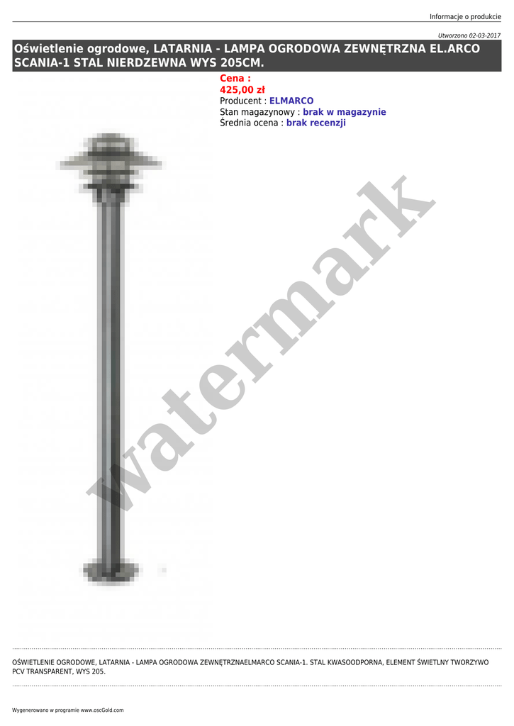 Informacje o produkcie Utworzono 02-03-2017 Oświetlenie ogrodowe, LATARNIA - LAMPA OGRODOWA ZEWNĘTRZNA EL.ARCO SCANIA-1 STAL NIERDZEWNA WYS 205CM. Cena : 425,00 zł w at er m ar k Producent : ELMARCO Stan magazynowy : brak w magazynie Średnia ocena : brak recenzji OŚWIETLENIE OGRODOWE, LATARNIA - LAMPA OGRODOWA ZEWNĘTRZNAELMARCO SCANIA-1. STAL KWASOODPORNA, ELEMENT ŚWIETLNY TWORZYWO PCV TRANSPARENT, WYS 205. Wygenerowano w programie www.oscGold.com