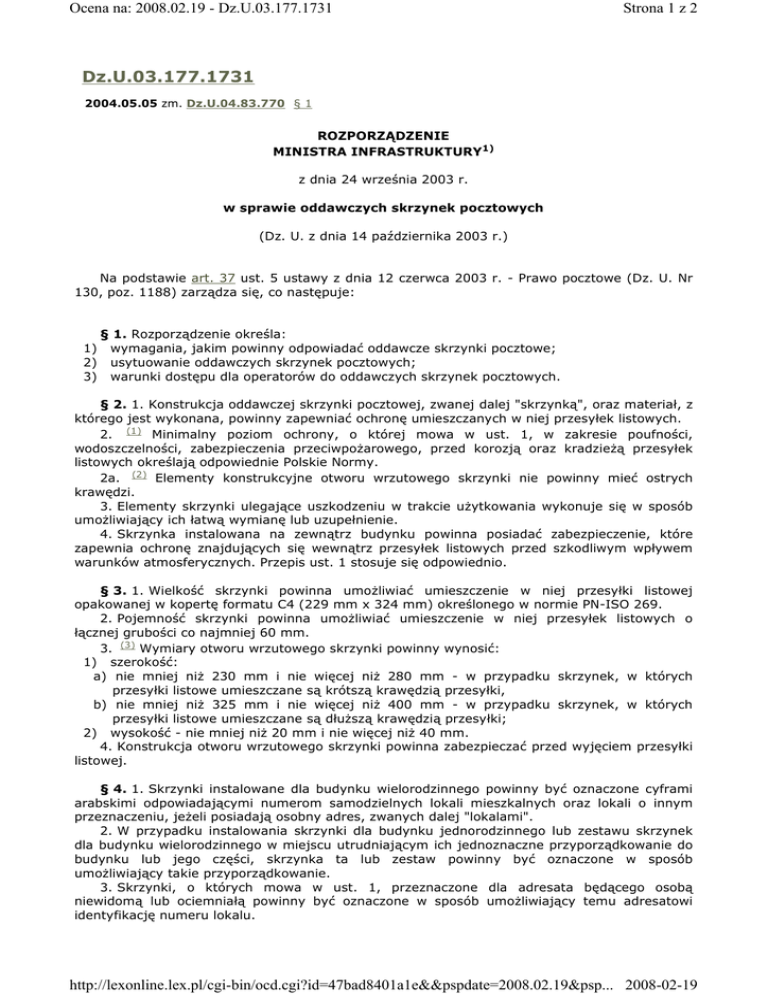 Ocena na: 2008.02.19 - Dz.U.03.177.1731 Strona 1 z 2 Dz.U.03.177.1731 2004.05.05 zm. Dz.U.04.83.770 § 1 ROZPORZĄDZENIE MINISTRA INFRASTRUKTURY1) z dnia 24 września 2003 r. w sprawie oddawczych skrzynek pocztowych (Dz. U. z dnia 14 października 2003 r.) Na podstawie art. 37 ust. 5 ustawy z dnia 12 czerwca 2003 r. - Prawo pocztowe (Dz. U. Nr 130, poz. 1188) zarządza się, co następuje: 1) 2) 3) § 1. Rozporządzenie określa: wymagania, jakim powinny odpowiadać oddawcze skrzynki pocztowe; usytuowanie oddawczych skrzynek pocztowych; warunki dostępu dla operatorów do oddawczych skrzynek pocztowych. § 2. 1. Konstrukcja oddawczej skrzynki pocztowej, zwanej dalej "skrzynką", oraz materiał, z którego jest wykonana, powinny zapewniać ochronę umieszczanych w niej przesyłek listowych. 2. (1) Minimalny poziom ochrony, o której mowa w ust. 1, w zakresie poufności, wodoszczelności, zabezpieczenia przeciwpoŜarowego, przed korozją oraz kradzieŜą przesyłek listowych określają odpowiednie Polskie Normy. 2a. (2) Elementy konstrukcyjne otworu wrzutowego skrzynki nie powinny mieć ostrych krawędzi. 3. Elementy skrzynki ulegające uszkodzeniu w trakcie uŜytkowania wykonuje się w sposób umoŜliwiający ich łatwą wymianę lub uzupełnienie. 4. Skrzynka instalowana na zewnątrz budynku powinna posiadać zabezpieczenie, które zapewnia ochronę znajdujących się wewnątrz przesyłek listowych przed szkodliwym wpływem warunków atmosferycznych. Przepis ust. 1 stosuje się odpowiednio. § 3. 1. Wielkość skrzynki powinna umoŜliwiać umieszczenie w niej przesyłki listowej opakowanej w kopertę formatu C4 (229 mm x 324 mm) określonego w normie PN-ISO 269. 2. Pojemność skrzynki powinna umoŜliwiać umieszczenie w niej przesyłek listowych o łącznej grubości co najmniej 60 mm. 3. (3) Wymiary otworu wrzutowego skrzynki powinny wynosić: 1) szerokość: a) nie mniej niŜ 230 mm i nie więcej niŜ 280 mm - w przypadku skrzynek, w których przesyłki listowe umieszczane są krótszą krawędzią przesyłki, b) nie mniej niŜ 325 mm i nie więcej niŜ 400 mm - w przypadku skrzynek, w których przesyłki listowe umieszczane są dłuŜszą krawędzią przesyłki; 2) wysokość - nie mniej niŜ 20 mm i nie więcej niŜ 40 mm. 4. Konstrukcja otworu wrzutowego skrzynki powinna zabezpieczać przed wyjęciem przesyłki listowej. § 4. 1. Skrzynki instalowane dla budynku wielorodzinnego powinny być oznaczone cyframi arabskimi odpowiadającymi numerom samodzielnych lokali mieszkalnych oraz lokali o innym przeznaczeniu, jeŜeli posiadają osobny adres, zwanych dalej "lokalami". 2. W przypadku instalowania skrzynki dla budynku jednorodzinnego lub zestawu skrzynek dla budynku wielorodzinnego w miejscu utrudniającym ich jednoznaczne przyporządkowanie do budynku lub jego części, skrzynka ta lub zestaw powinny być oznaczone w sposób umoŜliwiający takie przyporządkowanie. 3. Skrzynki, o których mowa w ust. 1, przeznaczone dla adresata będącego osobą niewidomą lub ociemniałą powinny być oznaczone w sposób umoŜliwiający temu adresatowi identyfikację numeru lokalu. http://lexonline.lex.pl/cgi-bin/ocd.cgi?id=47bad8401a1e&&pspdate=2008.02.19&psp... 2008-02-19 Ocena na: 2008.02.19 - Dz.U.03.177.1731 Strona 2 z 2 § 5. 1. Skrzynka powinna być zamykana niepowtarzalnym kluczem w celu zagwarantowania dostępu do zawartości skrzynki wyłącznie adresatowi. 2. Klucz do skrzynki adresat otrzymuje od właściciela lub współwłaściciela nieruchomości albo jego upowaŜnionego przedstawiciela z chwilą uzyskania uprawnień do korzystania z danego lokalu. § 6. 1. Skrzynki lub ich zestawy powinny być umieszczane w miejscu dostępnym dla adresatów i operatorów. 2. W budynku wielorodzinnym posiadającym kilka wejść przy kaŜdym z nich moŜe być zainstalowany zestaw lub zestawy skrzynek w liczbie odpowiadającej liczbie lokali znajdujących się w danej części budynku. 3. Skrzynki lub ich zestawy powinny być instalowane w sposób trwały, nie niŜej niŜ 700 mm, mierząc od podłoŜa do dolnej krawędzi skrzynki, i nie wyŜej niŜ 1.600 mm, mierząc od podłoŜa do górnej krawędzi ostatniej skrzynki. 4. W budynku wielorodzinnym skrzynki znajdujące się najniŜej w zestawie powinny być przydzielane osobom poruszającym się za pomocą wózka inwalidzkiego. § 7. Dla operatorów miejscem dostępu do skrzynki jest otwór wrzutowy, o którym mowa w § 3 ust. 3. § 8. Traci moc rozporządzenie Ministra Łączności z dnia 13 listopada 1995 r. w sprawie warunków technicznych, jakim powinny odpowiadać skrzynki do doręczania korespondencji, oraz zasad zakładania i uŜytkowania tych skrzynek (Dz. U. z 1996 r. Nr 1, poz. 6). § 9. Rozporządzenie wchodzi w Ŝycie po upływie 14 dni od dnia ogłoszenia. ________ 1) Minister Infrastruktury kieruje działem administracji rządowej - łączność, na podstawie § 1 ust. 2 pkt 3 rozporządzenia Prezesa Rady Ministrów z dnia 29 marca 2002 r. w sprawie szczegółowego zakresu działania Ministra Infrastruktury (Dz. U. Nr 32, poz. 302 oraz z 2003 r. Nr 19, poz. 165 i Nr 141, poz. 1359). 1) § 2 ust. 2 zmieniony przez § 1 pkt 1 lit. a) rozporządzenia z dnia 15 kwietnia 2004 r. (Dz.U.04.83.770) zmieniającego nin. rozporządzenie z dniem 5 maja 2004 r. 2) § 2 ust. 2a dodany przez § 1 pkt 1 lit. b) rozporządzenia z dnia 15 kwietnia 2004 r. (Dz.U.04.83.770) zmieniającego nin. rozporządzenie z dniem 5 maja 2004 r. 3) § 3 ust. 3 zmieniony przez § 1 pkt 2 rozporządzenia z dnia 15 kwietnia 2004 r. (Dz.U.04.83.770) zmieniającego nin. rozporządzenie z dniem 5 maja 2004 r. Aktualizacja z dnia: 19.02.2008 © Wolters Kluwer Polska Sp. z o.o. Redakcja 81-855 Sopot, ul. Rzemieślnicza 7 www.LEX.com.pl, e-mail [email protected] tel. 058 76 76 000, fax 058 76 76 202, infolinia 0 801 802 888 http://lexonline.lex.pl/cgi-bin/ocd.cgi?id=47bad8401a1e&&pspdate=2008.02.19&psp... 2008-02-19