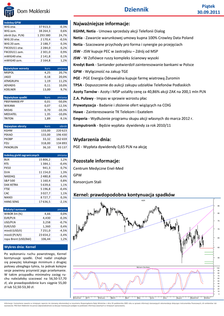 Piątek 30.09.2011 Dziennik Indeksy GPW WIG otw. WIG zam. obrót (tys. PLN) WIG 20 otw. WIG 20 zam. FW20U11 otw. FW20U11 zam. mWIG40 otw. mWIG40 zam. 37 913,3 38 264,3 1 293 380 2 170,4 2 188,7 2 284,0 2 301,0 2 141,8 2 164,8 -0,3% 0,6% 24,7% -0,5% 0,3% 0,2% 0,9% 0,1% 1,2% Największe wzrosty MISPOL JAGO ATMGRUPA ADVADIS KOELNER kurs 4,25 0,18 1,19 0,11 13,00 zmiana 20,7% 20,0% 11,2% 10,0% 9,7% Największe spadki PBSFINANSE-PP WIKANA MIDAS MEDIATEL TRITON kurs 0,01 0,07 0,70 1,35 1,89 zmiana -50,0% -12,5% -10,3% -10,0% -9,1% Najwyższe obroty KGHM PEKAO PKOBP PZU PKNORLEN kurs 133,00 133,00 33,32 318,00 36,10 obrót 220 623 196 430 162 659 134 893 93 137 Indeksy giełd zagranicznych BUX 15 806,2 RTS 1 384,1 PX50 941,3 DJIA 11 154,0 NASDAQ 2 480,8 S&P 500 1 160,4 DAX XETRA 5 639,6 FTSE 5 196,8 CAC 3 027,7 NIKKEI 8 727,7 HANG SENG 17 636,5 zmiana 1,2% -0,4% 0,7% 1,3% -0,4% 0,8% 1,1% -0,4% 1,1% 0,3% -2,1% Waluty i surowce WIBOR 3m (%) EUR/PLN USD/PLN EUR/USD miedź (USD/t) miedź (PLN/t) ropa Brent (USD/bbl) zmiana 0,0% -0,3% -0,7% 0,4% -4,5% -3,4% 1,2% Najważniejsze informacje: KGHM, Netia - Umowa sprzedaży akcji Telefonii Dialog Netia - Zawarcie warunkowej umowy kupna 100% Crowley Data Poland Netia - Szacowane przychody pro forma i synergie po przejęciach JSW - JSW kupuje PEC w Jastrzębiu – Zdrój od MSP JSW - W Zofiówce ruszy kompleks ścianowy wysoki Kredyt Bank - Santander potwierdził zainteresowanie bankami w Polsce GPW - Wyłącznośd na zakup TGE PGE - PGE Energia Odnawialna kupuje farmę wiatrową Żuromin TPSA - Dopuszczenie do aukcji zakupu udziałów Telefonów Podlaskich Azoty Tarnów - Azoty i MSP ustaliły cenę za 40,86% akcji ZAK na 200,1 mln PLN Z.A. Puławy - Impas w sprawie wzrostu płac Prywatyzacja - Badanie i złożenie ofert wiążących na COIG Hawe - Zainteresowanie TK Telekom i Exatelem Emperia - Wydłużenie programu skupu akcji własnych do marca 2012 r. Komputronik - Będzie wypłata dywidendy za rok 2010/11 Wydarzenia dnia: PGE - Wypłata dywidendy 0,65 PLN na akcję Pozostałe informacje: Centrum Medyczne Enel-Med GPW Konsorcjum Stali Kernel: prawdopodobna kontynuacja spadków KER 85 4,66 4,430 3,258 1,360 7 251,0 23 654,2 106,44 80 75 70 65 Wykres dnia: Kernel 60 Po wykonaniu ruchu powrotnego, Kernel kontynuuje spadki. Chod nadal znajduje się powyżej lokalnego minimum z drugiej połowy ubiegłego tylnia, to jednak kolejne sesje powinny przynieśd jego przełamanie. W takim przypadku minimalny zasięg ruchu należałoby szacowad na 56,50-57,70 zł, ale prawdopodobnie kurs sięgnie 55,00 zł lub 52,50-53,30 zł. 55 Mid-term Oscillator 100 90 80 70 60 50 40 30 20 10 0 December 2011 February March April May June July August September October Informacje i komentarze zawarte w niniejszym raporcie nie stanowią rekomendacji w rozumieniu Rozporządzenia Rady Ministrów z dnia 19 października 2005 roku w sprawie informacji stanowiących rekomendacje dotyczące instrumentów finansowych, ich emitentów lub wystawców. PKO Dom Maklerski nie ponosi odpowiedzialności za decyzje inwestycyjne podjęte na podstawie informacji zawartych w niniejszym opracowaniu. Dziennik Najważniejsze informacje KGHM, Netia Umowa sprzedaży akcji Telefonii Dialog KGHM oraz Netia zawarły warunkową, zobowiązującą umowę sprzedaży 19.598.000 akcji spółki Telefonia Dialog, które stanowią 100% kapitału zakładowego Dialogu. Zgodnie z umową cena sprzedaży akcji wyniesie 944 miliony PLN. Informacja jest pozytywna dla KGHM, który sprzeda swoje aktywa pozaoperacyjne i pozyska gotówkę na inwestycje w złoża. Cenę sprzedaży (4,72 PLN na akcję; EV/EBITDA 6,4x) oceniamy jako atrakcyjną dla KGHM. Implikuje ona dodatkowy zysk ze sprzedaży powyżej wartości księgowej na poziomie 119 mln PLN, czyli 0,6 PLN na akcję. (A. Iwaoski) Netia Zawarcie warunkowej umowy kupna 100% Crowley Data Poland Netia oraz spółki Crowley Data, L.L.C. i Crowley Poland, L.L.C. zawarły w dniu 29 września warunkową zobowiązującą umowę sprzedaży 197.862 udziałów spółki Crowley Data Poland Sp. z o.o. stanowiących 100% kapitału zakładowego. Zgodnie z umową cena nabycia udziałów wyniesie 31,8 miliona USD. Netia Szacowane przychody pro forma i synergie po przejęciu Telefonii Dialog i Crowleya Netia szacuje przychody pro forma w 2011 roku, po przejęciu Telefonii Dialog i Crowley Data Poland, na 2,25 mld PLN wobec 1,61 mld PLN w obecnej prognozie na 2011 r. Spółka zaznacza jednak, że szacowane przychody pro forma nie są nową prognozą grupy na 2012 rok. Szacowana EBITDA pro forma wyniesie 561 mln PLN wobec prognozowanych na 2011 rok 405 mln PLN, a marża EBITDA 25%, czyli tak samo jak w tegorocznej prognozie. Netia zakłada osiągnięcie ponad 106 mln PLN synergii w skali roku po przejęciu Telefonii Dialog i Crowley Data Poland. Proces integracji i utworzenia Nowej Netii zajmie do dwóch lat, przy czym większośd synergii powinna zostad osiągnięta w ciągu 12 miesięcy po zamknięciu. Netia spodziewa się zamknięcia transakcji przejęcia Telefonii Dialog i Crowley Data Poland w ciągu najbliższych 3-4 miesięcy. JSW JSW kupuje PEC w Jastrzębiu – Zdrój od MSP Ministerstwo Skarbu Paostwa podpisało umowę sprzedaży 85% akcji Przedsiębiorstwa Energetyki Cieplnej w Jastrzębiu - Zdroju spółce energetycznej Jastrzębie z grupy JSW. Oczekujemy ceny w przedziale 100-150 mln PLN. (A. Iwaoski) JSW W Zofiówce ruszy kompleks ścianowy wysoki W kopalni Zofiówka w październiku w ścianie G-4 rozpocznie pracę najwyższy w polskim górnictwie zmechanizowany kompleks ścianowy, który może pracowad na wysokości powyżej 5 metrów. Eksploatacja kompleksem spowoduje zwiększenie wykorzystania zasobów pokładu o około 55 tysięcy ton. JSW podała, że aktualnie posiadane przez kopalnię wyposażenie ścian umożliwia eksploatację pokładów wyłącznie o miąższości do 3,6 m. (A. Iwaoski) Kredyt Bank Santander potwierdził zainteresowanie bankami w Polsce Prezes Santande