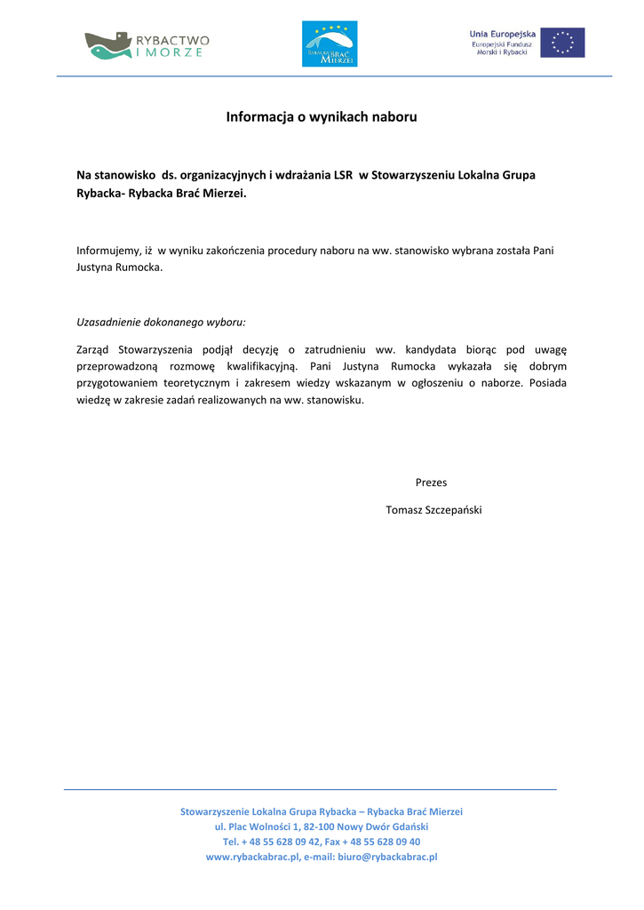 Informacja o wynikach naboru Na stanowisko ds. organizacyjnych i wdrażania LSR w Stowarzyszeniu Lokalna Grupa Rybacka- Rybacka Brać Mierzei. Informujemy, iż w wyniku zakończenia procedury naboru na ww. stanowisko wybrana została Pani Justyna Rumocka. Uzasadnienie dokonanego wyboru: Zarząd Stowarzyszenia podjął decyzję o zatrudnieniu ww. kandydata biorąc pod uwagę przeprowadzoną rozmowę kwalifikacyjną. Pani Justyna Rumocka wykazała się dobrym przygotowaniem teoretycznym i zakresem wiedzy wskazanym w ogłoszeniu o naborze. Posiada wiedzę w zakresie zadań realizowanych na ww. stanowisku. Prezes Tomasz Szczepański Stowarzyszenie Lokalna Grupa Rybacka – Rybacka Brać Mierzei ul. Plac Wolności 1, 82-100 Nowy Dwór Gdański Tel. + 48 55 628 09 42, Fax + 48 55 628 09 40 www.rybackabrac.pl, e-mail: [email protected] Stowarzyszenie Lokalna Grupa Rybacka – Rybacka Brać Mierzei ul. Plac Wolności 1, 82-100 Nowy Dwór Gdański Tel. + 48 55 628 09 42, Fax + 48 55 628 09 40 www.rybackabrac.pl, e-mail: [email protected]