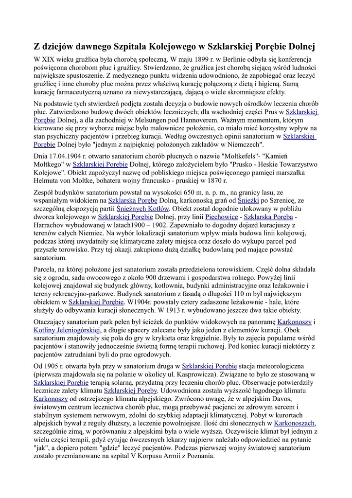 Z dziejów dawnego Szpitala Kolejowego w Szklarskiej Porębie Dolnej W XIX wieku gruźlica była chorobą społeczną. W maju 1899 r. w Berlinie odbyła się konferencja poświęcona chorobom płuc i gruźlicy. Stwierdzono, że gruźlica jest chorobą siejącą wśród ludności największe spustoszenie. Z medycznego punktu widzenia udowodniono, że zapobiegać oraz leczyć gruźlicę i inne choroby płuc można przez właściwą kurację połączoną z dietą i higieną. Samą kurację farmaceutyczną uznano za niewystarczającą, dającą o wiele skromniejsze efekty. Na podstawie tych stwierdzeń podjęta została decyzja o budowie nowych ośrodków leczenia chorób płuc. Zatwierdzono budowę dwóch obiektów leczniczych; dla wschodniej części Prus w Szklarskiej Porębie Dolnej, a dla zachodniej w Melsungen pod Hannoverem. Ważnym momentem, którym kierowano się przy wyborze miejsc było malownicze położenie, co miało mieć korzystny wpływ na stan psychiczny pacjentów i przebieg kuracji. Według ówczesnych opinii sanatorium w Szklarskiej Porębie Dolnej było "jednym z najpiękniej położonych zakładów w Niemczech". Dnia 17.04.1904 r. otwarto sanatorium chorób płucnych o nazwie "Moltkefels"- "Kamień Moltkego" w Szklarskiej Porębie Dolnej, którego założycielem było "Prusko - Heskie Towarzystwo Kolejowe". Obiekt zapożyczył nazwę od pobliskiego miejsca poświęconego pamięci marszałka Helmuta von Moltke, bohatera wojny francusko - pruskiej w 1870 r. Zespół budynków sanatorium powstał na wysokości 650 m. n. p. m., na granicy lasu, ze wspaniałym widokiem na Szklarską Porębę Dolną, karkonoską grań od Śnieżki po Szrenicę, ze szczególną ekspozycją partii Śnieżnych Kotłów. Obiekt został dogodnie ulokowany w pobliżu dworca kolejowego w Szklarskiej Porębie Dolnej, przy linii Piechowice - Szklarska Poręba Harrachov wybudowanej w latach1900 – 1902. Zapewniało to dogodny dojazd kuracjuszy z terenów całych Niemiec. Na wybór lokalizacji sanatorium wpływ miała budowa linii kolejowej, podczas której uwydatniły się klimatyczne zalety miejsca oraz doszło do wykupu parcel pod przyszłe torowisko. Przy tej okazji zakupiono dużą działkę budowlaną pod mające powstać sanatorium. Parcela, na której położone jest sanatorium została przedzielona torowiskiem. Część dolna składała się z ogrodu, sadu owocowego z około 900 drzewami i gospodarstwa rolnego. Powyżej linii kolejowej znajdował się budynek główny, kotłownia, budynki administracyjne oraz leżakownie i tereny rekreacyjno-parkowe. Budynek sanatorium z fasadą o długości 110 m był największym obiektem w Szklarskiej Porębie. W1904r. powstały cztery zadaszone leżakownie - hale, które służyły do odbywania kuracji słonecznych. W 1913 r. wybudowano jeszcze dwa takie obiekty. Otaczający sanatorium park pełen był ścieżek do punktów widokowych na panoramę Karkonoszy i Kotliny Jeleniogórskiej, a długie spacery zalecane były jako jeden z elementów kuracji. Obok sanatorium znajdowały się pola do gry w krykieta oraz kręgielnie. Były to zajęcia popularne wśród pacjentów i stanowiły jednocześnie świetną formę terapii ruchowej. Pod koniec kuracji niektórzy z pacjentów zatrudniani byli do prac ogrodowych. Od 1905 r. otwarta była przy w sanatorium druga w Szklarskiej Porębie stacja meteorologiczna (pierwsza znajdowała się na polanie w okolicy ul. Kasprowicza). Związane to było ze stosowaną w Szklarskiej Porębie terapią solarną, przydatną przy leczeniu chorób płuc. Obserwacje potwierdziły lecznicze zalety klimatu Szklarskiej Poręby. Udowodniona została wyższość łagodnego klimatu Karkonoszy od ostrzejszego klimatu alpejskiego. Zwrócono uwagę, że w alpejskim Davos, światowym centrum lecznictwa chorób płuc, mogą przebywać pacjenci ze zdrowym sercem i stabilnym systemem nerwowym, zdolni do szybkiej adaptacji klimatycznej. Pobyt w kurortach alpejskich bywał z reguły dłuższy, a leczenie powolniejsze. Ilość dni słonecznych w Karkonoszach, szczególnie zimą, w porównaniu z alpejskimi była o wiele wyższa. Oczywiście klimat był jednym z wielu części terapii, gdyż cytując ówczesnych lekarzy najpierw należało odpowiedzieć na pytanie "jak", a dopiero potem "gdzie" leczyć pacjentów. Podczas pierwszej wojny światowej sanatorium zostało przemianowane na szpital V Korpusu Armii z Poznania. W pierwszych latach powojennych sanatorium dotknęły kłopoty gospodarcze. Duże trudności, szczególnie w zaopatrzeniu w żywność oraz opał przeżywało sanatorium podczas inflacji i kryzysu lat 1922-1923. Doprowadziło to do wstrzymania przyjęć pacjentów na początku 1924 r. W połowie lat dwudziestych powtórzyły się przejściowe trudności z pełnym obłożeniem sanatorium w okresie zimowym. Z trudnych lat kryzysu zostały wyciągnięte wnioski. Sanatorium w Szklarskiej Porębie postanowiło uniezależnić się od sytuacji gospodarczej. W 1927 r. zakupiono gospodarstwo rolne o powierzchni około 76,5 ha w Cieplicach Śląskich. Dostarczano pacjentom jaja, masło, warzywa i świeże mleko, którego podawanie traktowano jako jeden z zabiegów leczniczych. Gospodarstwo zaopatrywało sanatorium również w cielęcinę, baraninę i wieprzowinę. Mięso było w miarę potrzeb przetwarzane w zakładzie wędliniarskim znajdującym się na terenie sanatorium. W 1928 r. około 2 / 3 produktów spożywczych dostarczanych do sanatorium pochodziło z własnych gospodarstw rolnych. W okresach pomyślnej sytuacji finansowej zakładu w budynkach szpitalnych wprowadzano techniczne ulepszenia służące do poprawy obsługi chorych i warunków bytowych (aparaty Röntgena, nowoczesne wyposażenie kotłowni, kuchni czy pralni). Jako chirurgiczne metody lecznicze w wypadkach gruźlicy stosowano odmy gazowe (pneumothorax), likwidację przepon płucnych i usunięcie chorego fragmentu płata płucnego. Zwracano uwagę na fakt powiązania leczen
