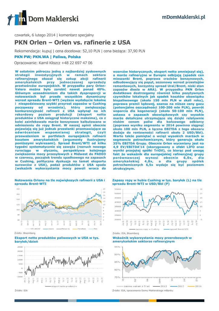 czwartek, 6 lutego 2014 | komentarz specjalny PKN Orlen – Orlen vs. rafinerie z USA Rekomendacja: kupuj | cena docelowa: 52,10 PLN | cena bieżąca: 37,90 PLN PKN PW; PKN.WA | Paliwa, Polska Opracowanie: Kamil Kliszcz +48 22 697 47 06 W ostatnim półroczu jedną z najbardziej zyskownych strategii inwestycyjnych w ramach sektora rafineryjnego okazał się zakup akcji rafinerii amerykańskich przy jednoczesnej sprzedaży przetwórców europejskich. W przypadku pary OrlenValero można było zarobić nawet ponad 40%. Głównym uzasadnieniem dla takich dysproporcji w notowaniach był przede wszystkim dynamiczny wzrost spreadu Brent-WTI (wyższe wydobycie lokalne i niespodziewany szybki przyrost zapasów w Cushing począwszy od września), który zwiększając konkurencyjność rafinerii z USA wpłynął na ich rekordowy poziom produkcji (eksport netto produktów z USA osiągnął historyczne maksima), co z kolei zainfekowało marże benzynowe kalkulowane w odniesieniu do ropy Brent. W naszej opinii obecnie pojawiają się już jednak przesłanki przemawiające za odwróceniem wspomnianej strategii, czyli przeważeniem w portfelach europejskich rafinerii kosztem amerykańskich (argumenty ilustrujemy poniższymi wykresami). Spread Brent/WTI od kilku tygodni systematycznie się zawęża (rozruch nowego rurociągu w styczniu, perspektywa kolejnego zwiększenia mocy przesyłowych z Midwest do PADD3 w czerwcu, początek trendu spadkowego na zapasach w Cushing, polityczna dyskusja na temat eksportu surowców z USA), podaż produktów z USA spada (wskaźnik wykorzystania mocy powoli wraca do wzorców historycznych, eksport netto zmniejszył się), a marże rafineryjne w Europie odbijają (spadek cen mieszanki Brent, poprawa cracków benzynowych, odbudowujący się popyt, sezonowy wzrost przestojów remontowych, korzystny spread Ural/Brent, niski stan zapasów diesla w ARA). W przypadku PKN Orlen dodatkowo dostrzegamy również kilka pozytywnych czynników lokalnych jak spadek kosztów obowiązku biopaliwowego (około 150 mln PLN w skali roku), poprawa premii lądowej, szansa na niższe ceny gazu (potencjalne oszczędności 100-200 mln PLN), powrót wsparcia dla kogeneracji (około 50-100 mln PLN), ustawa o zapasach obowiązkowych czy wysokie marże detaliczne utrzymujące się dzięki relatywnie niskim cenom paliw dla końcowego odbiorcy (poprawa wyniku segmentu w 2014 powinna sięgnąć około 100 mln PLN, a łączna EBITDA z tego obszaru dodaje do rentowności rafinerii około 2 USD/Bbl). Warto także pamiętać o wciąż wysokich marżach w segmencie petrochemicznym, który generuje około 35% EBITDA Grupy. Obecnie Orlen wyceniany jest na 4,9 EV/EBITDA’14 (skorygowany o efekt LIFO oraz wyniki przejętej spółki TriOil), co biorąc pod uwagę fakt że wskaźnik dla europejskiej rafineryjnej grupy porównawczej wynosi obecnie 6,0x, dla amerykańskiej 4,8x, a dla grupy spółek petrochemicznych 6,5x wydaje się być poziomem atrakcyjnym. Notowania Orlenu na tle największych rafinerii z USA i spreadu Brent-WTI Zapasy ropy w hubie Cushing w tys. baryłek (L) na tle spreadu Brent-WTI w USD/Bbl (P) Źródło: Bloomberg Źródło: EIA, Bloomberg Eksport netto produktów paliwowych w USA w tys. baryłek/dzień Wskaźnik wykorzystania mocy przerobowych w amerykańskim sektorze rafineryjnym Źródło: EIA Źródło: EIA, opracowanie Domu Maklerskiego mBanku Benchmarkowa marża rafineryjna Orlenu z uwzględnieniem dyferencjału w USD/Bbl Europejskie marże produktowe na benzynie i dieslu w USD/Bbl Źródło: Bloomberg, szacunki Domu Maklerskiego mBanku Źródło: EIA, Bloomberg Zapasy diesla w portach ARA w tys. ton na tle przedziału wahań z ostatnich 5 lat Popyt na benzynę w USA w tys. baryłek/dzień na tle przedziału wahań z ostatnich 5 lat Źródło: Reuters, opracowanie Domu Maklerskiego mBanku Źródło: EIA, opracowanie Domu Maklerskiego mBanku Relatywna siła notowań Brent na tle indeksu surowcowego CRB Poziom globalnych przestojów remontowych w mln baryłek/dzień Źródło: Bloomberg, opracowanie Domu Maklerskiego mBanku Źródło: Bloomberg, opracowanie Domu Maklerskiego mBanku Poglądowa premia lądowa na dieslu na rynku polskimindeks Ważona marża detaliczna na paliwach w Polsce w PLN/litr Źródło: Bloomberg, Eurostat, szacunki Domu Maklerskiego mBanku Źródło: szacunki Domu Maklerskiego mBanku na podstawie danych z PKN Orlen i Eurostat 2 Indeks ceny hurtowej diesla na rynku polskim po uwzględnieniu wszystkich opłat i podatków Marża petrochemiczna (poliolefiny) w USD/t Źródło: Orlen, szacunki Domu Maklerskiego mBanku Źródło: Bloomberg, szacunki Domu Maklerskiego mBanku Marża petrochemiczna (olefiny) w USD/t Historyczny wskaźnik EV/EBITDA 1Y* dla PKN Orlen na tle 5-letniej średniej Źródło: Bloomberg, szacunki Domu Maklerskiego mBanku *konsensus Bloomberg Źródło: Bloomberg Skorygowany wskaźnik EV/EBITDA’2014 dla PKN Orlen (prognozy Domu Maklerskiego mBanku) na tle grupy porównawczej Źródło: Bloomberg, szacunki Domu Maklerskiego mBanku 3 Wyjaśnienia użytych terminów i skrótów: EV - dług netto + wartość rynkowa (EV - wartość ekonomiczna) EBIT - Zysk operacyjny EBITDA - zysk operacyjny przed operacjami finansowymi, opodatkowaniem i amortyzacją BOOK VALUE - wartość księgowa WNDB - wynik na działalności bankowej P/CE - cena do zysku wraz z amortyzacją MC/S - wartość rynkowa do przychodów ze sprzedaży EBIT/EV - zysk operacyjny do wartości ekonomicznej P/E - (Cena/Zysk) - Cena dzielona przez roczny zysk netto przypadający na jedną akcję ROE - (Return on Equity - Zwrot na kapitale własnym) - Roczny zysk netto dzielony przez średni stan kapitałów własnych P/BV - (Cena/Wartość księgowa) - Cena dzielona przez wartość księgową przypadającą na jedną akcję Dług netto - kredyty + papiery dłużne + oprocentowane pożyczki - środki pieniężne i ekwiwalent Marża EBITDA - EBITDA / Przychody ze sprzedaży Rekomendacje Domu Makle