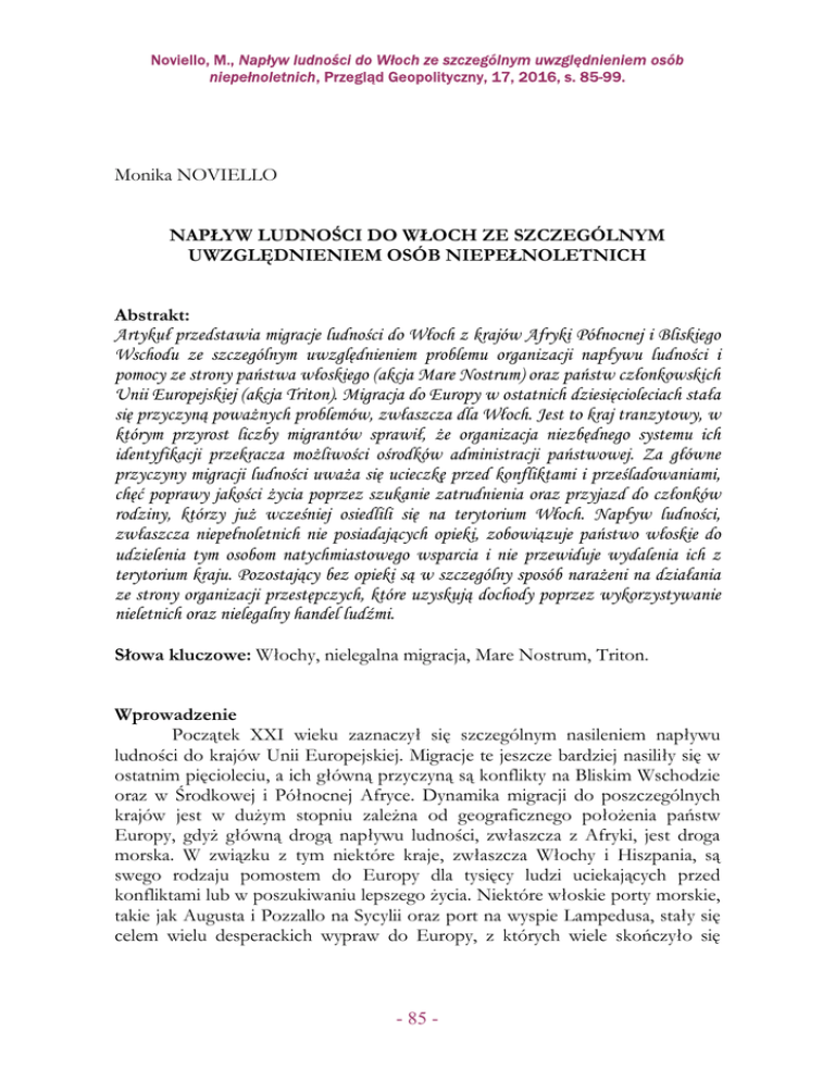 Noviello, M., Napływ ludności do Włoch ze szczególnym uwzględnieniem osób niepełnoletnich, Przegląd Geopolityczny, 17, 2016, s. 85-99. Monika NOVIELLO NAPŁYW LUDNOŚCI DO WŁOCH ZE SZCZEGÓLNYM UWZGLĘDNIENIEM OSÓB NIEPEŁNOLETNICH Abstrakt: Artykuł przedstawia migracje ludności do Włoch z krajów Afryki Północnej i Bliskiego Wschodu ze szczególnym uwzględnieniem problemu organizacji napływu ludności i pomocy ze strony państwa włoskiego (akcja Mare Nostrum) oraz państw członkowskich Unii Europejskiej (akcja Triton). Migracja do Europy w ostatnich dziesięcioleciach stała się przyczyną poważnych problemów, zwłaszcza dla Włoch. Jest to kraj tranzytowy, w którym przyrost liczby migrantów sprawił, że organizacja niezbędnego systemu ich identyfikacji przekracza możliwości ośrodków administracji państwowej. Za główne przyczyny migracji ludności uważa się ucieczkę przed konfliktami i prześladowaniami, chęć poprawy jakości życia poprzez szukanie zatrudnienia oraz przyjazd do członków rodziny, którzy już wcześniej osiedlili się na terytorium Włoch. Napływ ludności, zwłaszcza niepełnoletnich nie posiadających opieki, zobowiązuje państwo włoskie do udzielenia tym osobom natychmiastowego wsparcia i nie przewiduje wydalenia ich z terytorium kraju. Pozostający bez opieki są w szczególny sposób narażeni na działania ze strony organizacji przestępczych, które uzyskują dochody poprzez wykorzystywanie nieletnich oraz nielegalny handel ludźmi. Słowa kluczowe: Włochy, nielegalna migracja, Mare Nostrum, Triton. Wprowadzenie Początek XXI wieku zaznaczył się szczególnym nasileniem napływu ludności do krajów Unii Europejskiej. Migracje te jeszcze bardziej nasiliły się w ostatnim pięcioleciu, a ich główną przyczyną są konflikty na Bliskim Wschodzie oraz w Środkowej i Północnej Afryce. Dynamika migracji do poszczególnych krajów jest w dużym stopniu zależna od geograficznego położenia państw Europy, gdyż główną drogą napływu ludności, zwłaszcza z Afryki, jest droga morska. W związku z tym niektóre kraje, zwłaszcza Włochy i Hiszpania, są swego rodzaju pomostem do Europy dla tysięcy ludzi uciekających przed konfliktami lub w poszukiwaniu lepszego życia. Niektóre włoskie porty morskie, takie jak Augusta i Pozzallo na Sycylii oraz port na wyspie Lampedusa, stały się celem wielu desperackich wypraw do Europy, z których wiele skończyło się - 85 - Noviello, M., Napływ ludności do Włoch ze szczególnym uwzględnieniem osób niepełnoletnich, Przegląd Geopolityczny, 17, 2016, s. 85-99. tragicznie w wyniku zatonięcia słabych jednostek pływających wykorzystanych do międzykontynentalnych przepraw. Celem artykułu jest przedstawienie dynamiki imigracji do Włoch, z uwzględnieniem ostatnich lat, kiedy to napływ imigrantów stał się jednym z największych problemów tego kraju. Szczególną uwagę zwrócono na status imigranta, jego wiek i pochodzenie. Poddano analizie zarówno imigracje legalne jak i nielegalne. Poruszono kwestie organizacyjne napływu ludności, akcję Mare Nostrum, której kontynuacją jest akcja Triton oraz zwrócono uwagę na rozlokowanie ludności w centrach imigracyjnych na terenie Włoch. Przedstawiono także sposób funkcjonowania tych instytucji oraz ich podstawowe zadania. Innym istotnym celem artykułu jest przedstawienie powodów uzyskania przez imigrantów obywatelstwa lub, kiedy okazało się to niemożliwe - pozwolenia na pobyt. Jest to szczególnie ważne, gdyż łatwość uzyskania tych dokumentów stymuluje kolejne napływy ludności. Powołując się na dane Organizacji Save the Children przybliżono również problematykę rosnącej nielegalnej imigracji niepełnoletnich oraz walkę z tym zjawiskiem. Dynamika imigracji do Włoch w latach 2012-2016 Włochy nie zawsze były krajem przyjmującym imigrantów. Zaraz po zjednoczeniu państwa w 1861 roku, kiedy to połączono istniejące na Półwyspie Apenińskim królestwa i księstwa w jeden organizm nazwany Italią, odnotowano znaczący wzrost emigracji, zwłaszcza z obszarów byłego Królestwa Obojga Sycylii (Guerri 2014; Noviello 2015). Również lata pięćdziesiąte ubiegłego wieku zaznaczyły się w historii Włoch jako okres nasilającej się emigracji zwłaszcza do Niemiec, Szwajcarii i Francji (Bettini 2014,str 6; Lopreno 2015). Związane było to z powstaniem republiki i niezadowoleniem ludności zwłaszcza południowej części kraju z przyjętego ustroju państwa. Włochy są krajem, gdzie problemy migracyjne szczególnie zaznaczają się w historii. Również obecnie odnotowuje się dwa podstawowe rodzaje migracji. Włosi emigrują na północ kontynentu, głównie do Niemiec, Wielkiej Brytanii i Szwajcarii w poszukiwaniu pracy lub w celu kontynuacji nauki na renomowanych uczelniach europejskich (Pugliese 2015, s. 29-30). W tym samym czasie na teren Włoch napływa ludność z północnych wybrzeży Afryki i z Bliskiego Wschodu. Napływ imigrantów w ostatnich latach rośnie z roku na rok, a wśród przybywających przeważają głównie osoby pomiędzy 25 a 45 rokiem życia. Stanowią oni siłę roboczą kraju zwłaszcza w sektorze rolnictwa i przemysłu. Osoby te uzyskały możliwość meldunku na terenie Włoch (wł. residenza), co oznacza, iż posiadają umowę o pracę, albo uzyskały pozwolenie na pobyt i zameldowanie dzięki obecności innych członków ich rodziny na terenie Włoch, którzy takie prawo uzyskali wcześniej. Przyrost liczby imigrantów we Włoszech sprawia, iż coraz trudniej jest im uzyskać zatrudnienie. Według oficjalnych statystyk od 2012 roku przybyło ich o 1/4, z około 4,1 mln do przeszło 5 mln w roku 2015. Jest to fakt - 86 - Noviello, M., Napływ ludności do Włoch ze szczególnym uwzględnieniem osób niepełnoletnich, Przegląd Geopolityczny, 17, 2016, s. 85-99. niepokojący z gospodarczego punktu widzenia, gdyż Włochy nie będą w stanie pokryć rosnąc